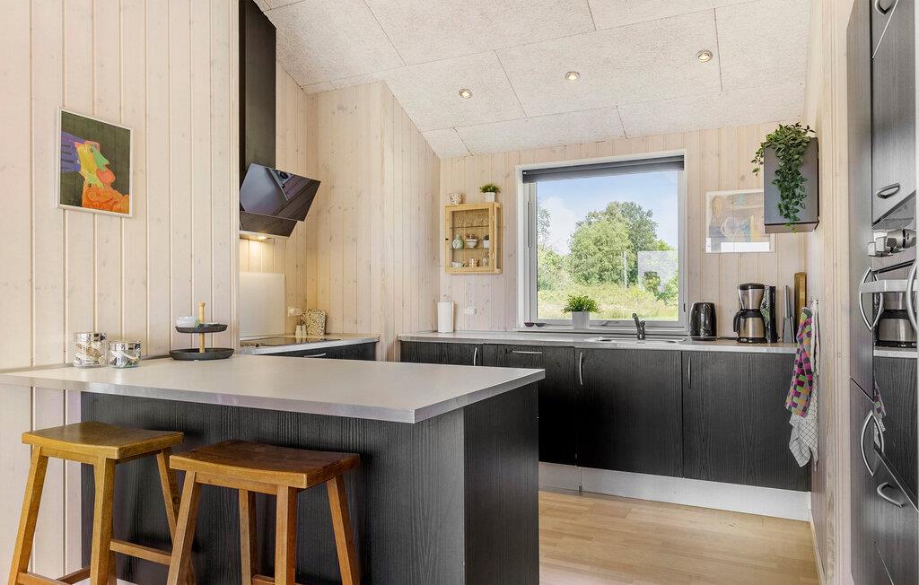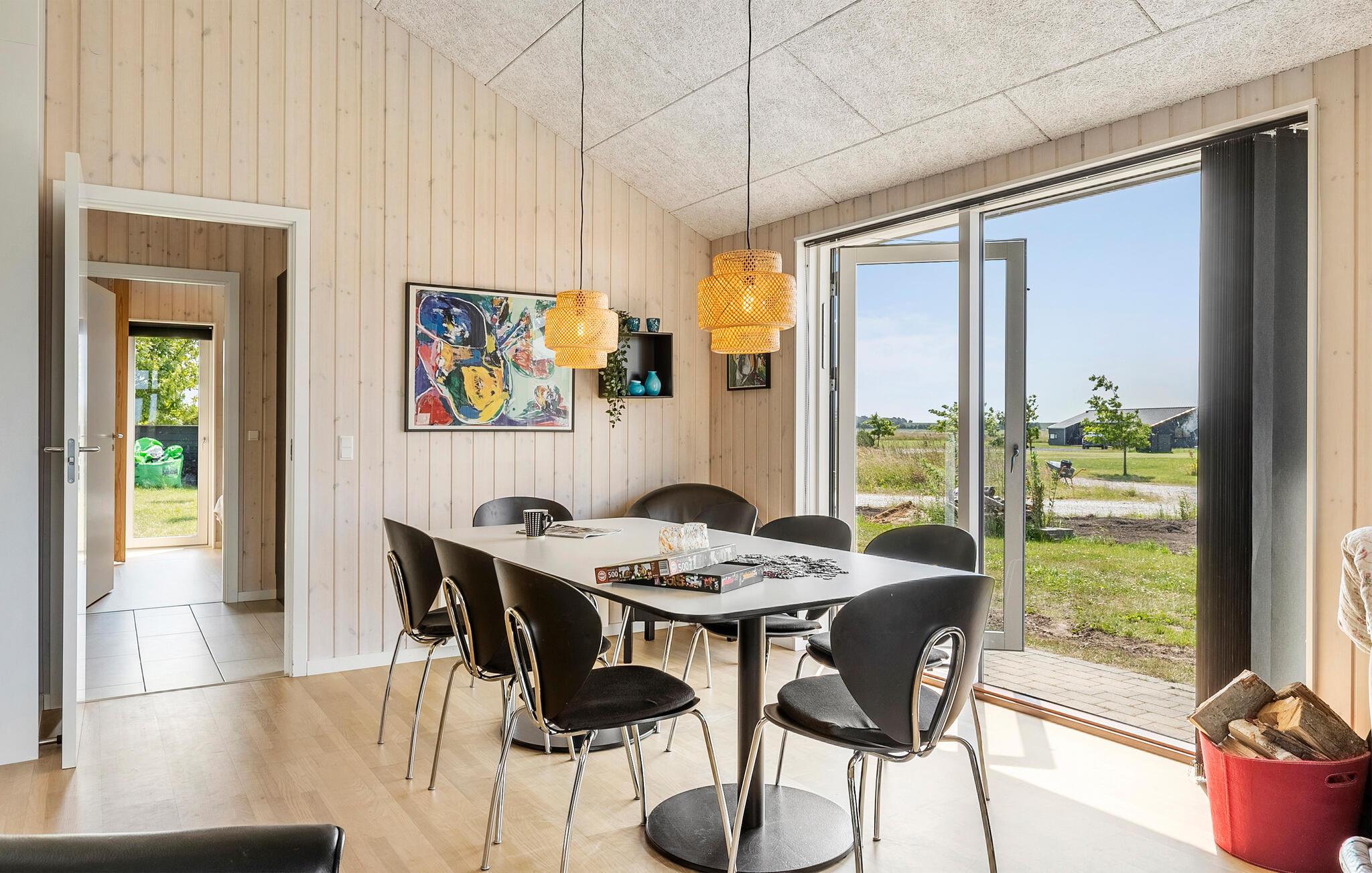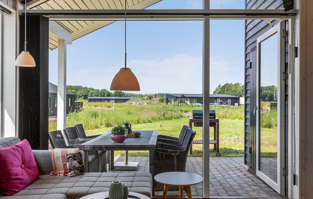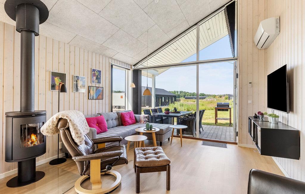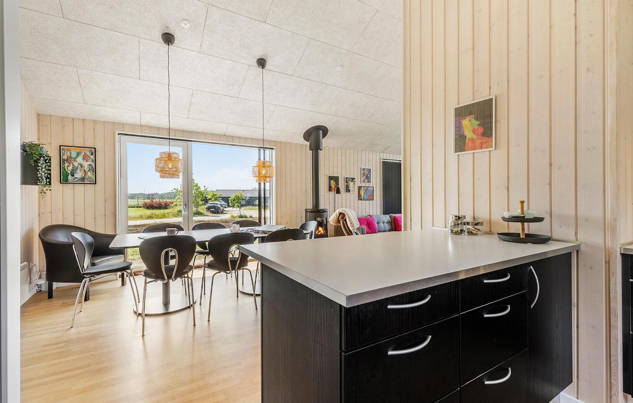 Tilbring en afslappende ferie i dette moderne designede feriehus. Slap af i den lyse opholdsstue med panoramavinduer og udsigt over det omkringliggende landskab. Gør det behageligt foran brændeovnen, læs en bog eller nyd en film på det store tv. Det åbne spise- og køkkenområde er moderne og funktionelt indrettet med generøs arbejdsplads og barstole til korte pauser. Nyd måltiderne ved det store spisebord og planlæg den næste dag sammen.
