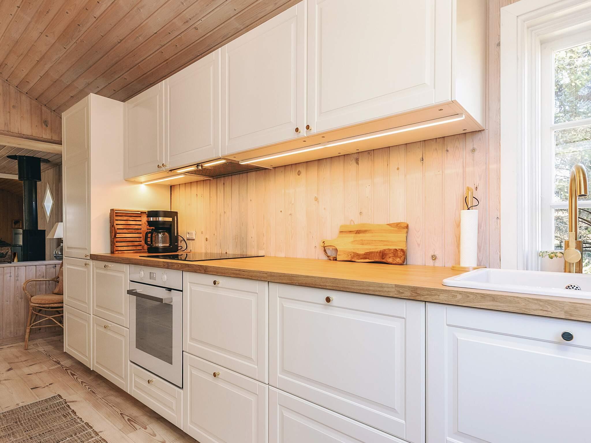 Det fuldt udstyrede køkken indeholder elektrisk komfur, køleskab og kaffemaskine, så det er nemt at tilberede måltider under opholdet. Badeværelset har WC, håndvask og håndbruser, som giver alle nødvendige faciliteter for en bekvem ferie. Elektrisk opvarmning sikrer varme i de køligere måneder, og ferieboligen er smagfuldt møbleret, så den føles hjemlig.