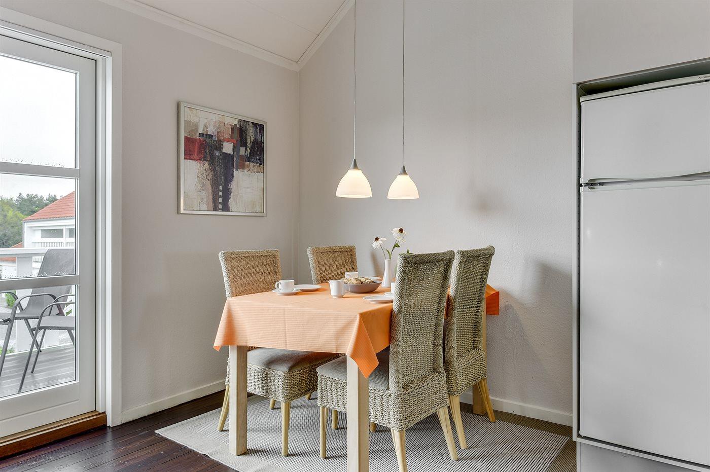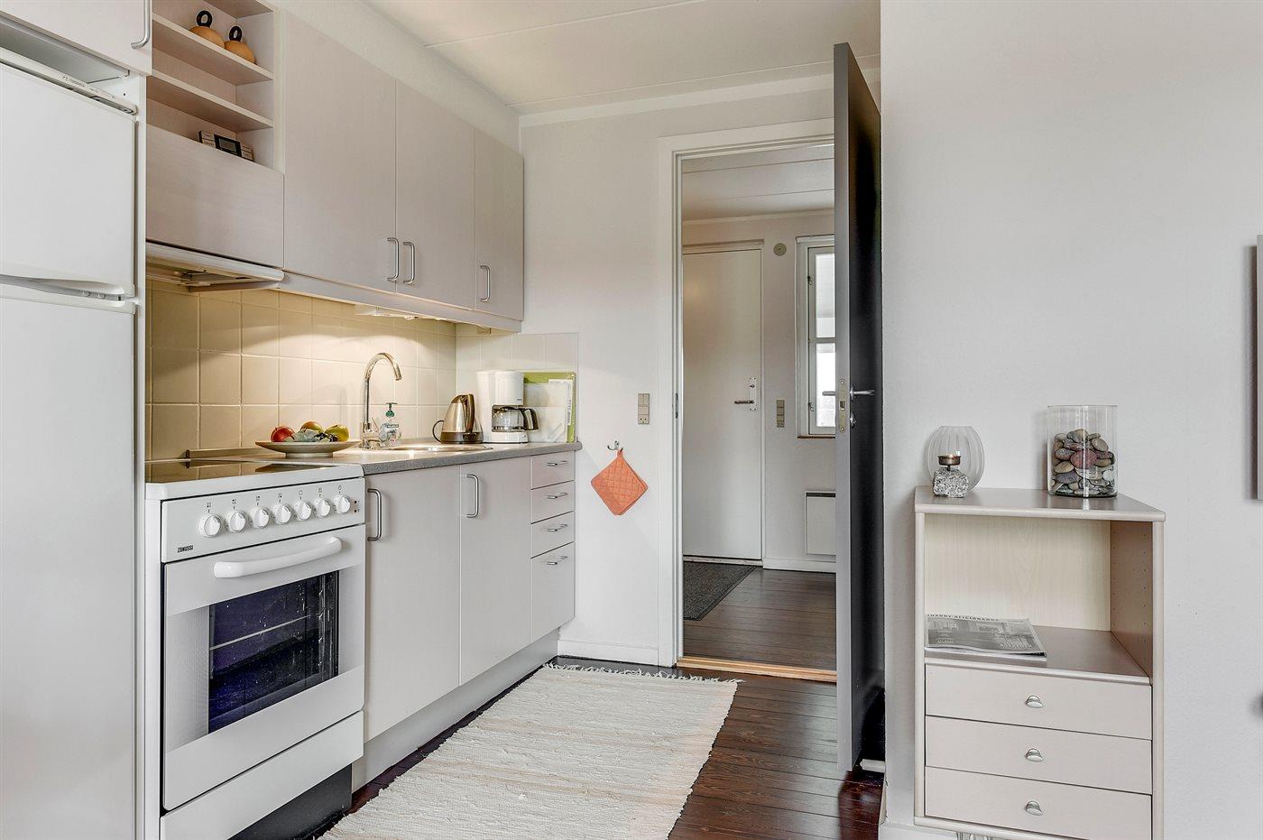 Køkkenet er udstyret med 1 køleskab. Der er 4 keramiske kogeplader, bageovn.