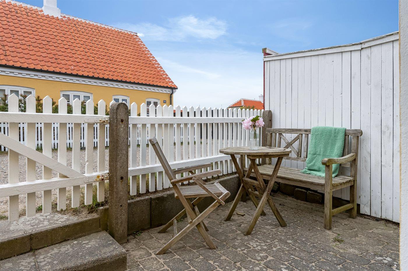 Hyggelig lille ferielejlighed i anneksbygning beliggende centralt i Gl. Skagen tæt på solnedgangspladsen, stranden og alle de kendte steder.