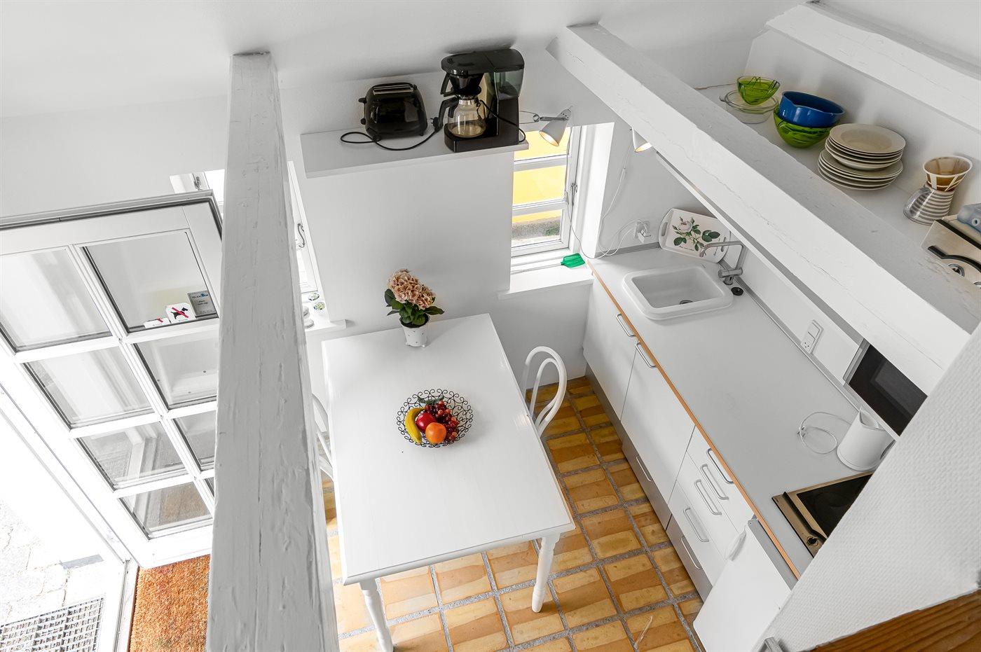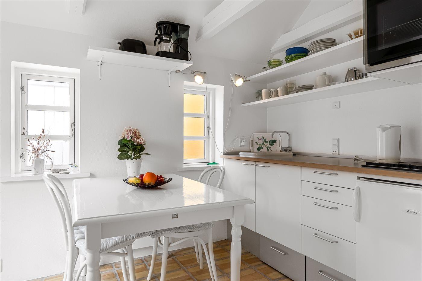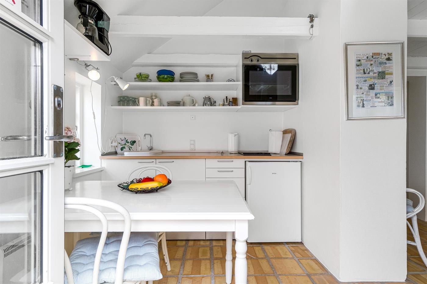 Køkkenet er udstyret med 1 køleskab. Der er 4 keramiske kogeplader, varmluftovn.