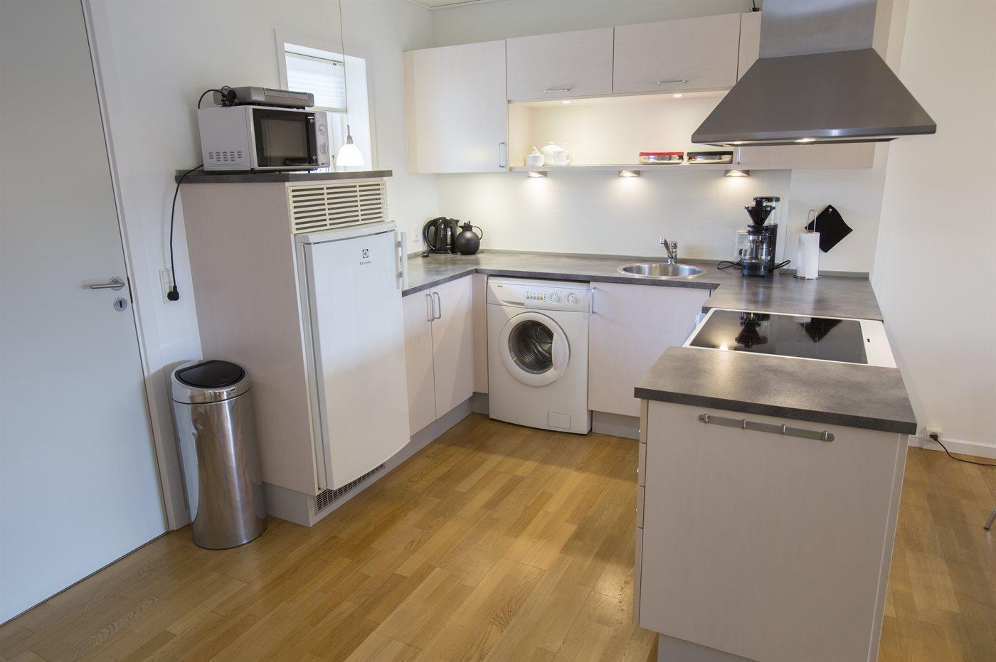 Køkkenet er udstyret med 1 køleskab. Der er 4 keramiske kogeplader, varmluftovn samt opvaskemaskine.