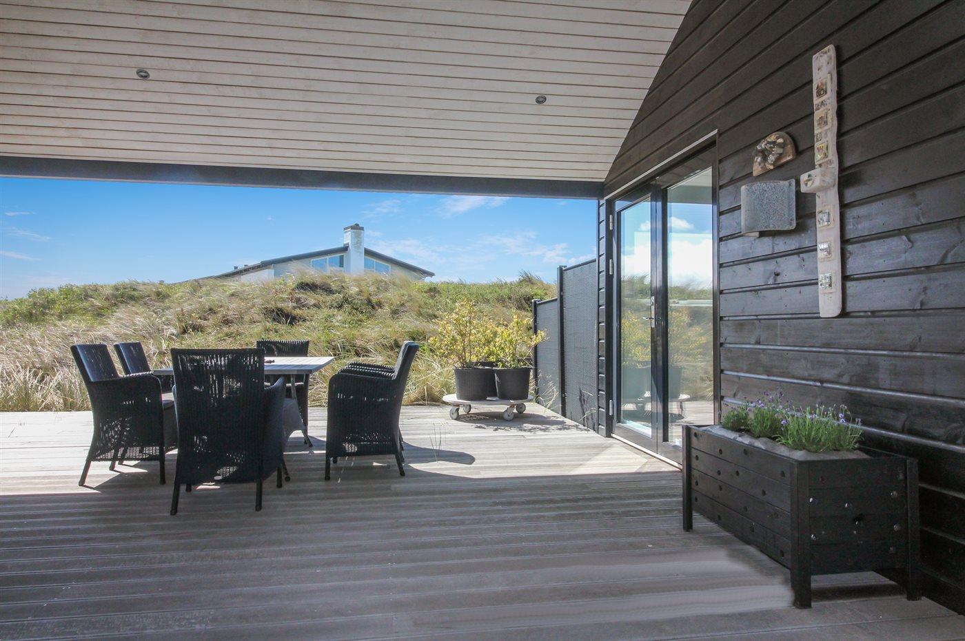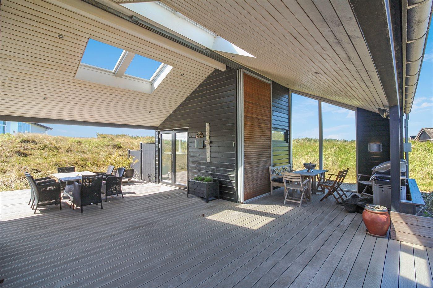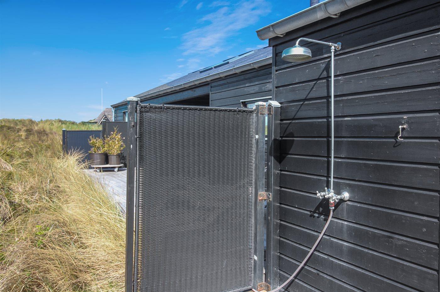 Ferieboligen er beliggende på en 1200 m² stor naturgrund. Der er 150 m til havet. Nærmeste forretning er beliggende i en afstand af 700 m. Til ferieboligen hører åbent terrasseareal. Desuden er der overdækket terrasse. Udendørs bruser. Grill til rådighed. Der er installeret stik til opladning af elbil (ladekabel forefindes). Parkering ved ferieboligen.