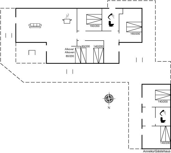 Der er i alt 5 soveværelser. Sovepladserne fordeler sig på: 10 sovepladser i dobbeltsenge.1 soveplads i køjeseng. 1 soveplads i alkove. 4 af disse sovepladser befinder sig i et anneks og 1 af dem befinder sig i opholdsstuen.