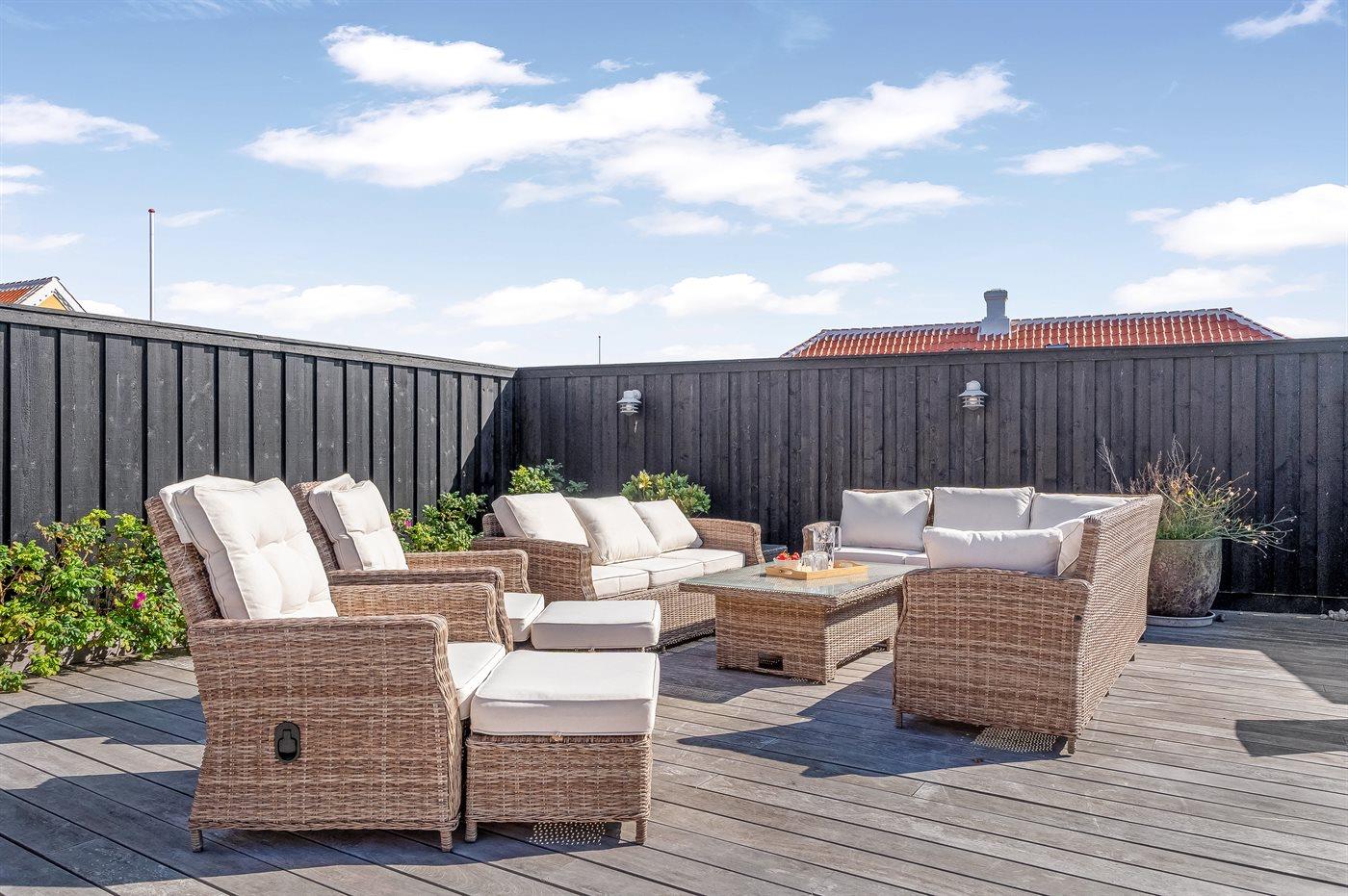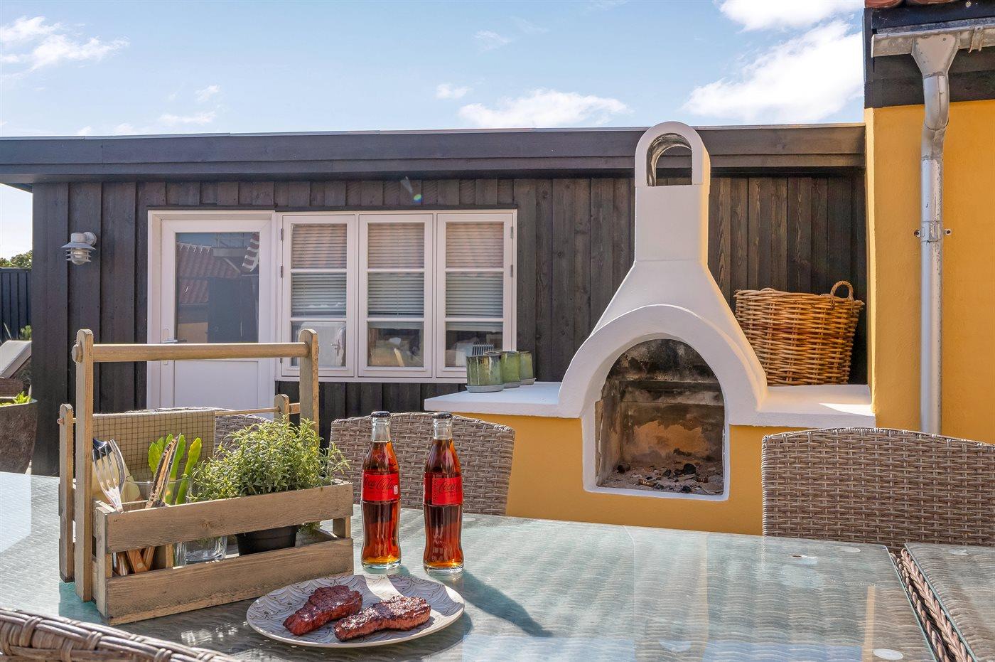 Der hører en stor, afskærmet sydvendt terrasse til huset, der giver plads til både stille stunder med morgenkaffen og hyggelige grillaftener under åben himmel. Terrassen er helt uforstyrret, hvilket skaber en privat atmosfære, hvor man kan nyde solen dagen lang.