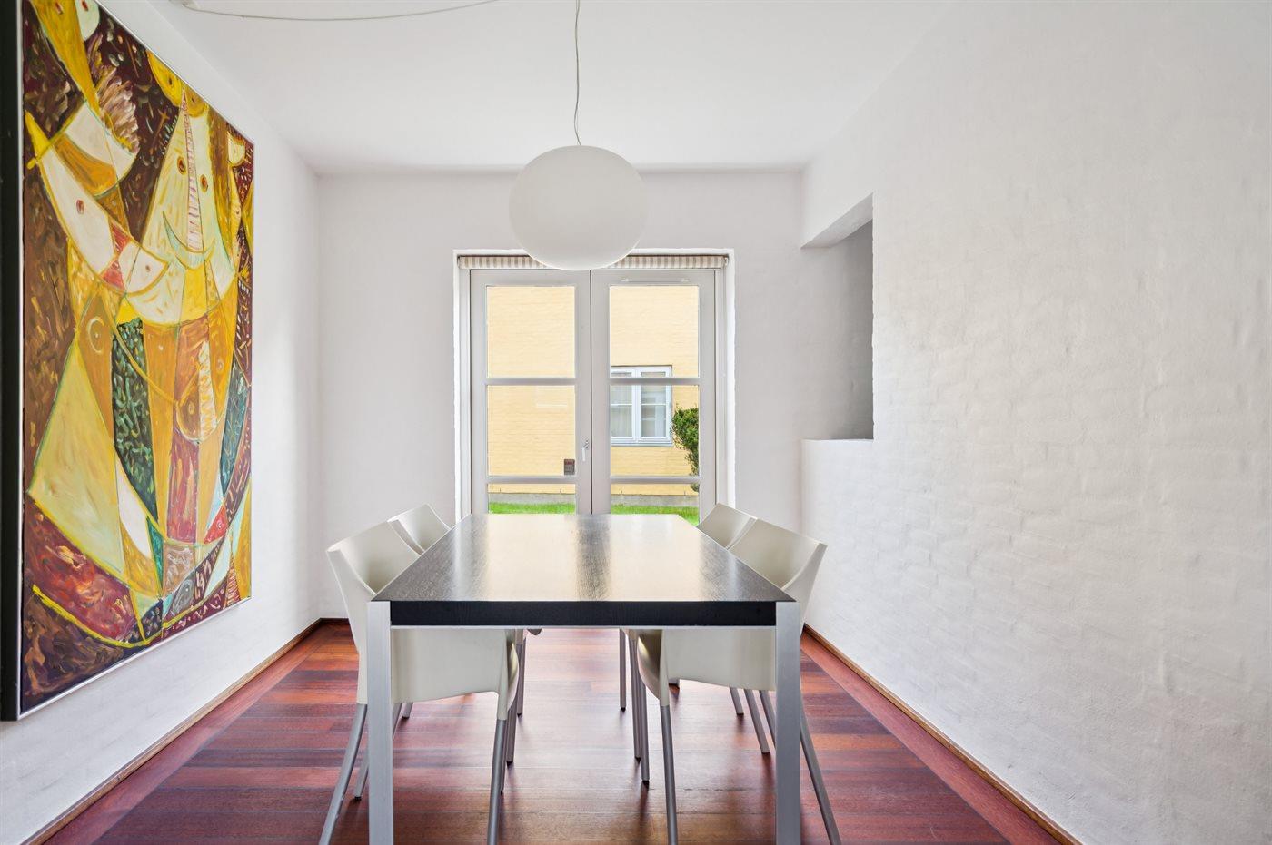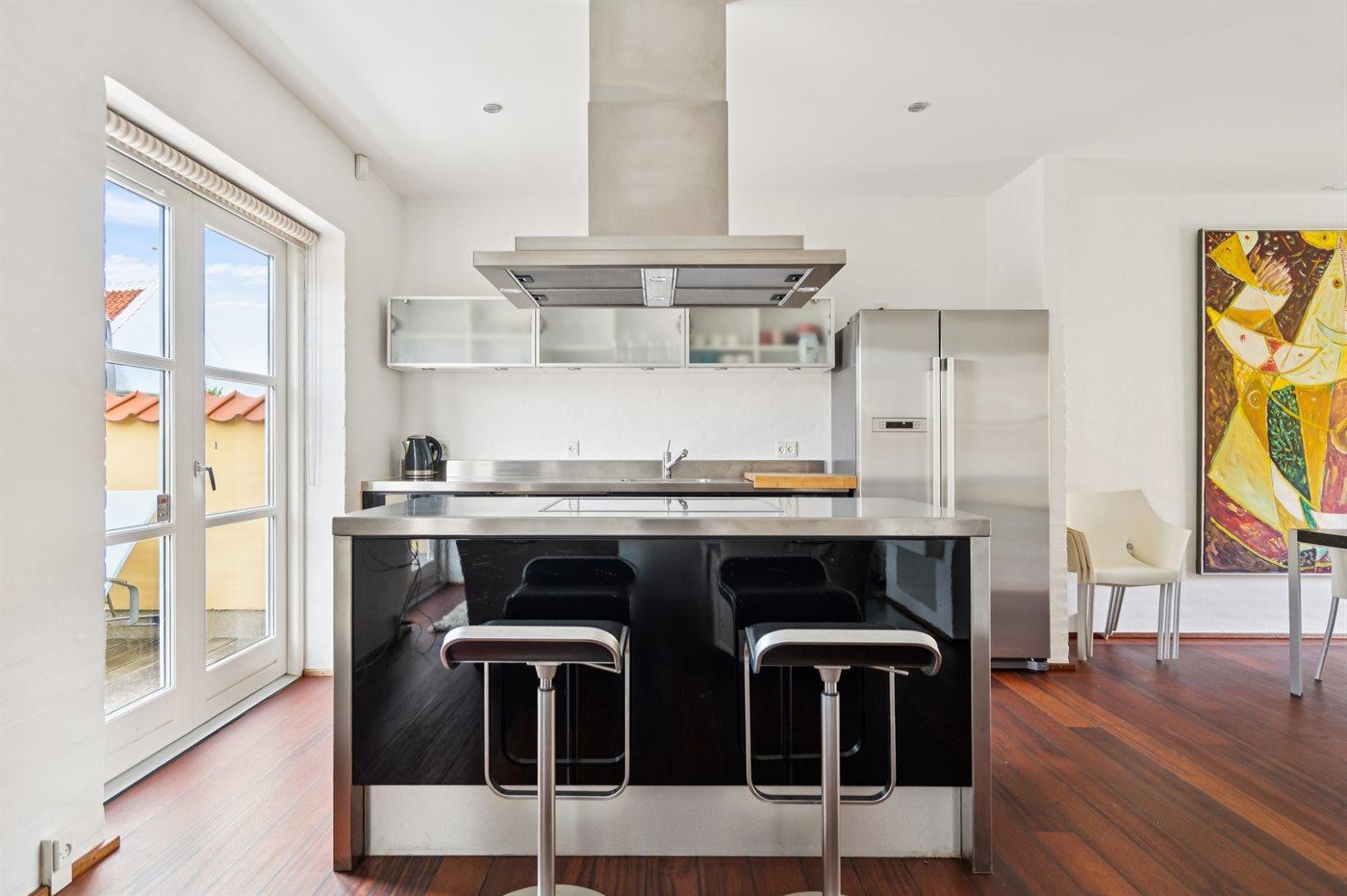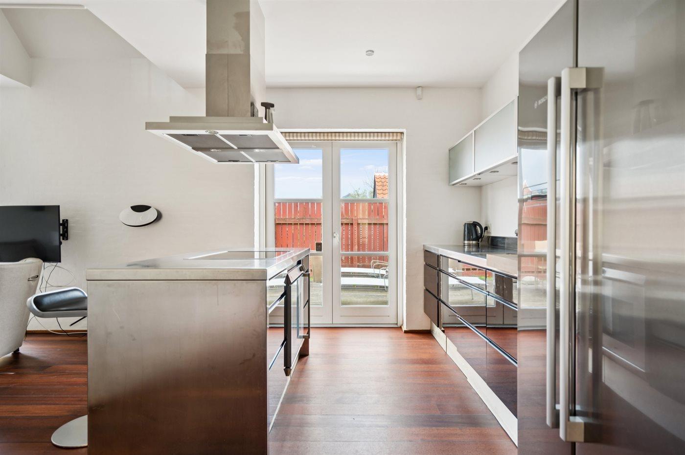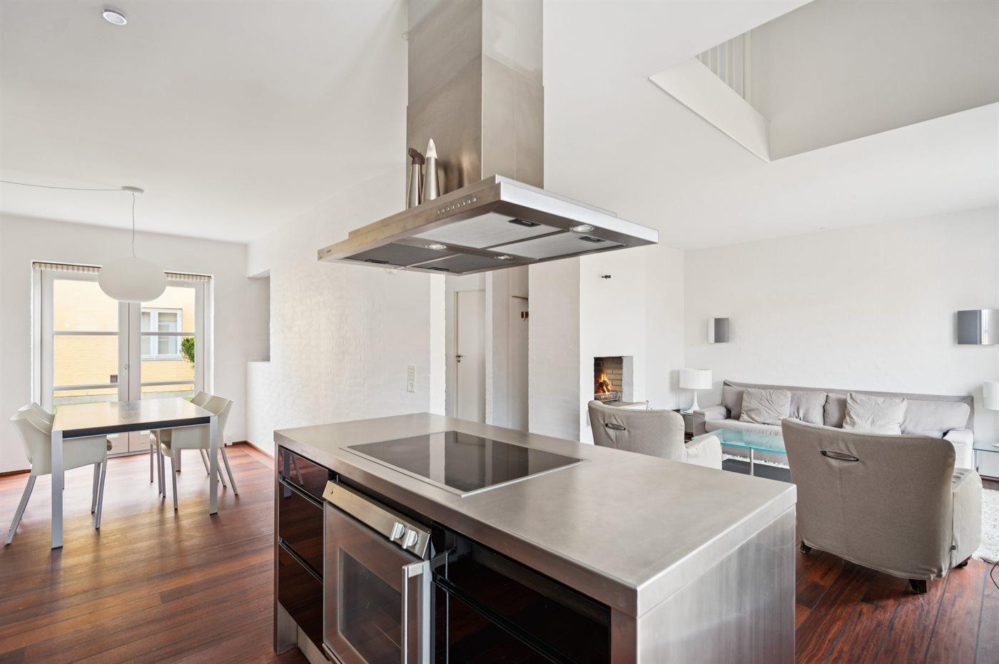 Køkkenet er udstyret med 1 køleskab. Der er 4 induktionskogeplader, varmluftovn samt opvaskemaskine.