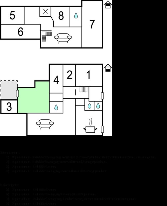 Ferie bolig til 30 personer. 1 sal, 2 værelser med dobbeltsenge. Et værelse med dobbeltseng og enkelt sovesofa. Et værelse med 2 dobbeltsenge, og 1 enkeltseng. Stue etagen, 1 værelse med dobbeltseng. 2 værelser med dobbeltseng og dobbelt sovesofa. Et familie rum med 8 sovepladser, 3 dobbeltsenge og hems. Der er 3 badeværelser. Der er anretter køkken og stort festlokale hvor der kan dækkes op til 30 personer. Der er 5000 m2 indhegnet grund/have med legeplads og bålhytte.