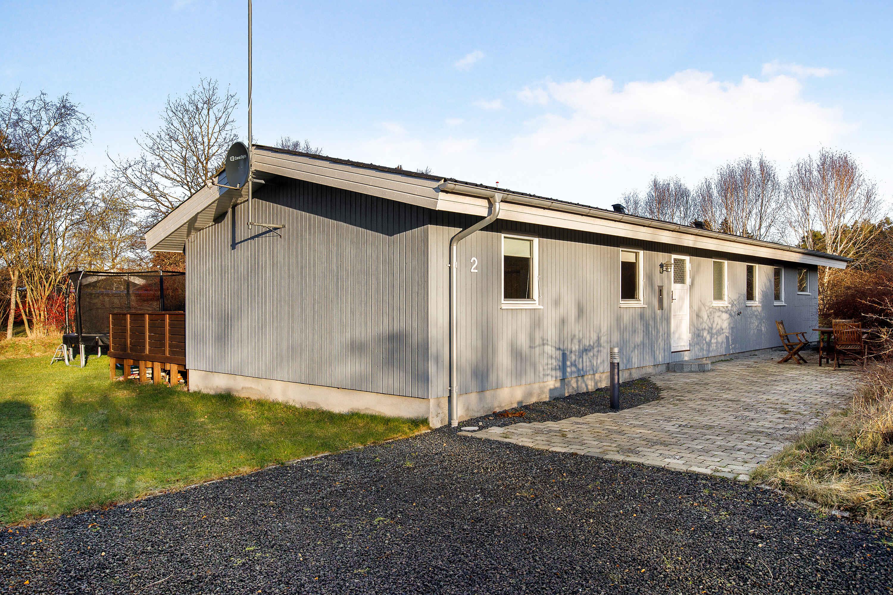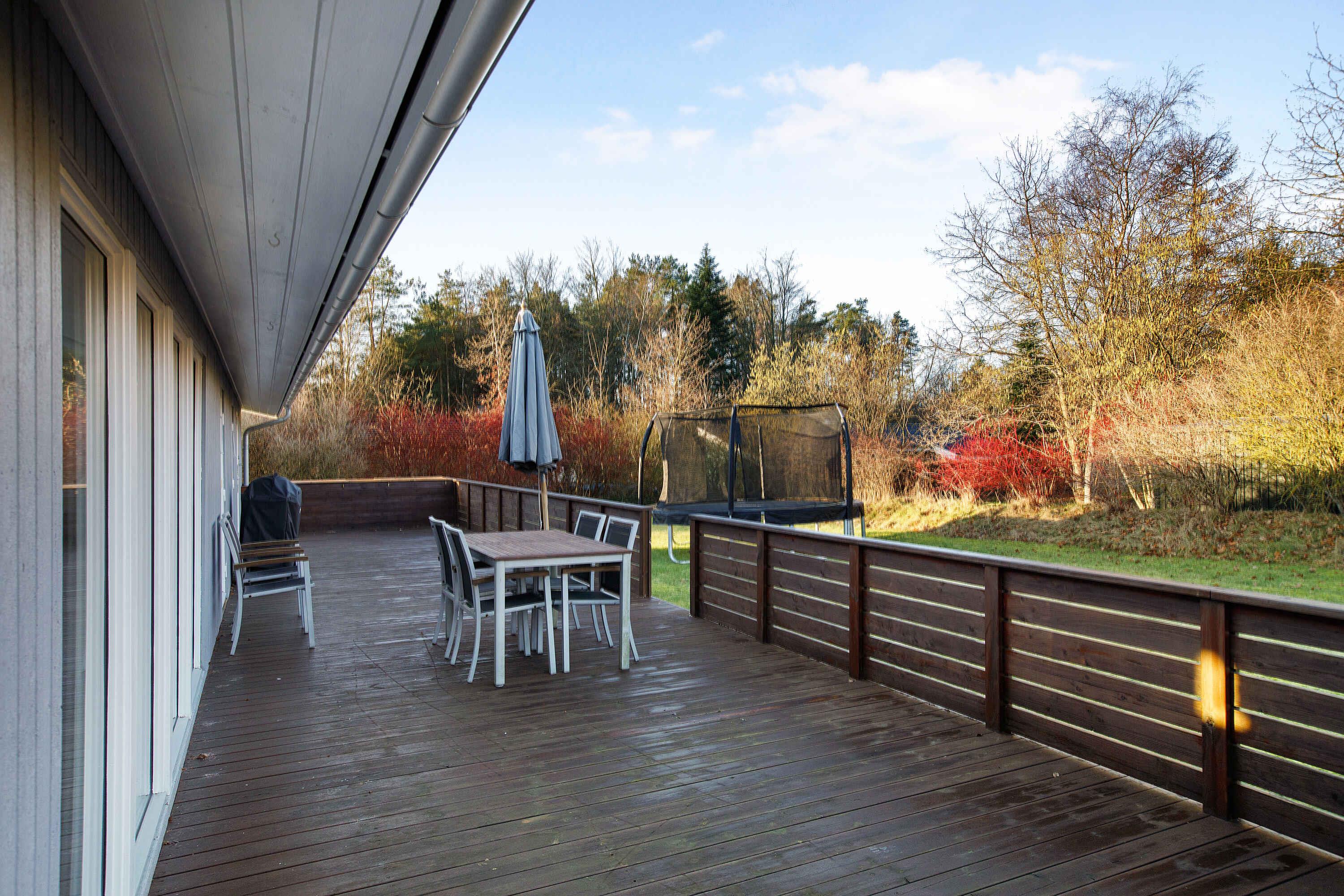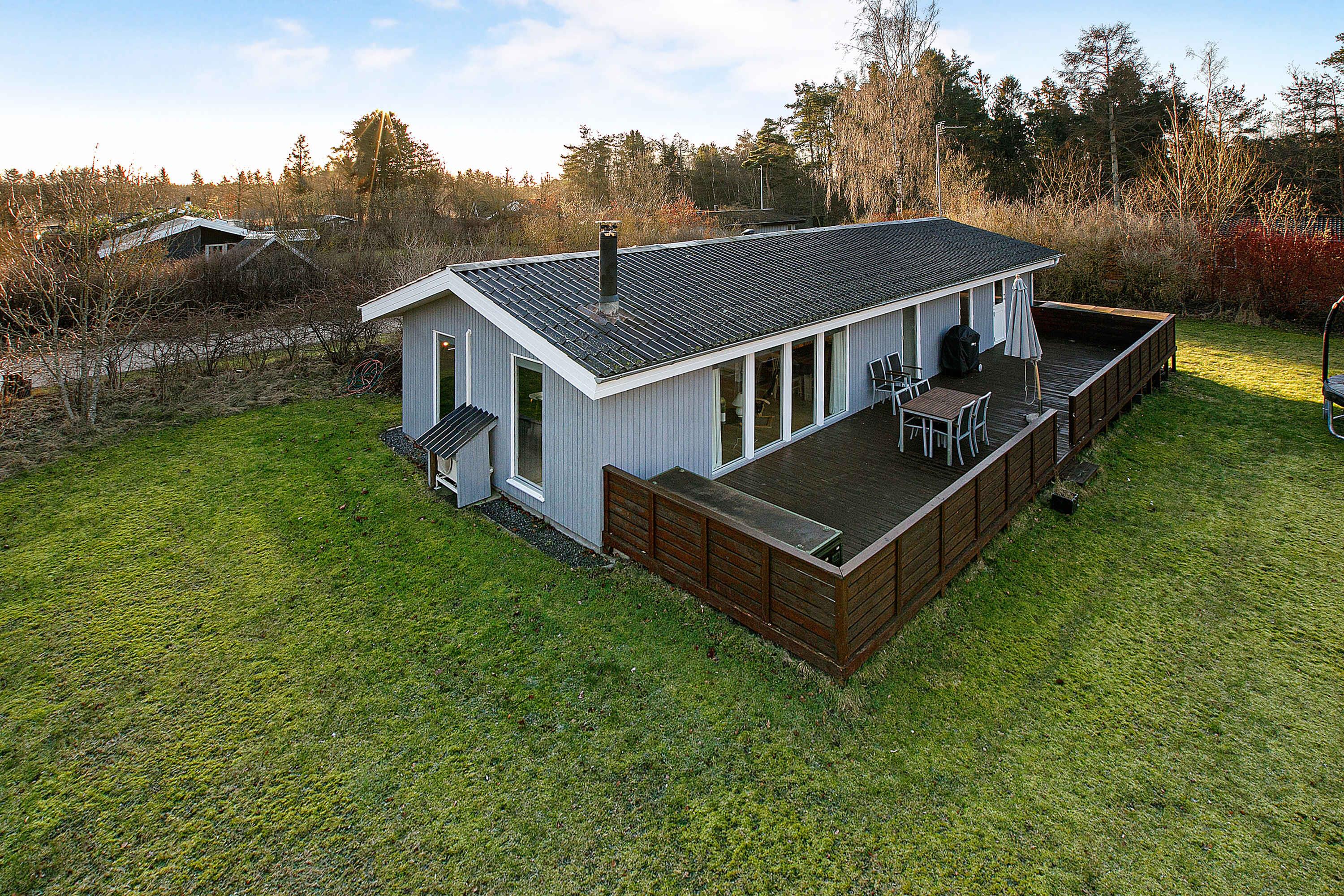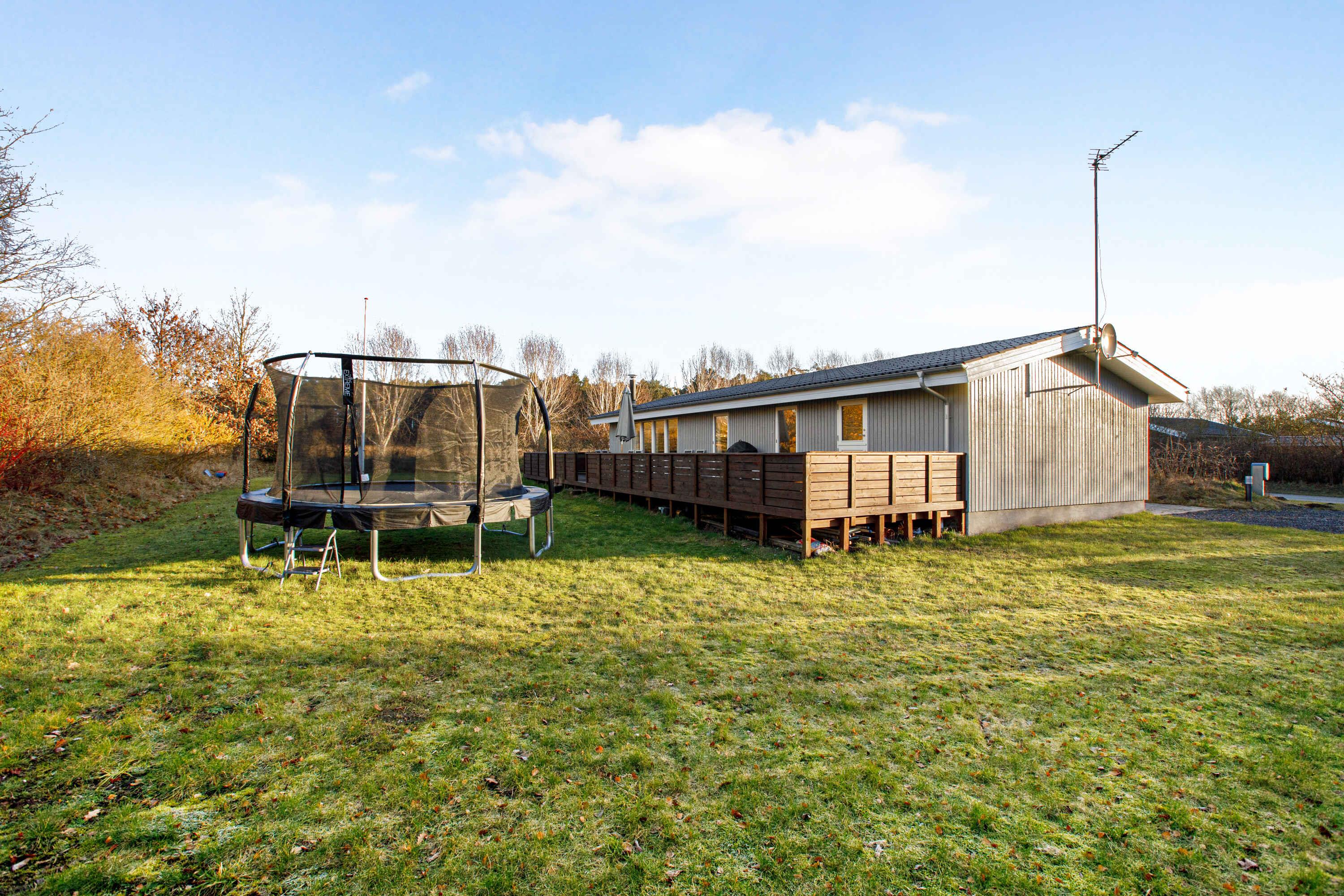 Hyggeligt træsommerhus med stor terrasse og trampolin