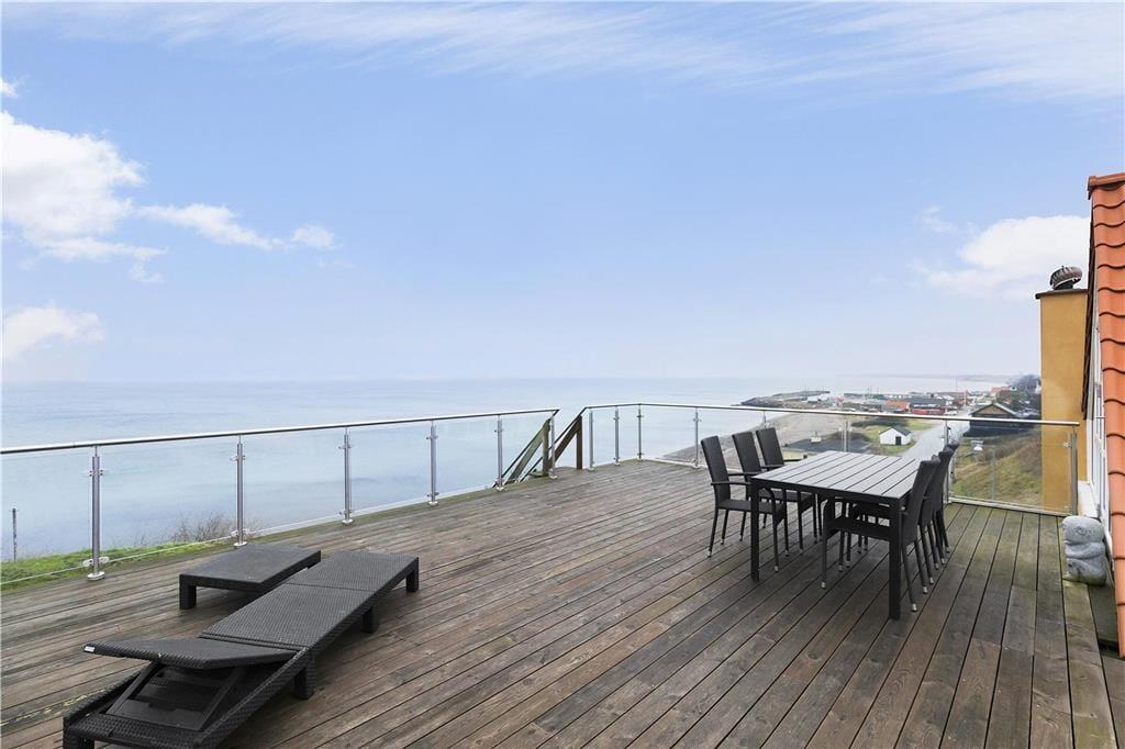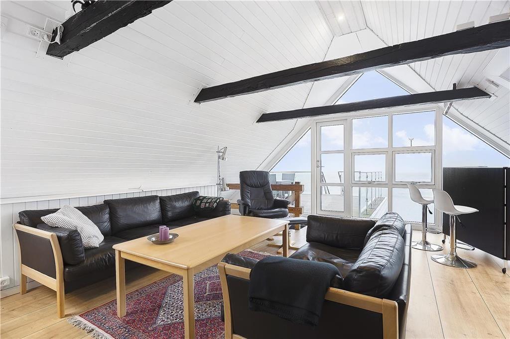 Den højt beliggende feriebolig i to plan på Odden Havn har direkte panoramaudsigt over havnen og Kattegat og rummer alt, hvad du kan drømme om. Da der er trapper i huset, kan vi ikke anbefale det hvis du er dårligt gående. Hvis nogen vil spille kort og andre bare hygge med en bog, er der her rig mulighed for at fordele sig flere steder i huset. I kan samles i den hyggelige stue og dele dagens oplevelser foran brændeovnen, eller nyde udsigten fra stuen eller terrassen, mens der mixes drinks i baren.