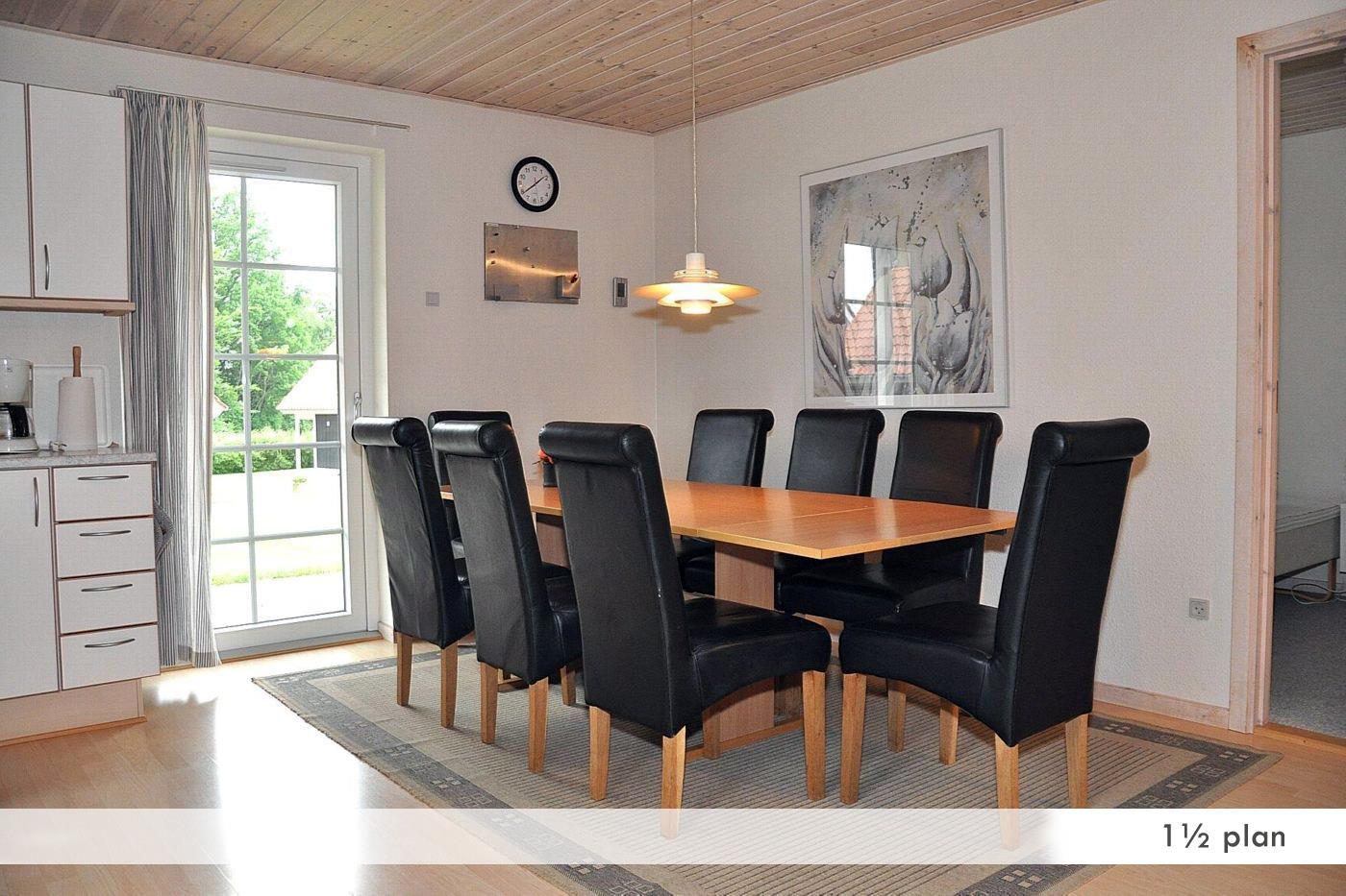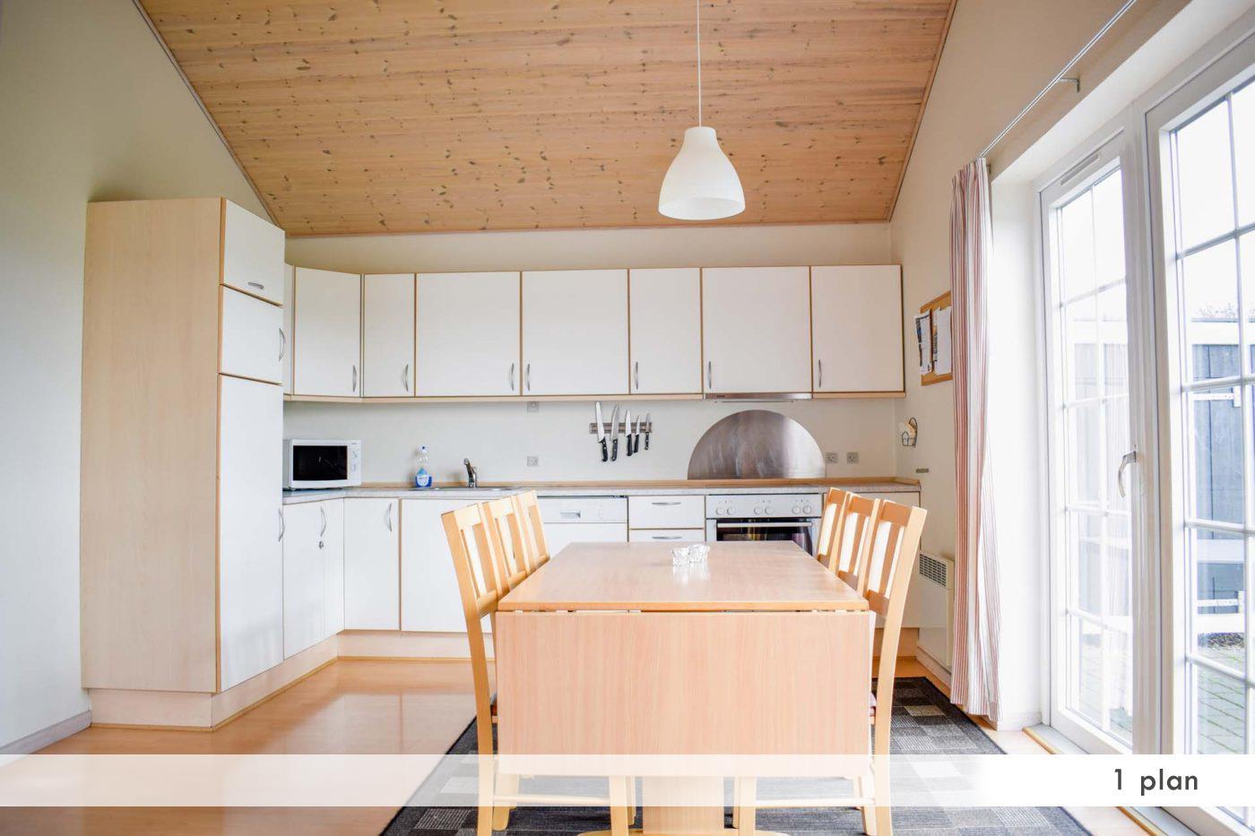 Åbent køkken med spiseplads, el-komfur, ovn, køleskab med frostboks, microovn, emhætte, kaffemaskine, opvaskemaskine.