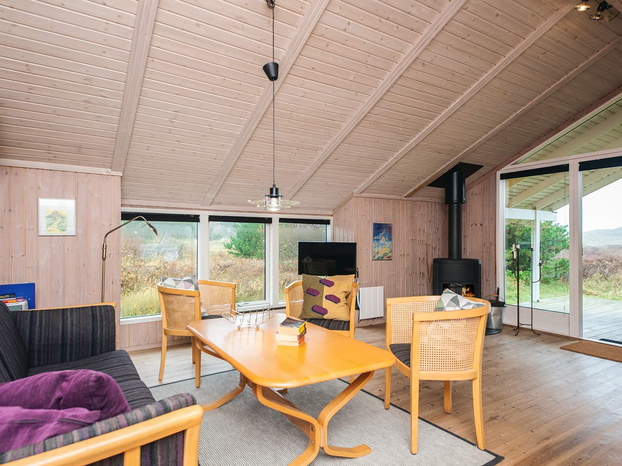 Ved en af Jyllands bedste strande ligger dette sommerhus, der er holdt i lyse farver. I stuen er brændeovnen det naturlige samlingspunkt, ligesom det åbne køkken indbyder til at madlavning er noget, som man er fælles om. Huset rummer bl.a. en sauna og spabad og er beliggende på en lyngklædt naturgrund. Der er 2 barnesenge. Huset har 2 overdækkede og 2 åbne terrasser. Oplev den flotte udsigt over klitterne og solnedgangen fra den vestvendte, overdækkede terrasse. Havemøbler forefindes. Fra huset er der ca. 600 m til sø, hvor der kan fiskes (HUSK fiskekort, hvis det kræves). Kort afstand til Vejers Strand, hvor det er tilladt at køre bil på en del af stranden. Udlejes ikke til ungdomsgrupper.