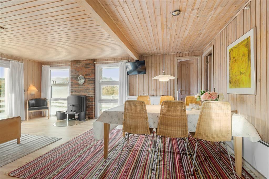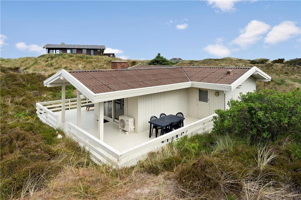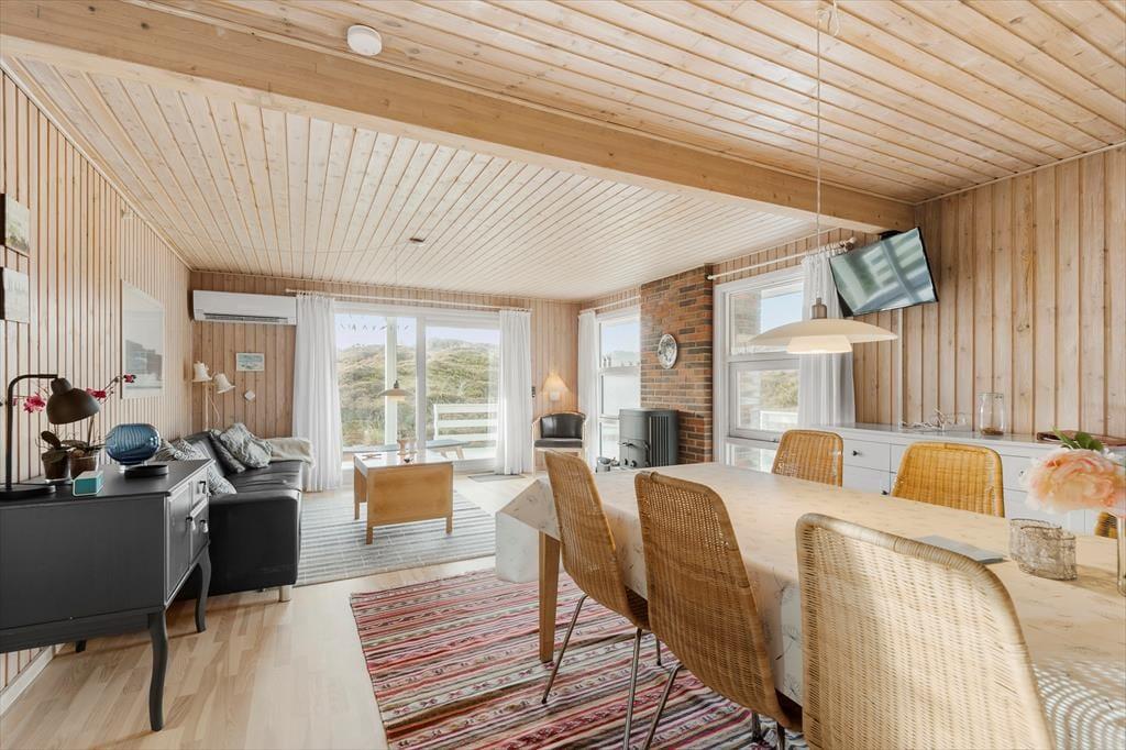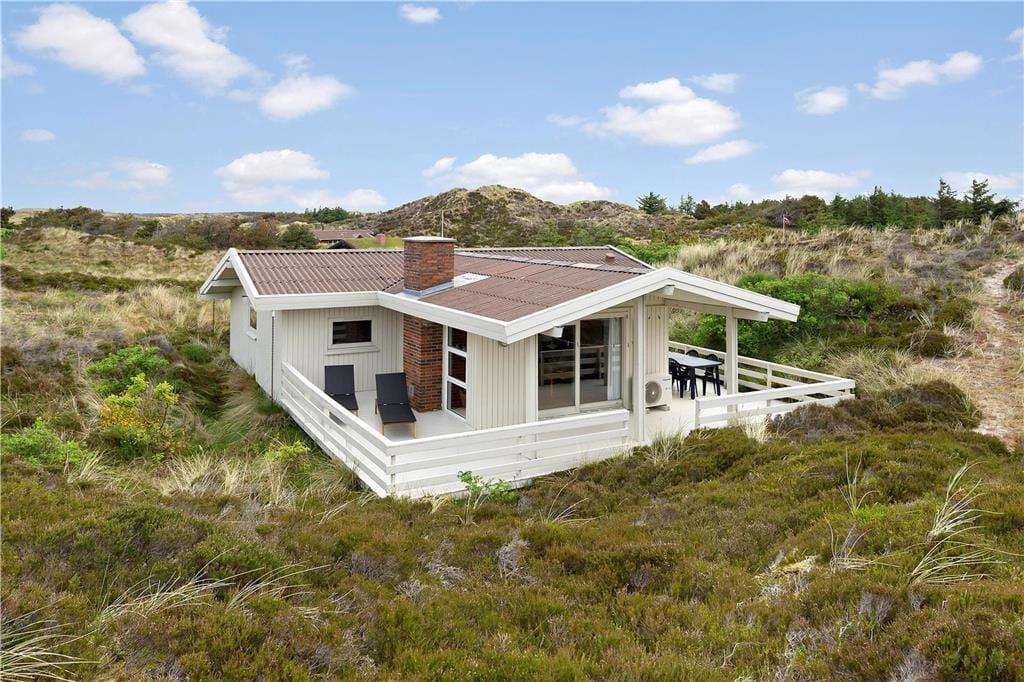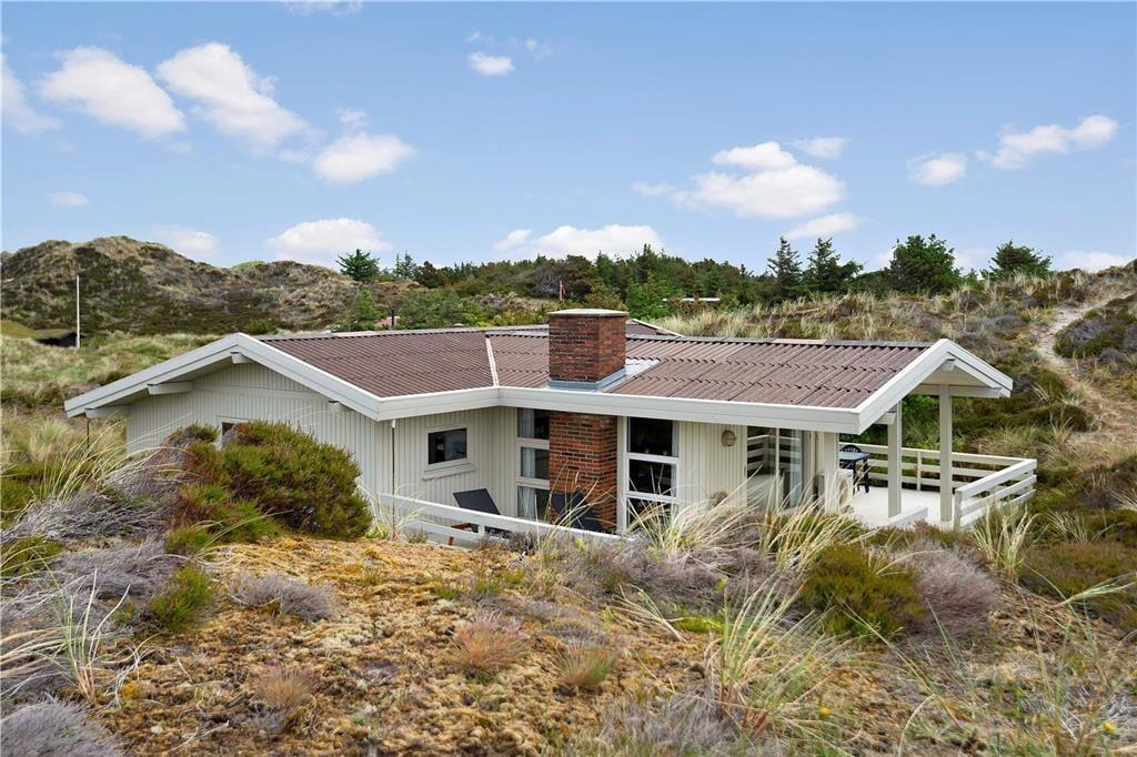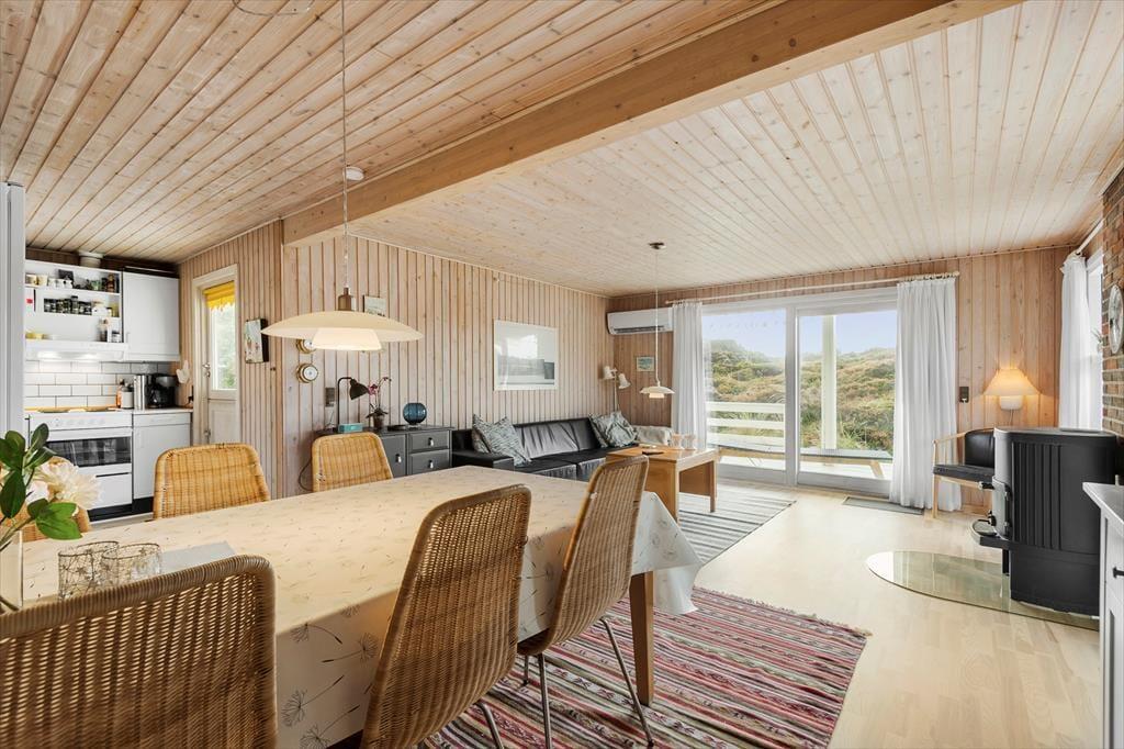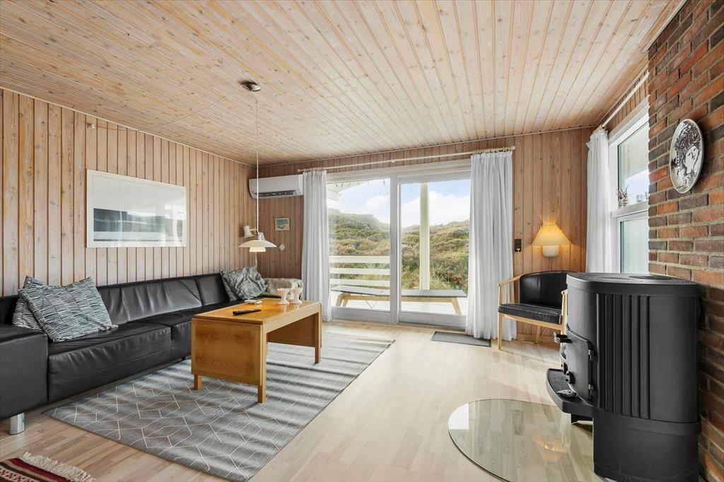 Med så smukke naturomgivelser har I et perfekt udgangspunkt for at komme ned i tempo og nyde feriedagene i ro og mag. Man kan i hvert fald hurtigt føle sig fristet til at lade tankerne vandre, når man læner sig tilbage og skuer ud over det kuperede klitlandskab – og takket være husets store vinduespartier er I stadig i kontakt med naturen, selvom den står på indendørs hygge. Afslapningsstunderne kan oplagt foregå i stuen, der er hyggeligt indrettet med brændeovn nær sofaen, spisebord og åben forbindelse til et veludstyret køkken. Et pænt badeværelse med bruseniche og vaskemaskine hører også med til planløsningen foruden tre soveværelser, der i alt kan huse fem feriegæster.