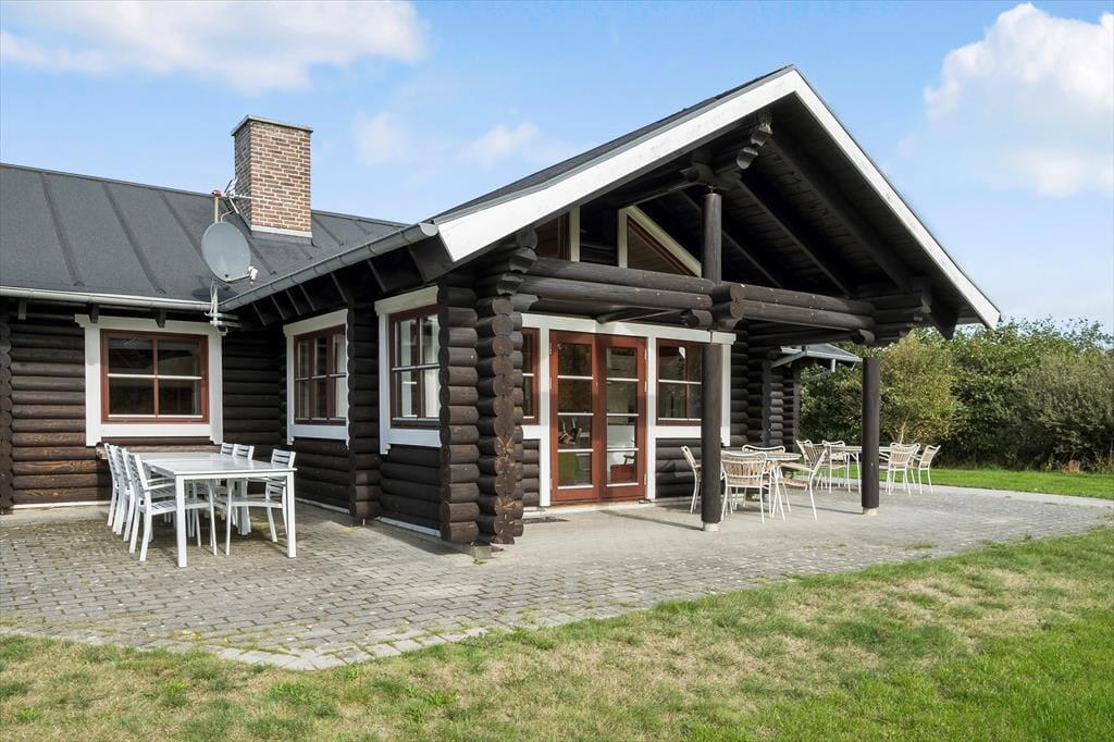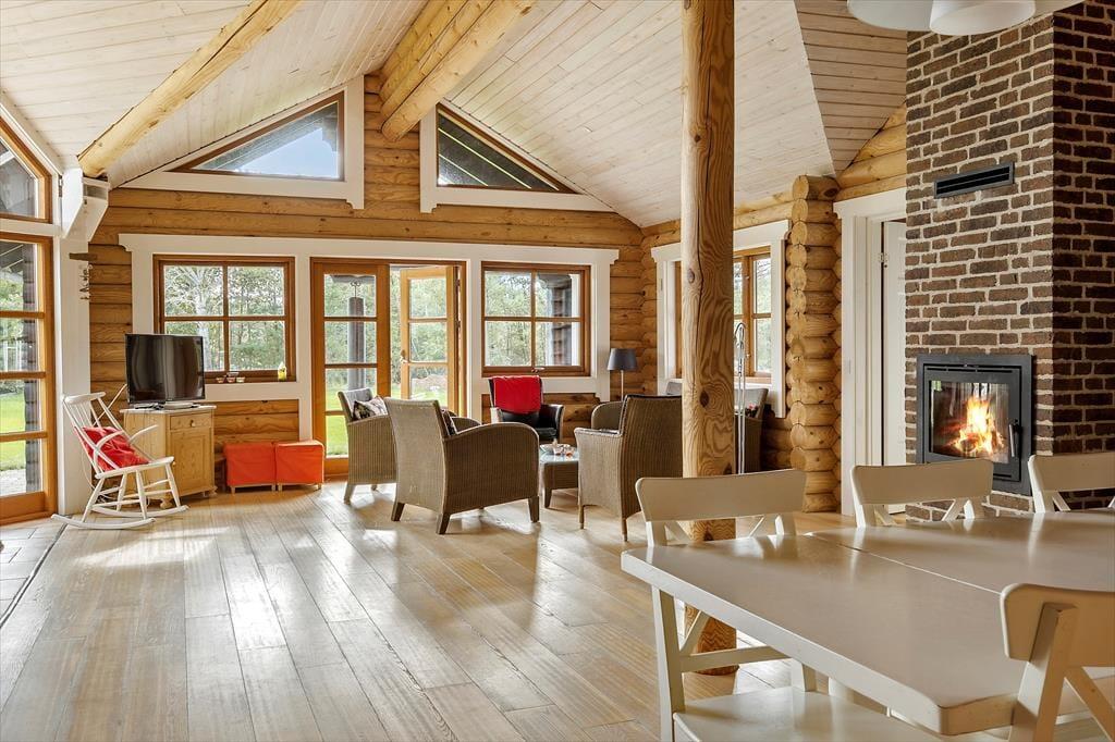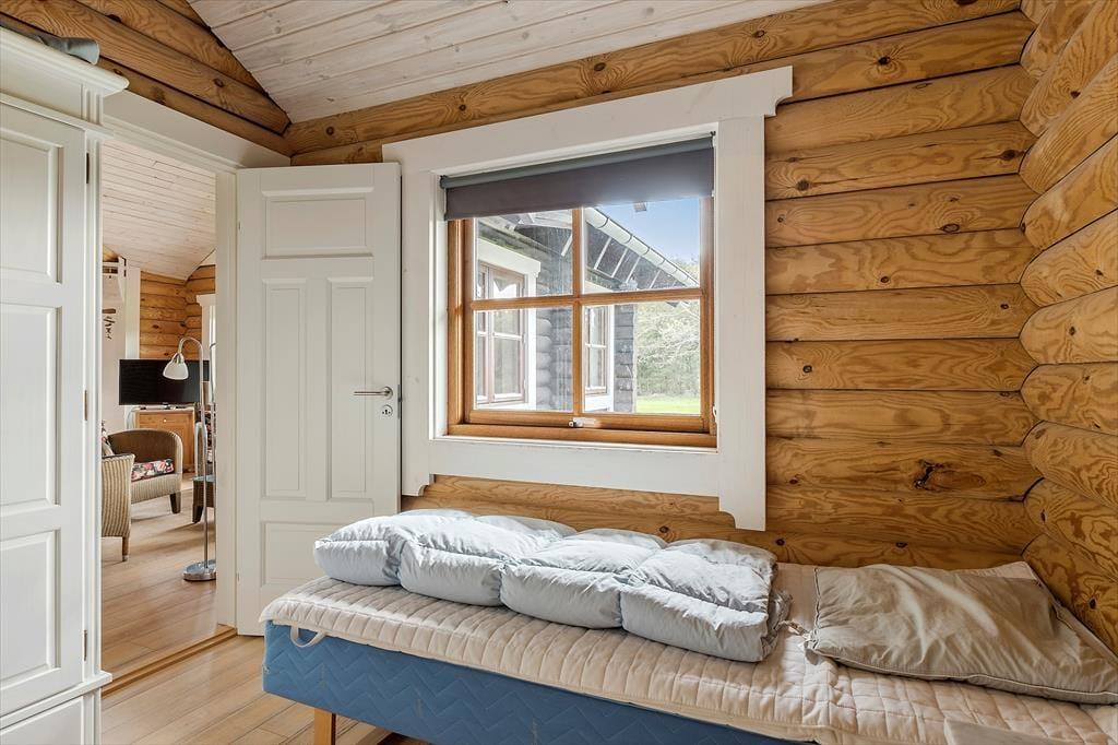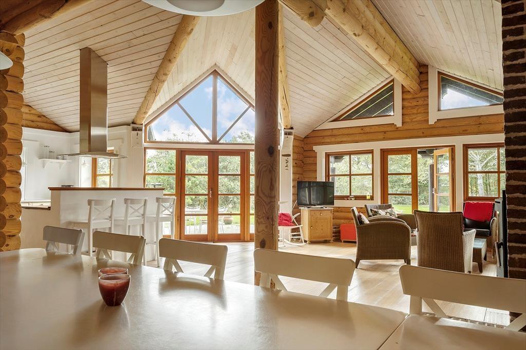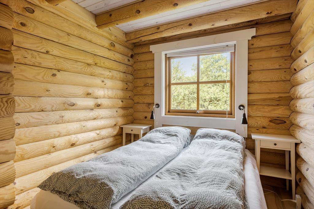 Sommerhuset, der er opført i 2009 og måler 140 m2, kan måske bedst betegnes som en nyfortolkning af et traditionelt, skandinavisk bjælkehus. De rustikke, umalede bjælker pryder væggene inden døre, og på helt klassisk vis er der loft til kip, indbygningspejs og sprossevinduer. Vinduerne er dog ekstra store, så lysindfaldet er godt, og husets gulvvarme, åbne køkken og badeværelse med spa og sauna hører til de mere moderne indretningsdetaljer. Overalt er der en skøn atmosfære, der indbyder til at nyde ferielivet i helt roligt tempo – med lækker mad, wellness-stunder, kortspil og hvad man nu ellers kan drømme om. Planløsningen består af en dejlig stue med integreret køkken, to badeværelser og tre soveværelser med sengepladser til i alt otte personer.