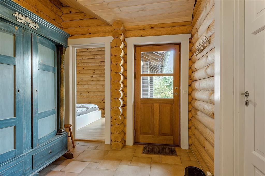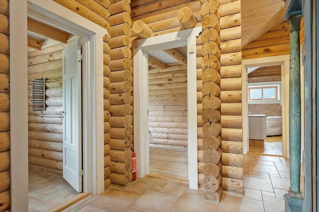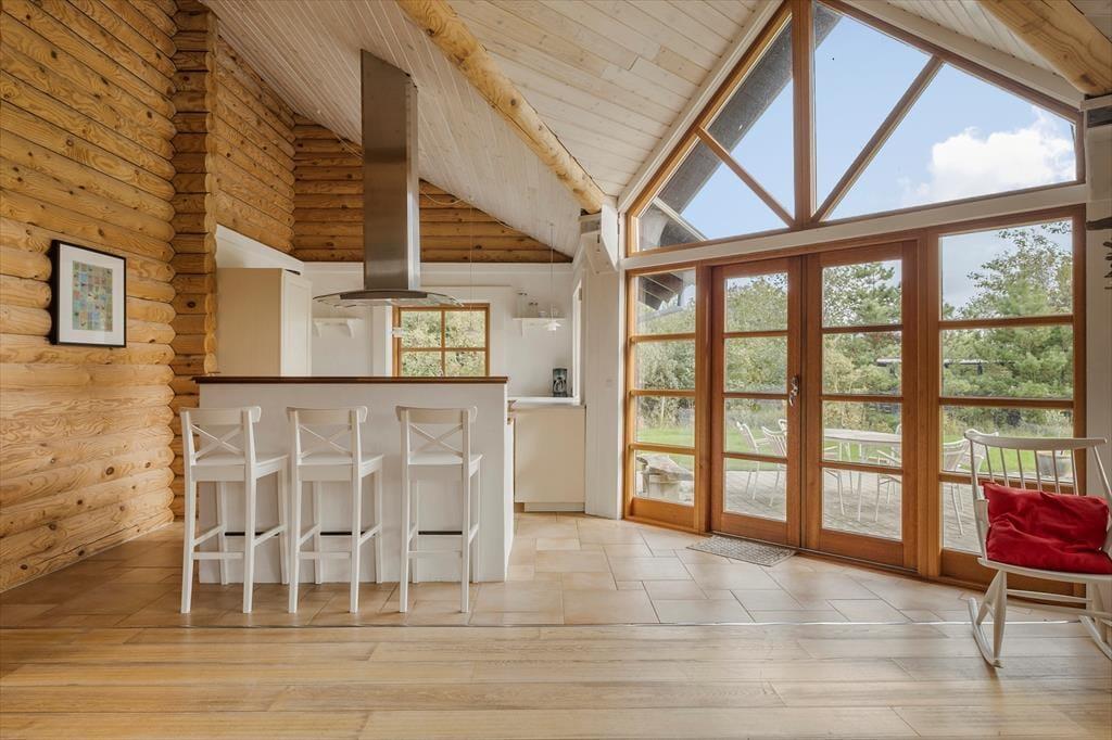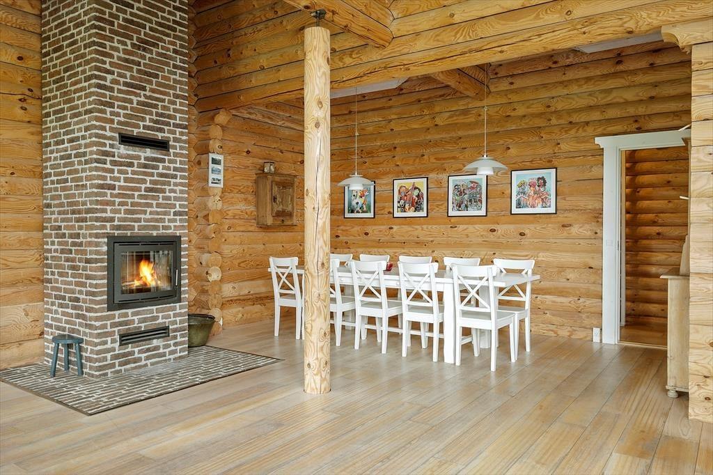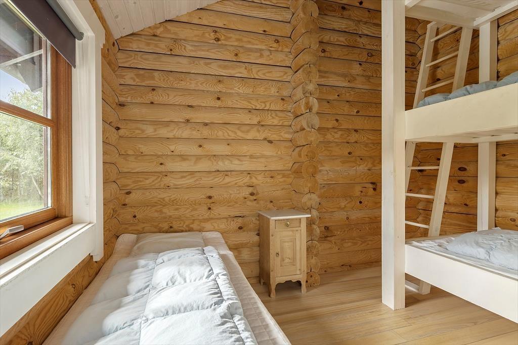 Sommerhuset, der er opført i 2009 og måler 140 m2, kan måske bedst betegnes som en nyfortolkning af et traditionelt, skandinavisk bjælkehus. De rustikke, umalede bjælker pryder væggene inden døre, og på helt klassisk vis er der loft til kip, indbygningspejs og sprossevinduer. Vinduerne er dog ekstra store, så lysindfaldet er godt, og husets gulvvarme, åbne køkken og badeværelse med spa og sauna hører til de mere moderne indretningsdetaljer. Overalt er der en skøn atmosfære, der indbyder til at nyde ferielivet i helt roligt tempo – med lækker mad, wellness-stunder, kortspil og hvad man nu ellers kan drømme om. Planløsningen består af en dejlig stue med integreret køkken, to badeværelser og tre soveværelser med sengepladser til i alt otte personer.