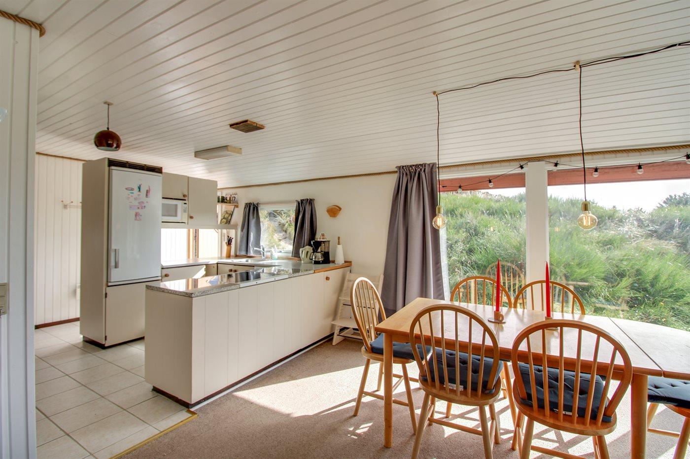 Køkkenet er udstyret med 1 køleskab. Der er 4 elkogeplader, bageovn, mikrobølgeovn samt opvaskemaskine.