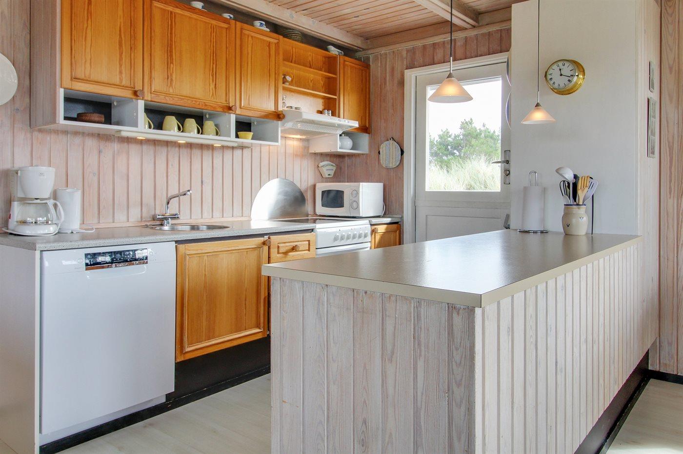 Køkkenet er udstyret med 1 køleskab. Der er 4 elkogeplader, varmluftovn, mikrobølgeovn samt opvaskemaskine.