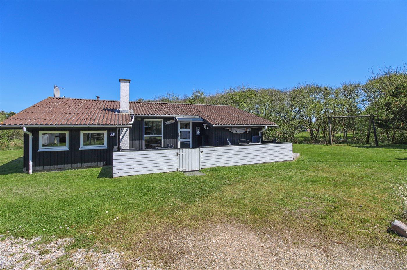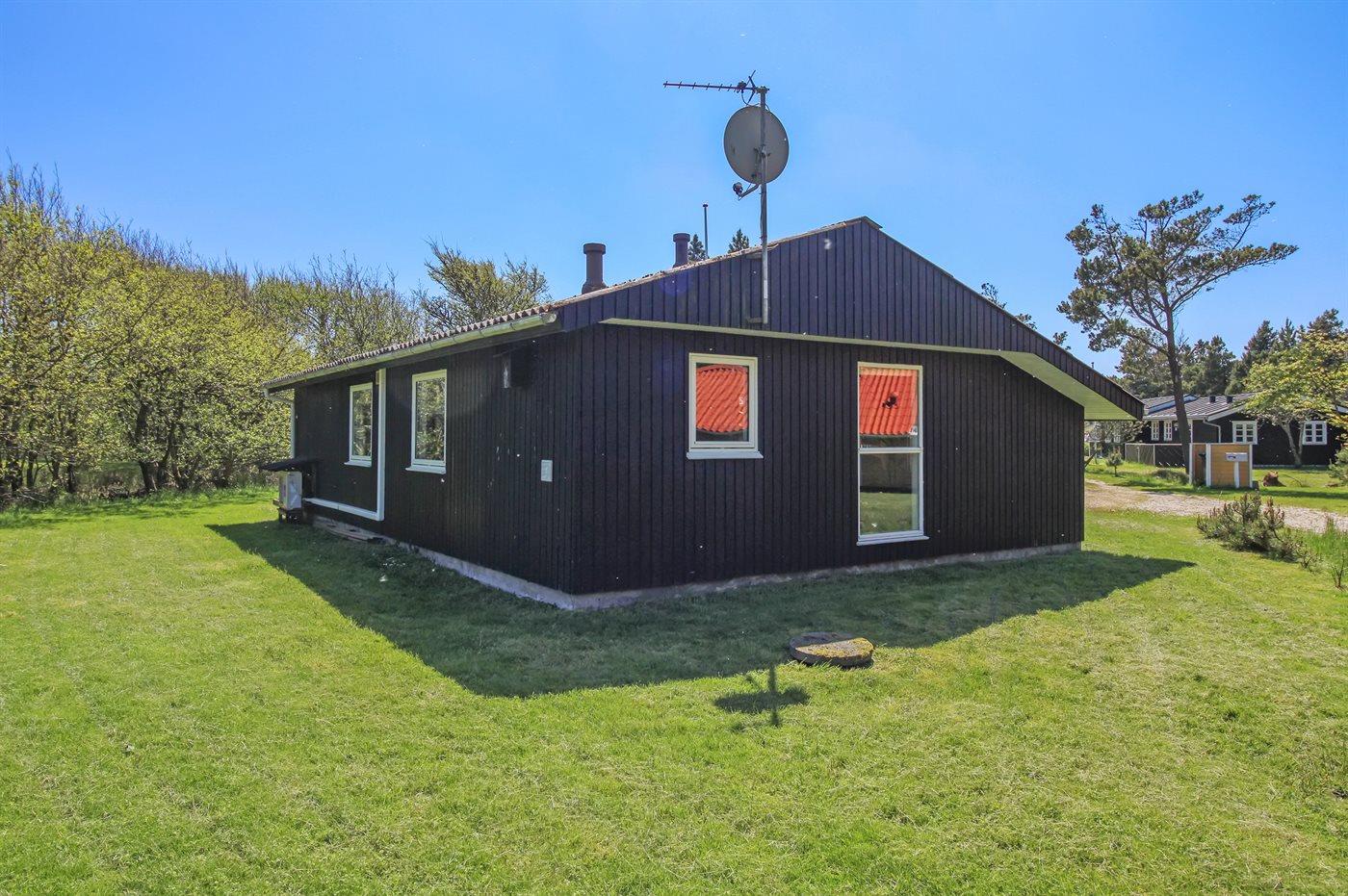 Et sommerhus beliggende på en delvis lukket og ugenert grund, med gode læmuligheder, for enden af en blind vej. Huset ligger blot 400 m fra fiskesø og 9 km fra Oksbøl Badeland.