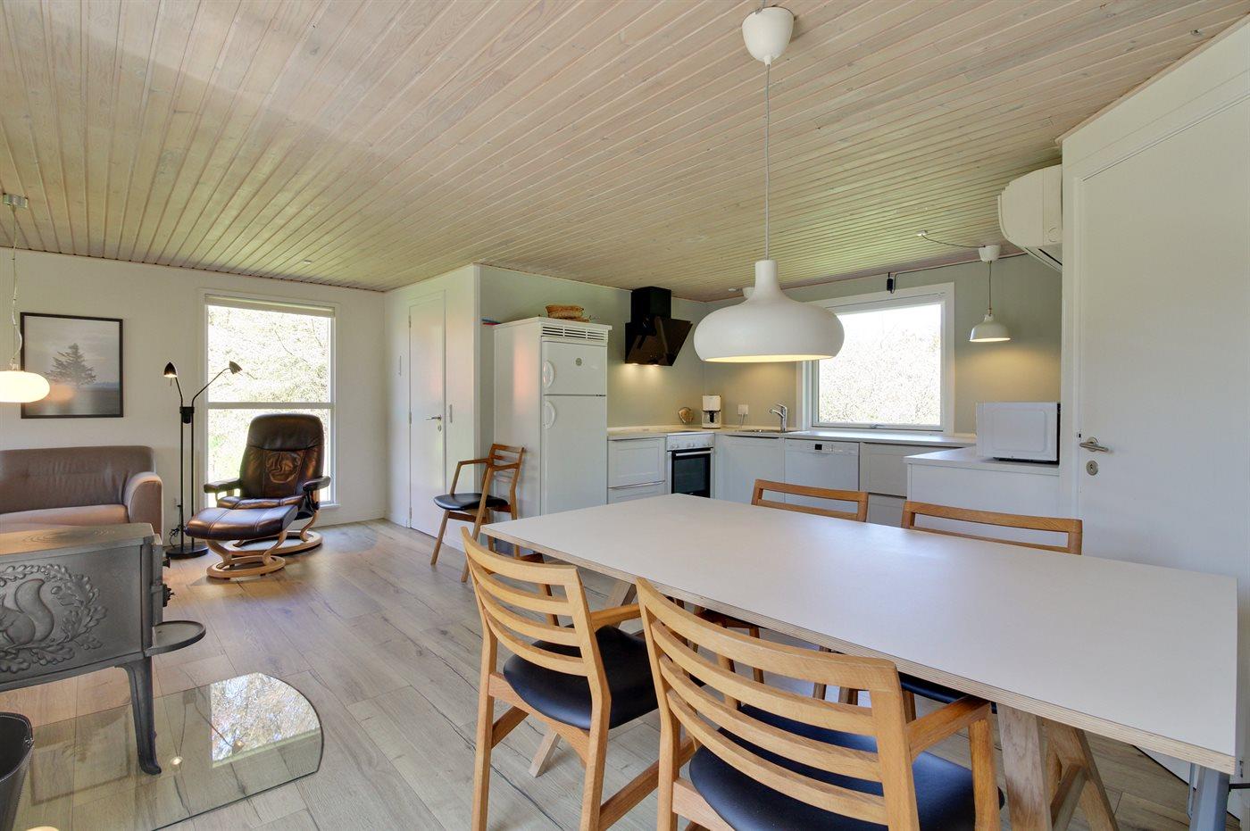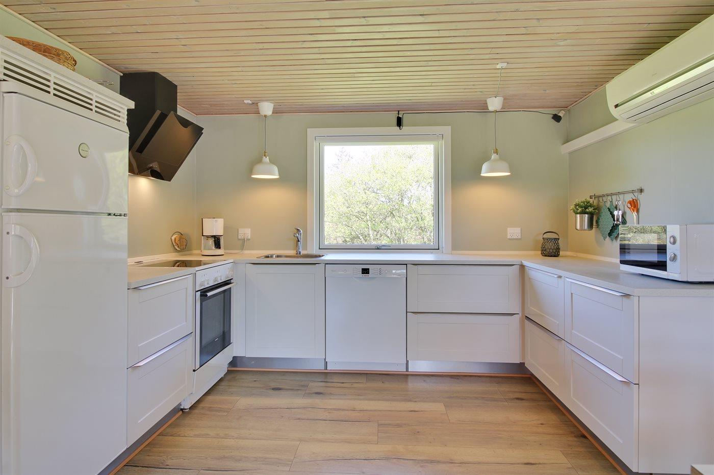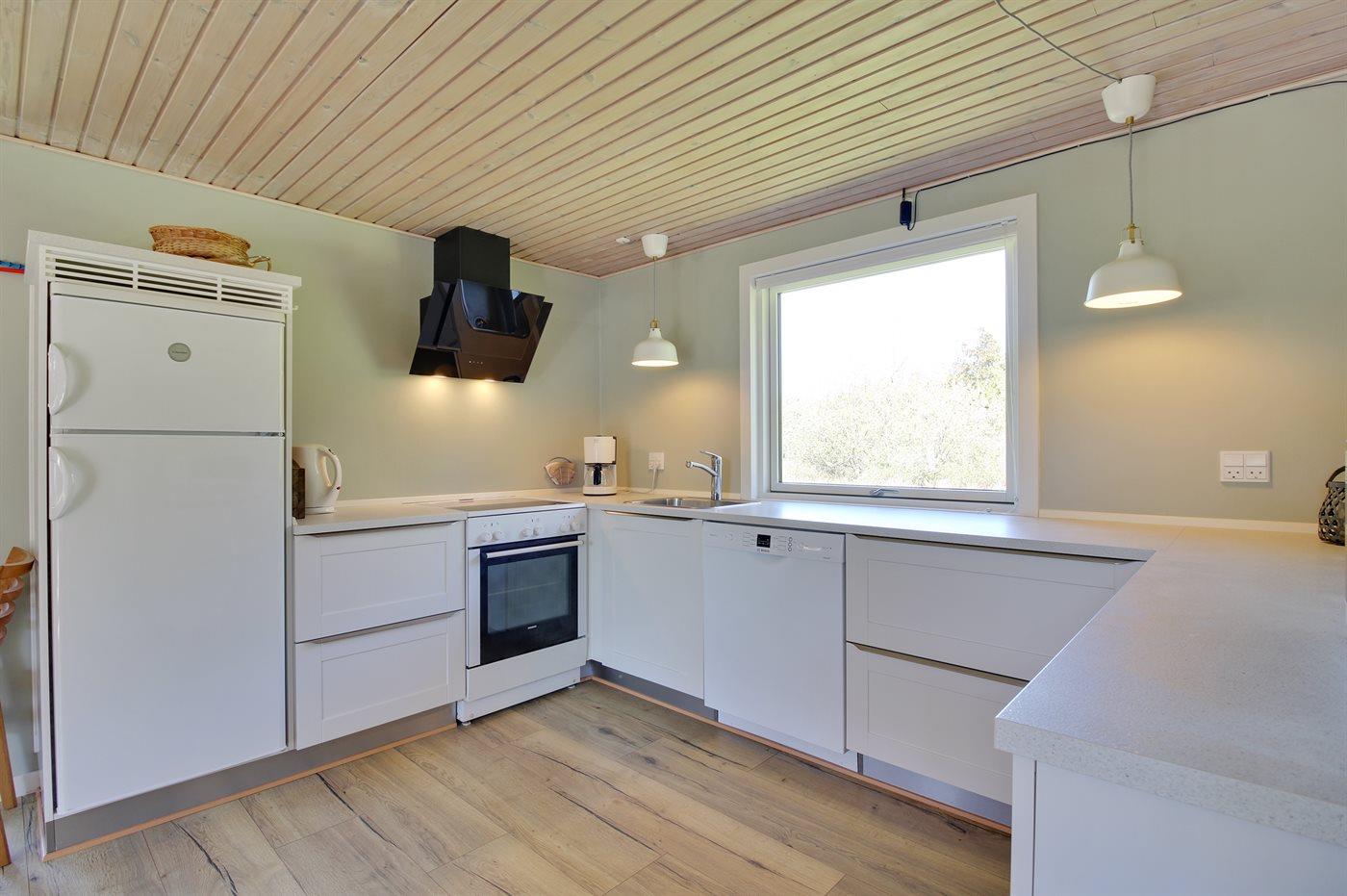 Køkkenet er udstyret med 1 køleskab. Der er 4 elkogeplader, varmluftovn, mikrobølgeovn samt opvaskemaskine.