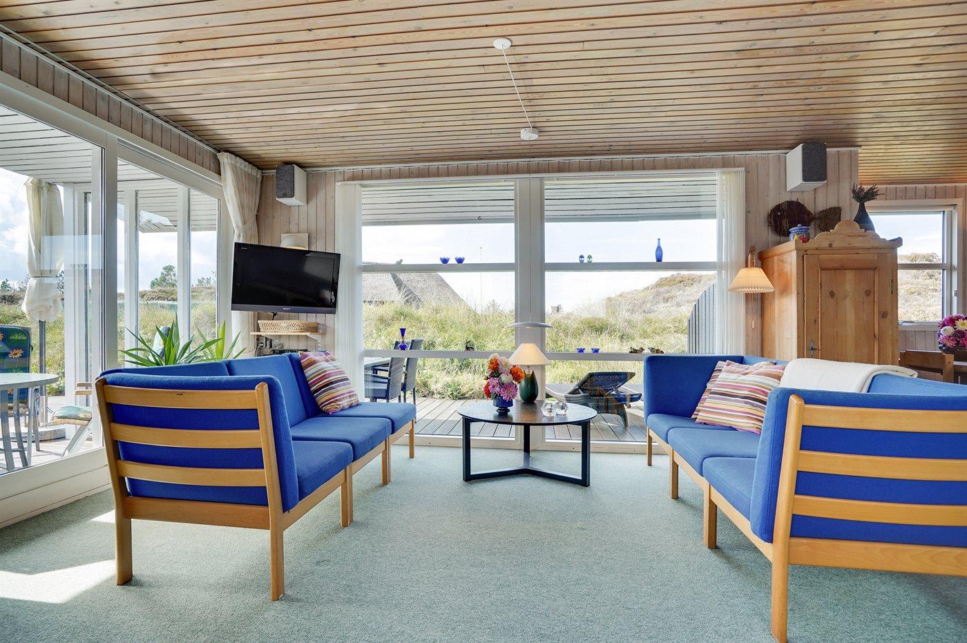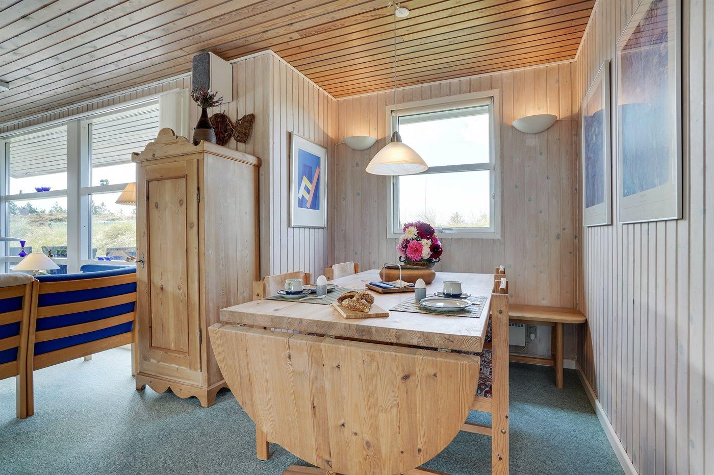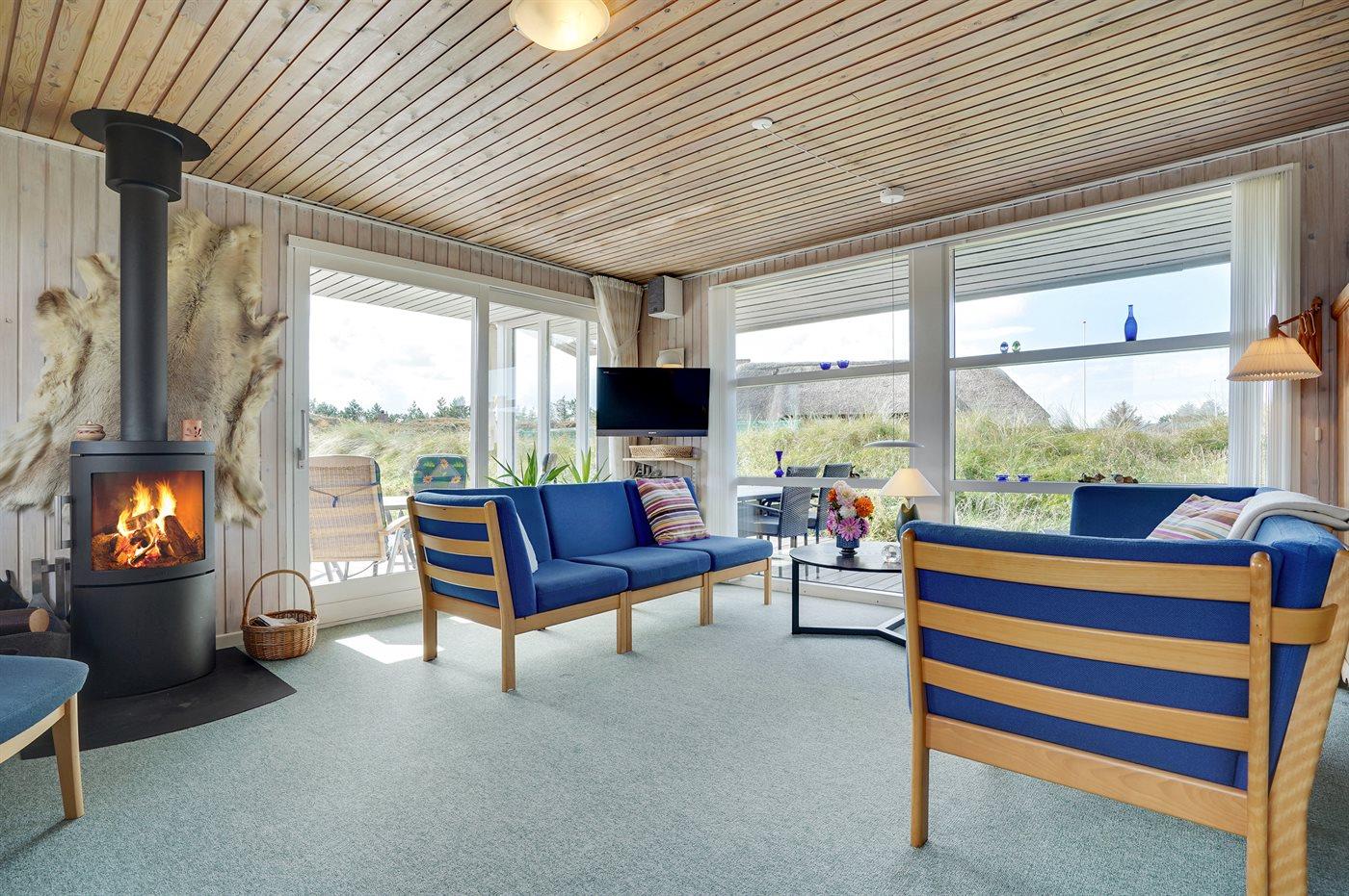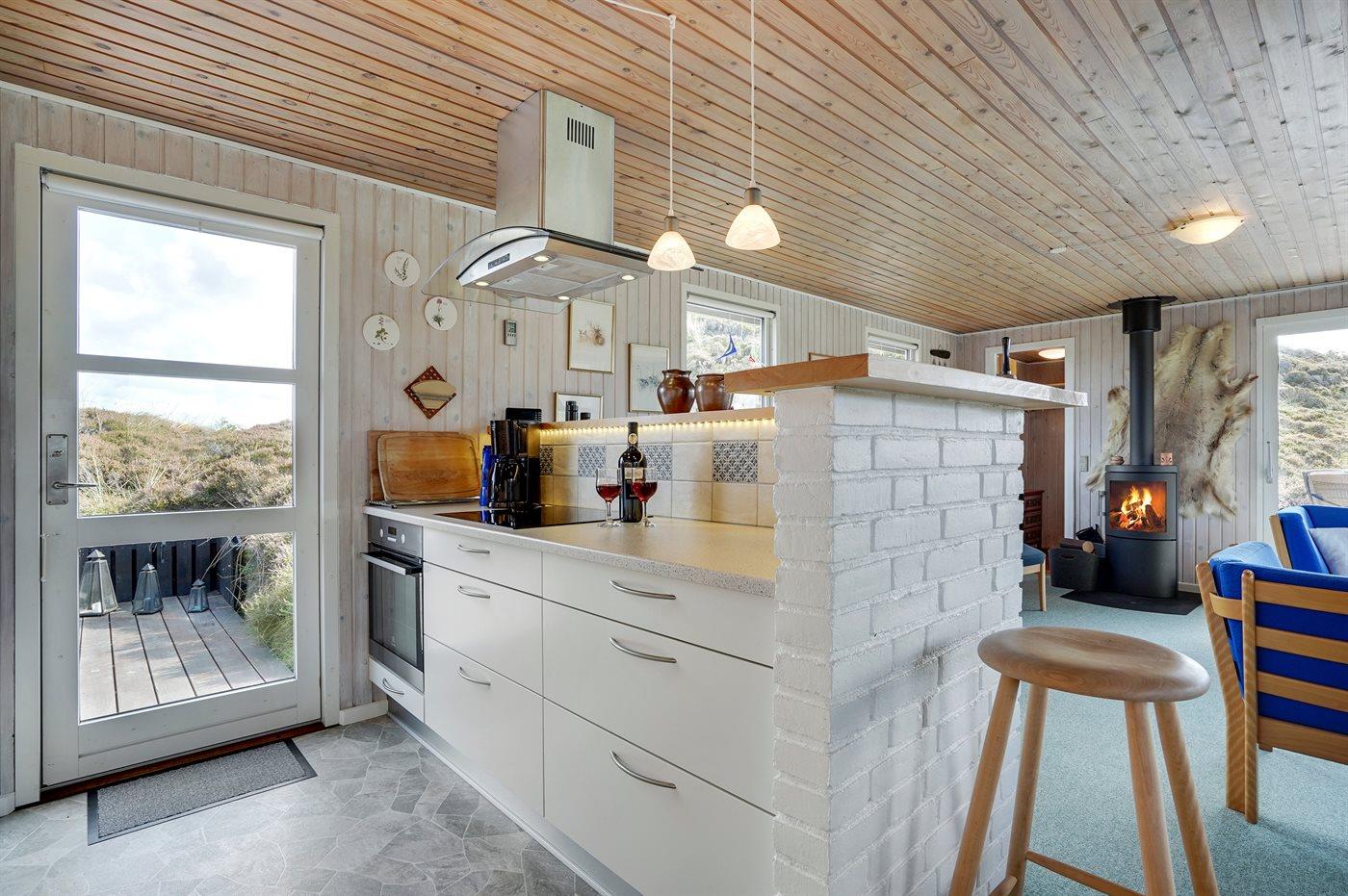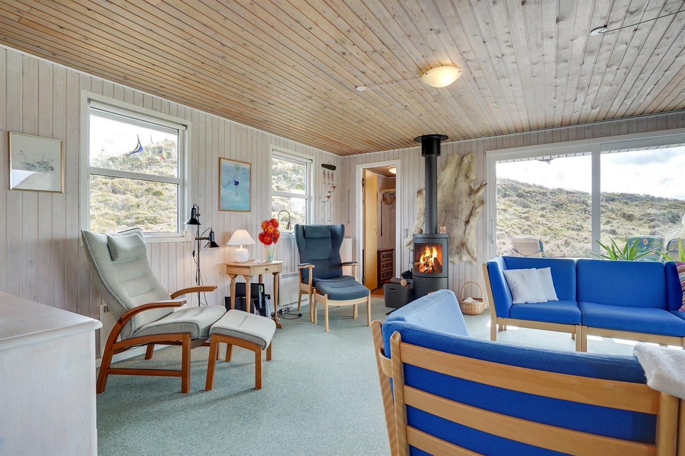 Boligen fremstår lys og venlig med lysindfald fra flere sider. Der er brændeovn. Køkkenet er i åben forbindelse med stuen - optimalt for fælles aktiviteter. Hyggelig spisekrog med stor sofa og flere lænestole giver mulighed for hygge og afslapning. Udenfor vinduerne kan man nyde udsigten til de lyngbeklædte bakker, hvor rådyrene færdes frit. Det er ikke tilladt at medbringe husdyr.