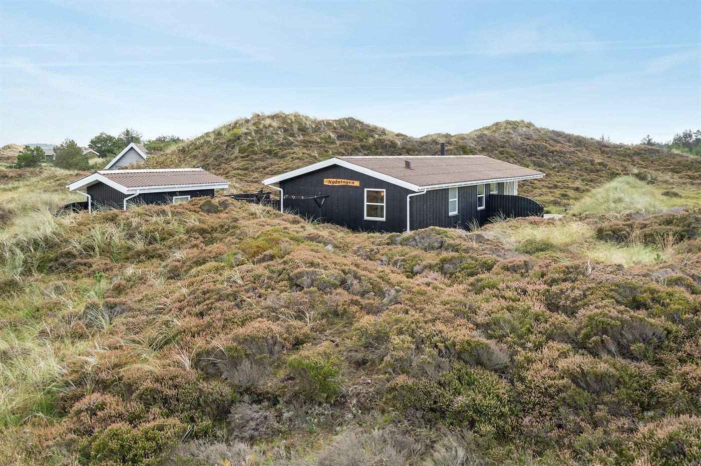 Dette velholdte sommerhus er opført på en stor naturgrund med lyng og klitter.