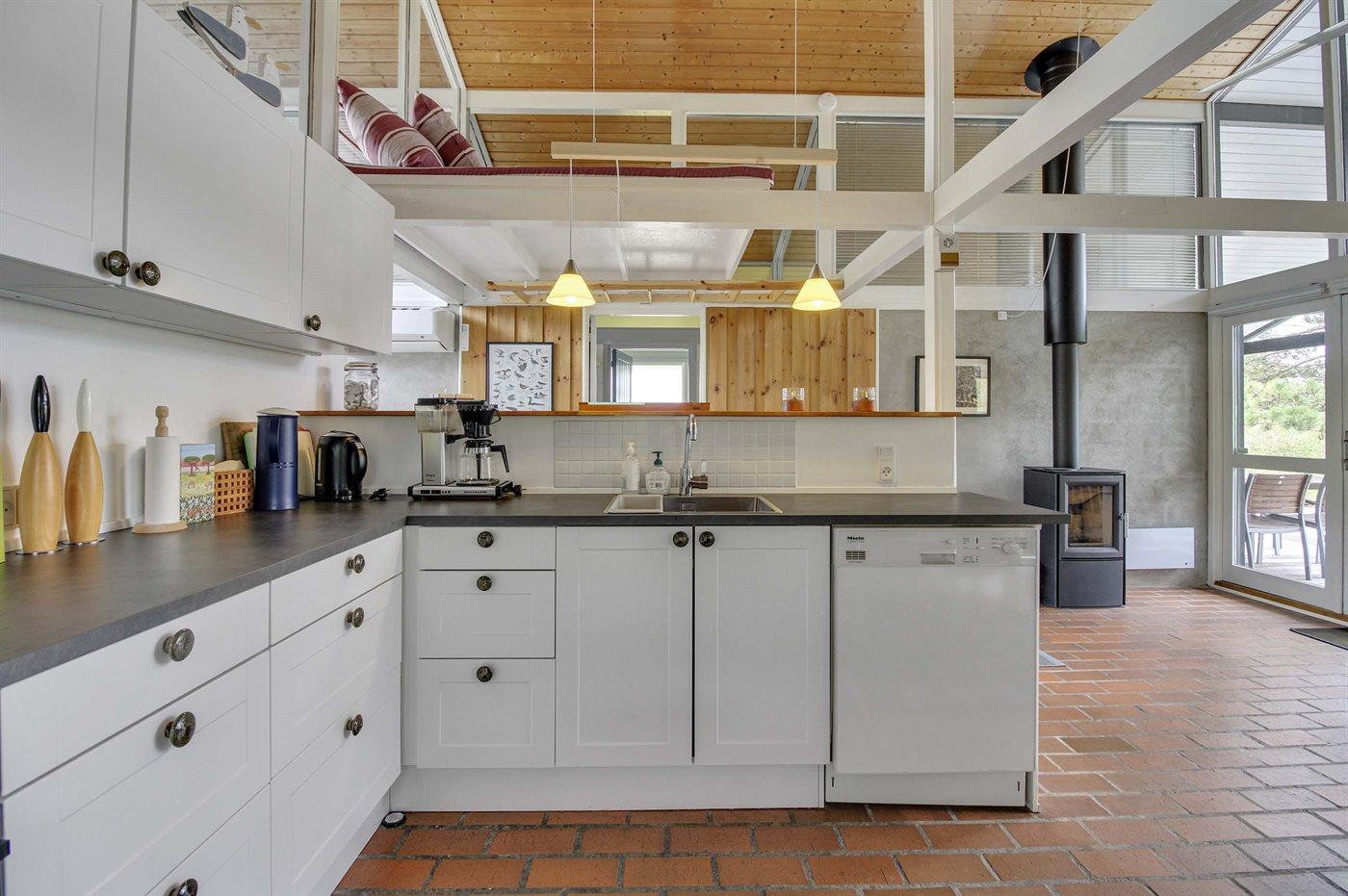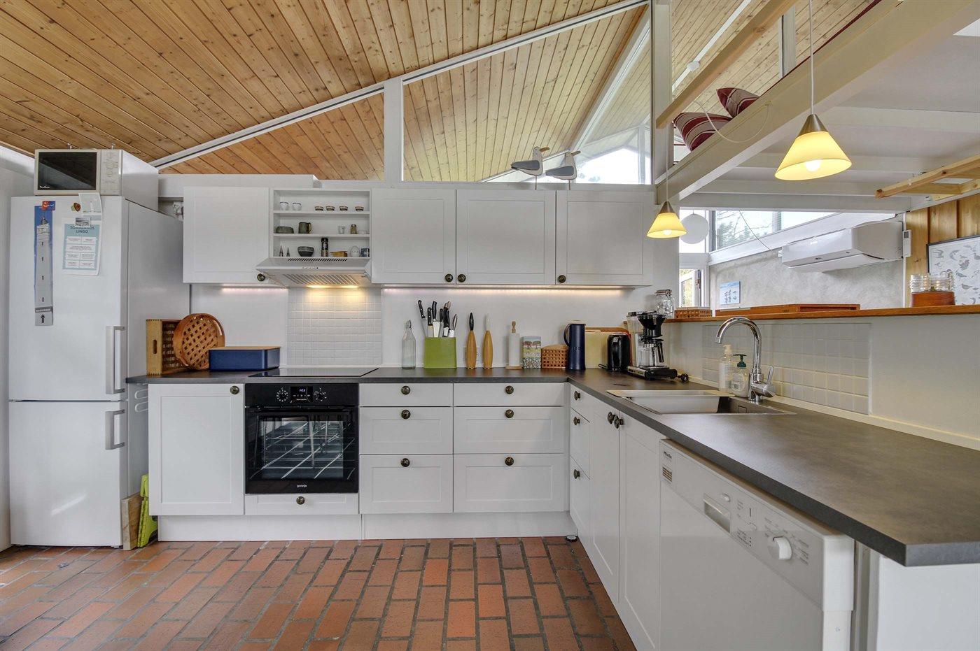 Køkkenet er udstyret med 1 køleskab. Der er 4 induktionskogeplader, varmluftovn, mikrobølgeovn samt opvaskemaskine.