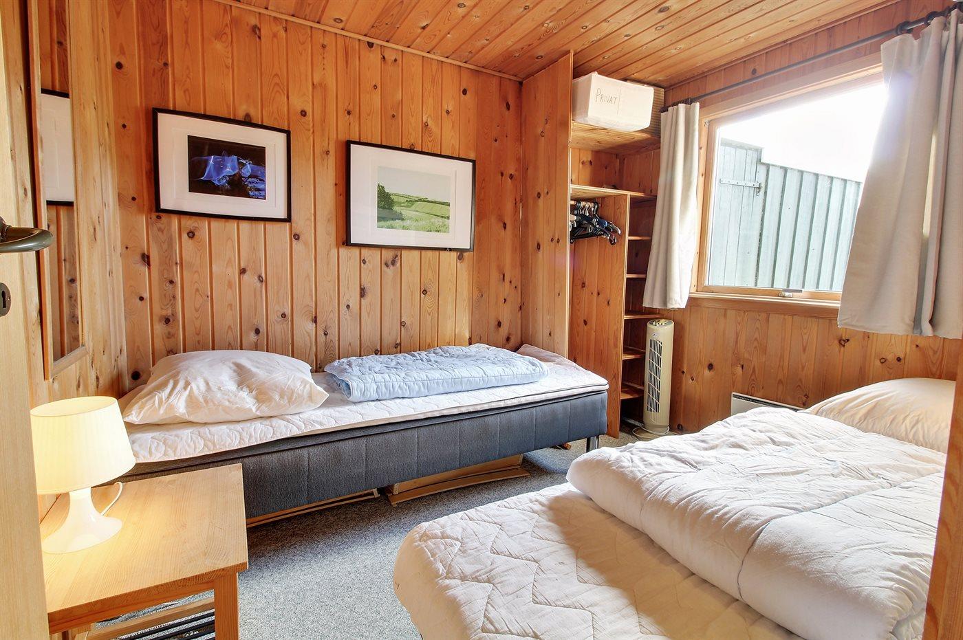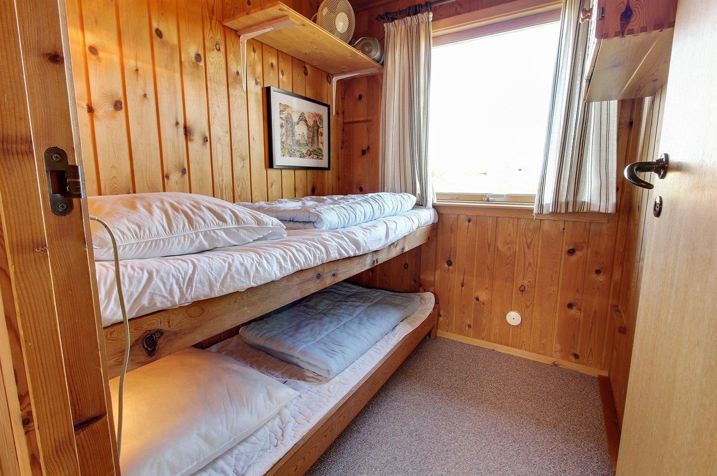 Der er i alt 3 soveværelser. Sovepladserne fordeler sig på: 4 sovepladser i enkeltsenge.1 soveplads i køjeseng. 2 sovepladser i sovesofa (dobbelt). Køjesengen er kun egnet til børn. Derudover er der 1 stk. barneseng.