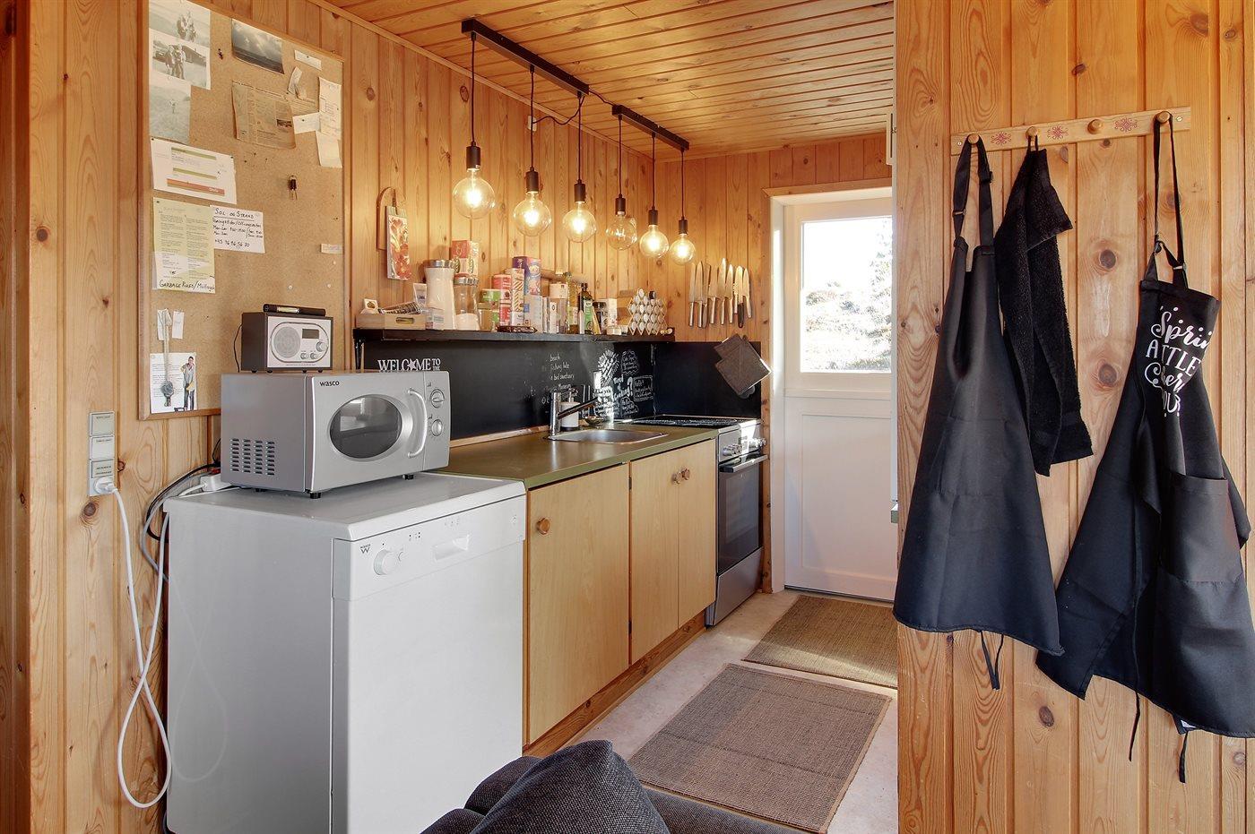 Køkkenet er udstyret med 1 køleskab. Der er 4 elkogeplader, bageovn, mikrobølgeovn samt opvaskemaskine.