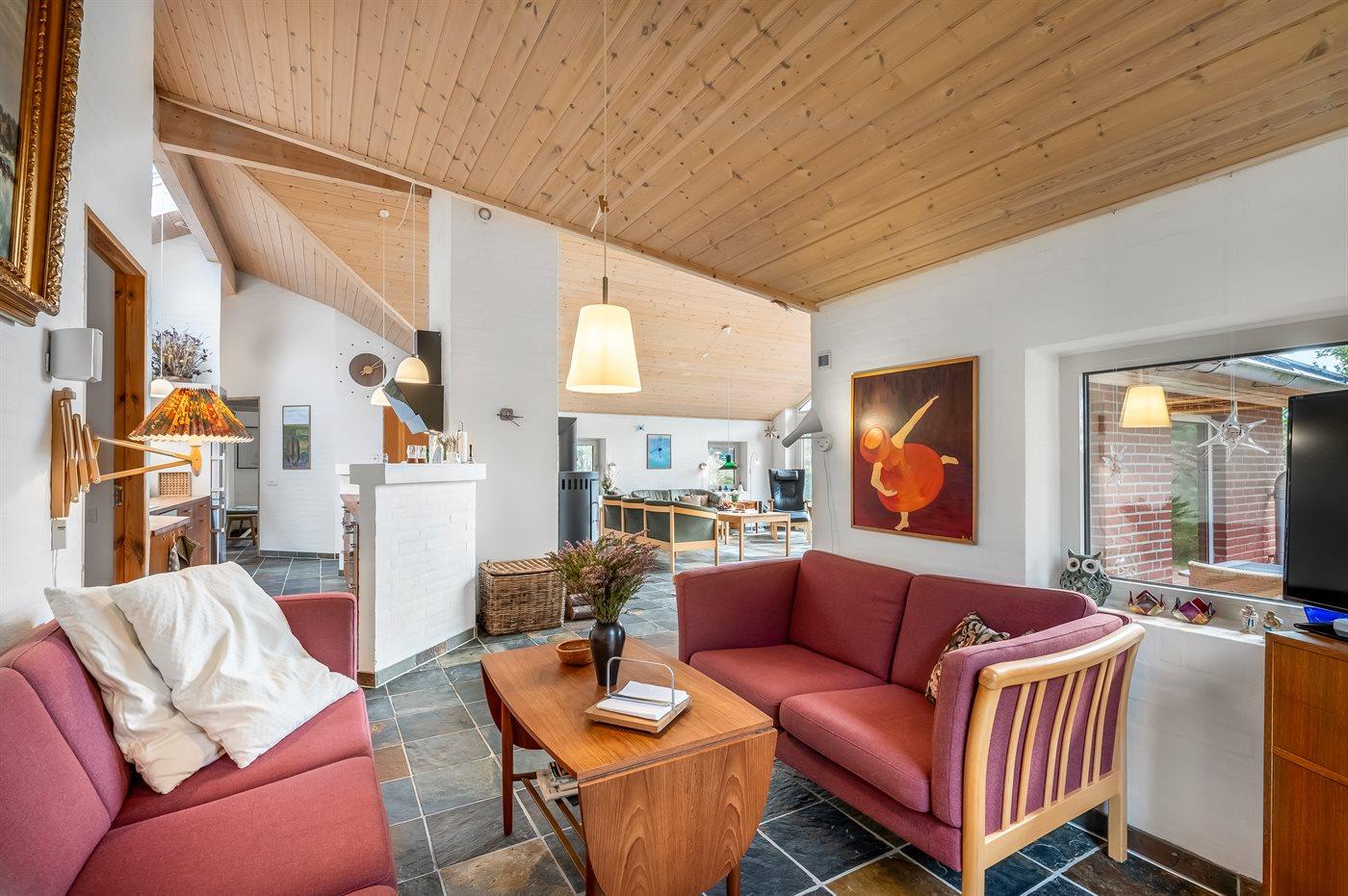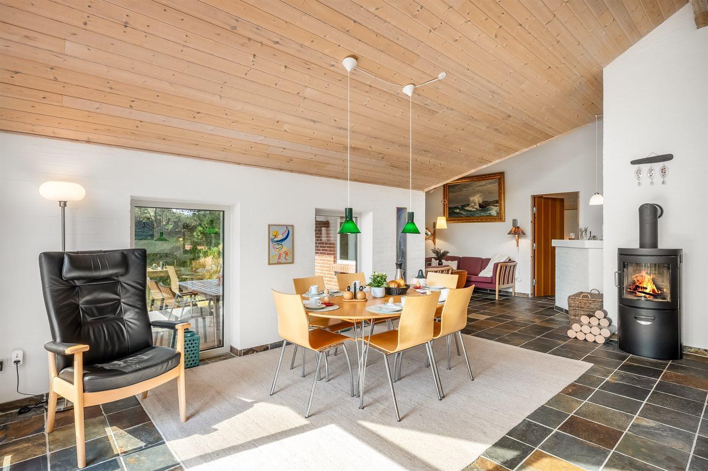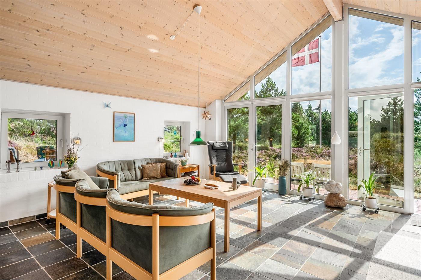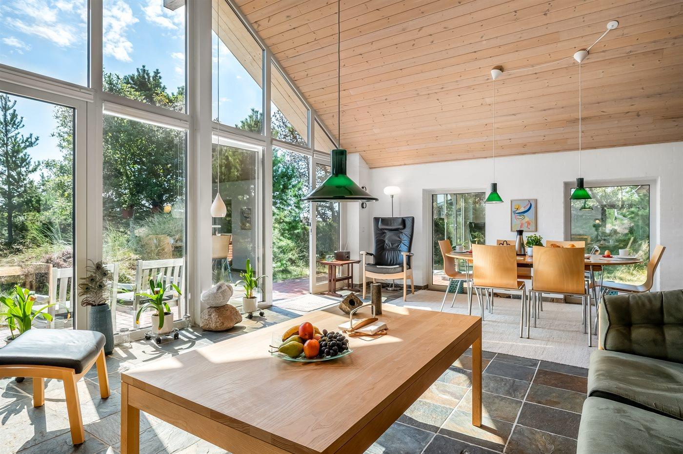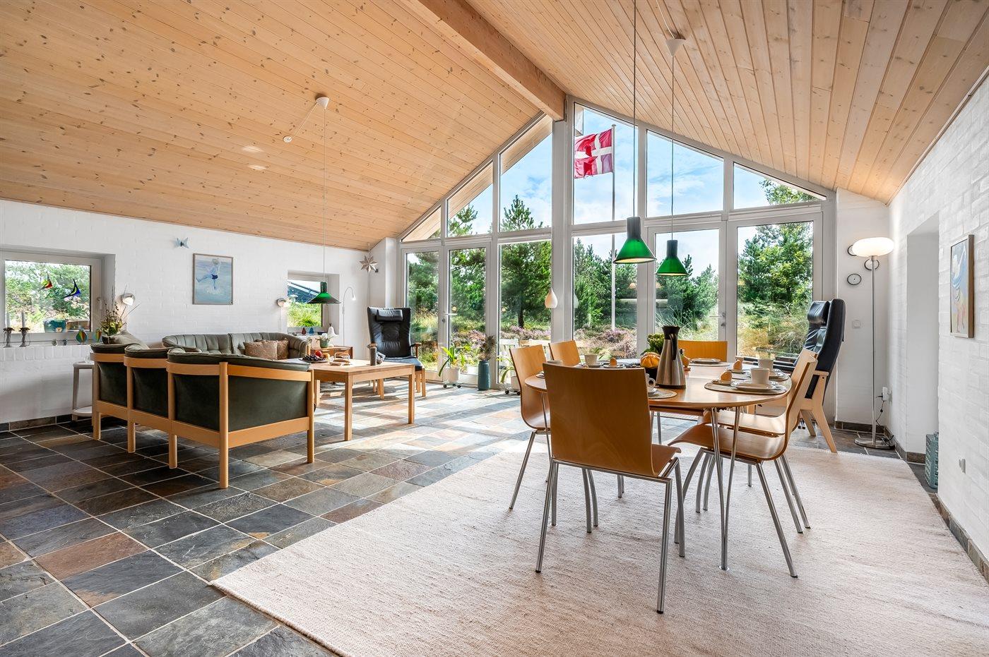 Fra stuen er der direkte adgang til alle husets terrasser. På den måde vil det altid være muligt at finde et sted, hvor det er rart at være, alt efter om man ønsker et solrigt eller skyggefuldt sted. Fra øst terrassen kan man nyde solen stå op over de åbne og vidt strakte lyngarealer. Fra vest terrassen kan man nyde farvespillet på aftenhimlen i solnedgangen.