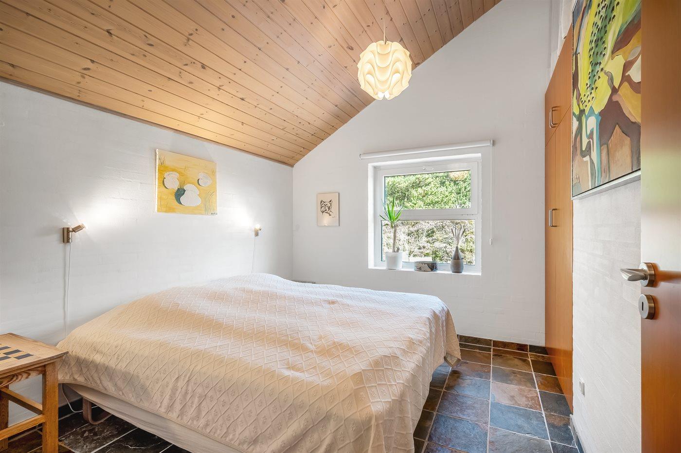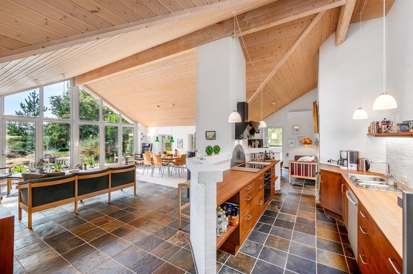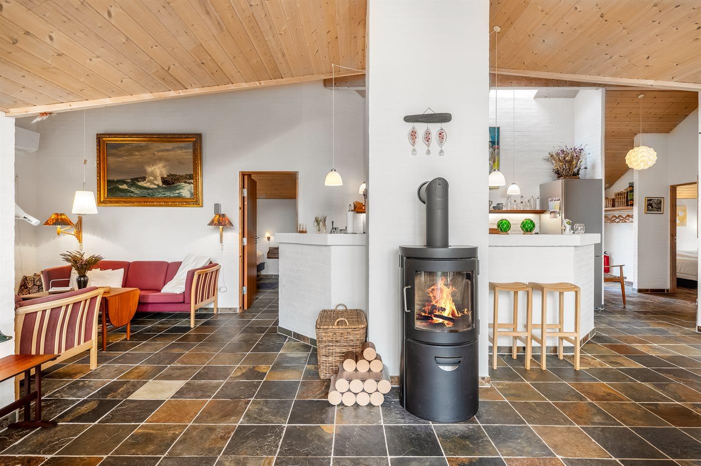 Indendørs emmer hele huset af en usædvanlig høj kvalitet. Gulvbelægningen er kinesisk skifer, dørene er massive og alt inventar i køkken, på bade- og soveværelserne er fremstillet af en håndværkssnedker i træsorten mahogni. Indretningen er gennemtænkt med det store opholds- og samlingssted centralt placeret ved brændeovnen. Loftet er ført helt til kip, store vinduespartier og ovenlysvindue er med til at skabe et både rummeligt og på samme tid et favnende rum. Her kan man nyde hyggelige middage, spille spil og skabe uforglemmelige minder sammen.