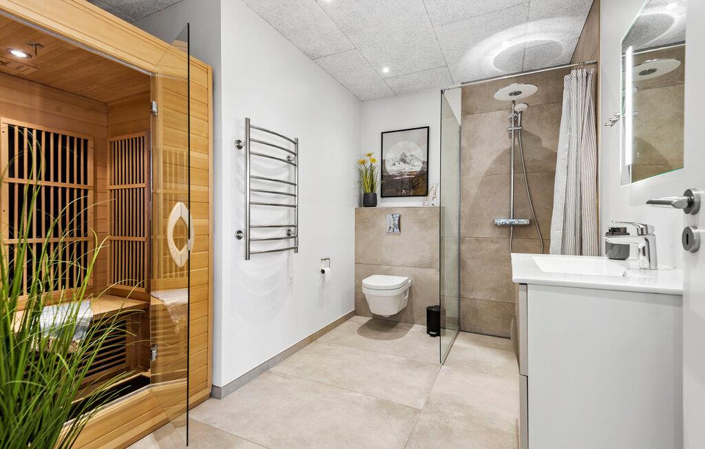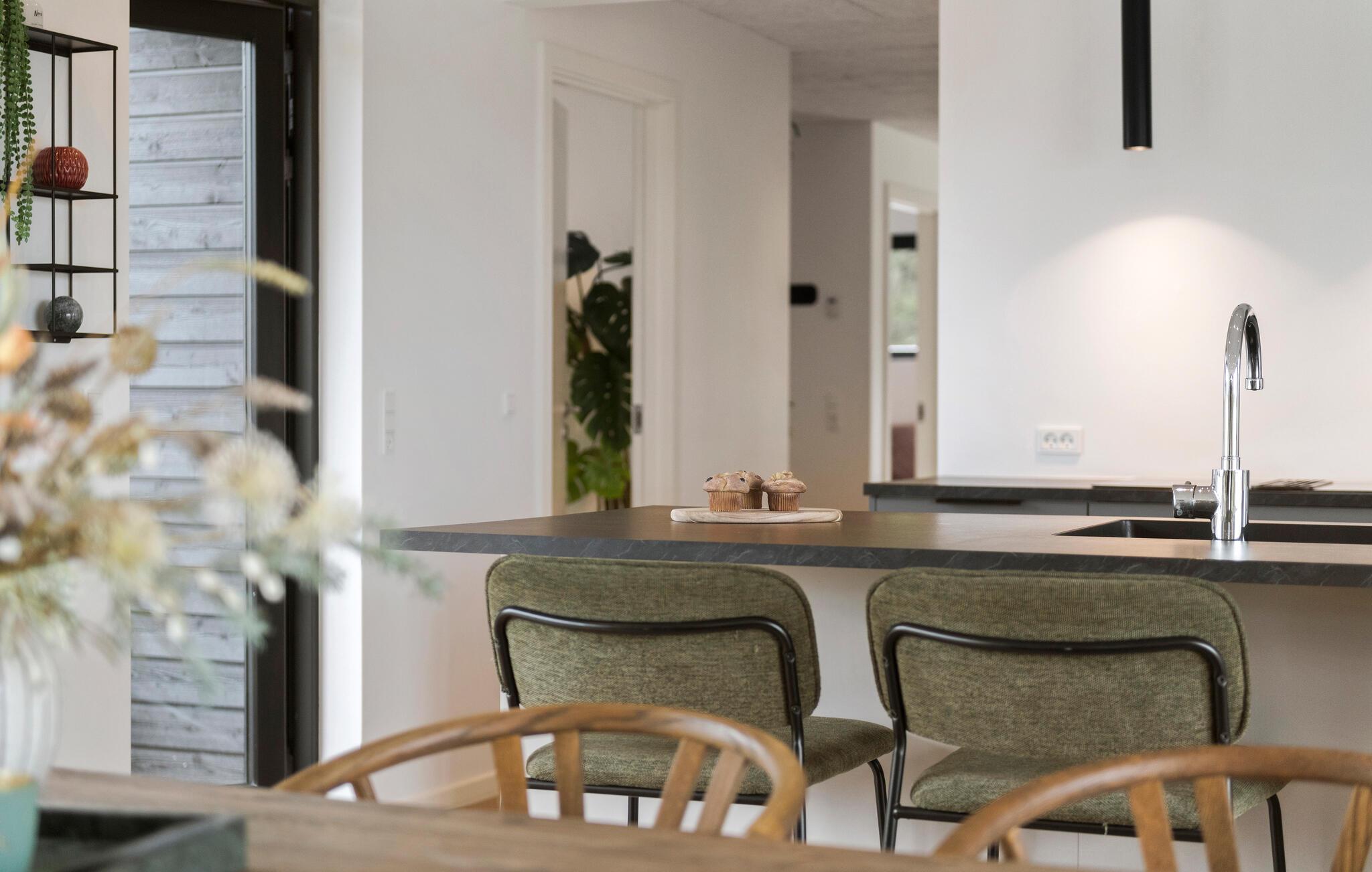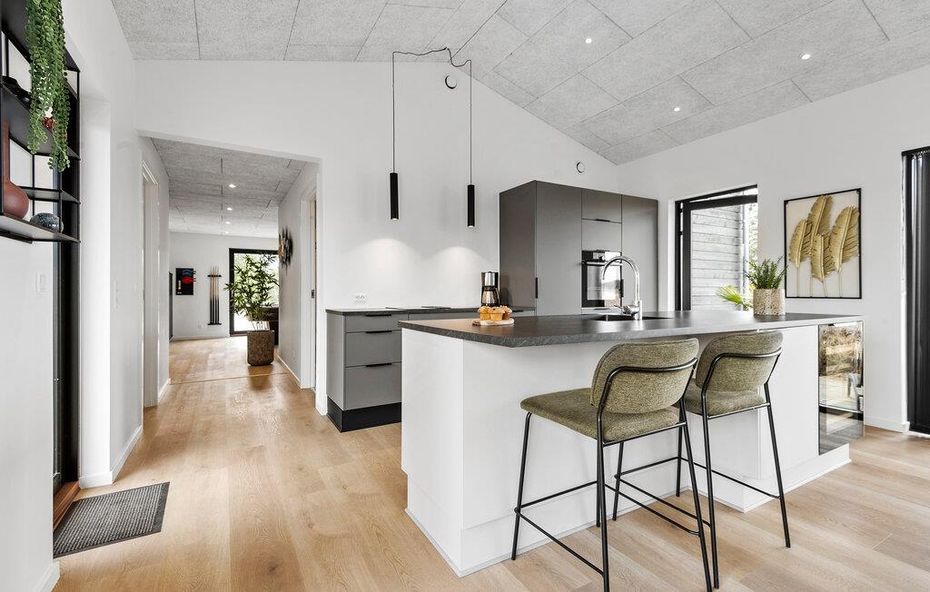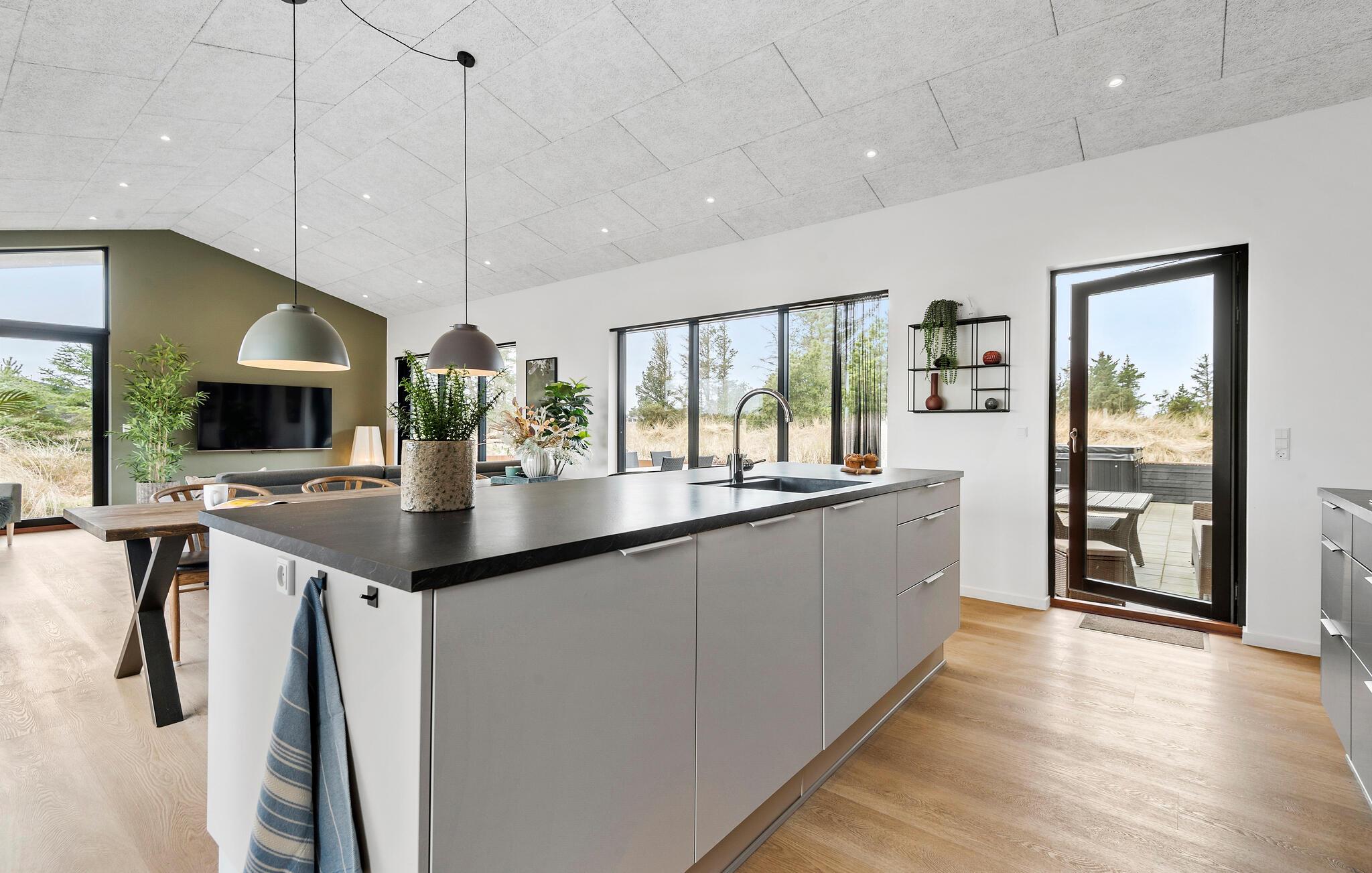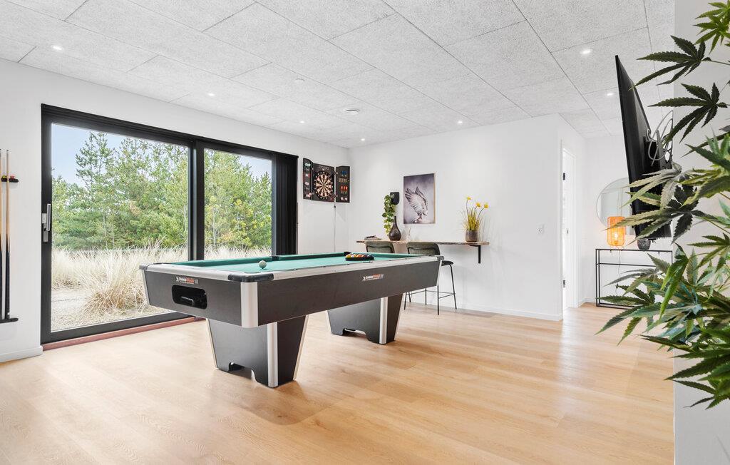 Slap af i den lyse opholdsstue med store vinduespartier og en komfortabel sofagruppe. Hyg jer på sofaen, og nyd den åbne atmosfære, mens blikket glider ud over det grønne. Spiseområdet hænger harmonisk sammen med det moderne køkken med kogeø – ideelt til hyggelige madlavningsaftener. Brug også billardbordet til en omgang spil og sjov, og forkæl jer selv med lidt wellness i husets sauna.