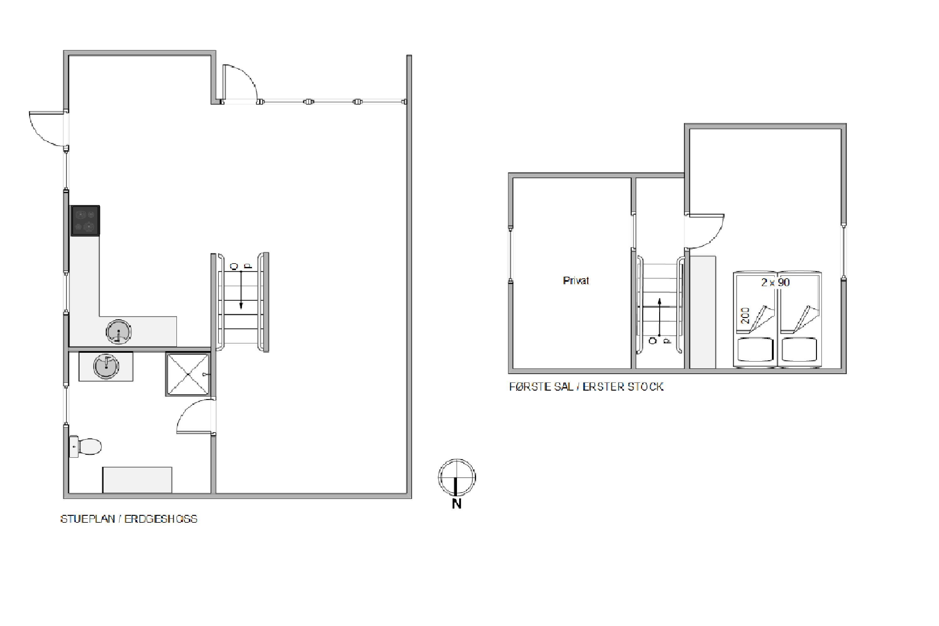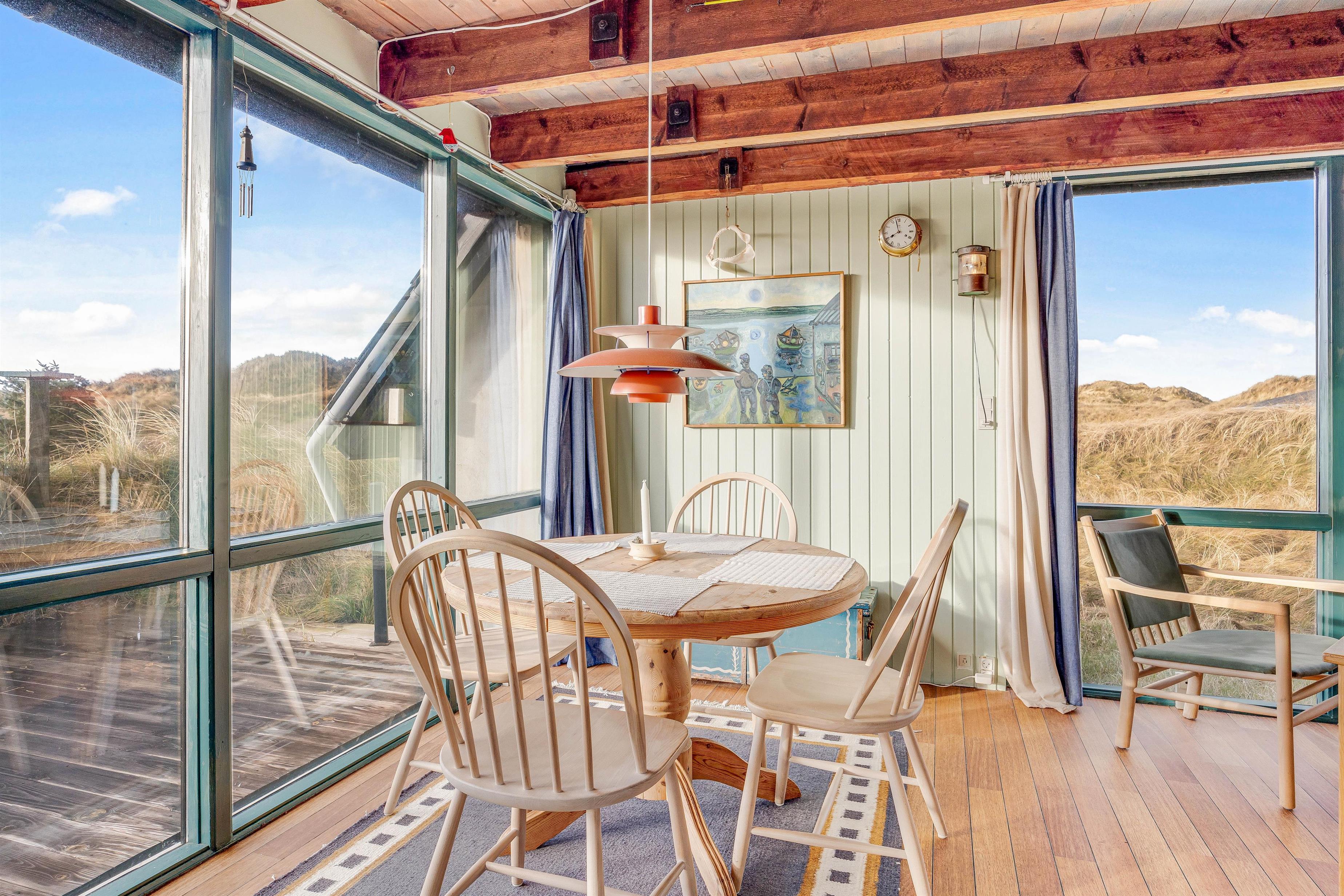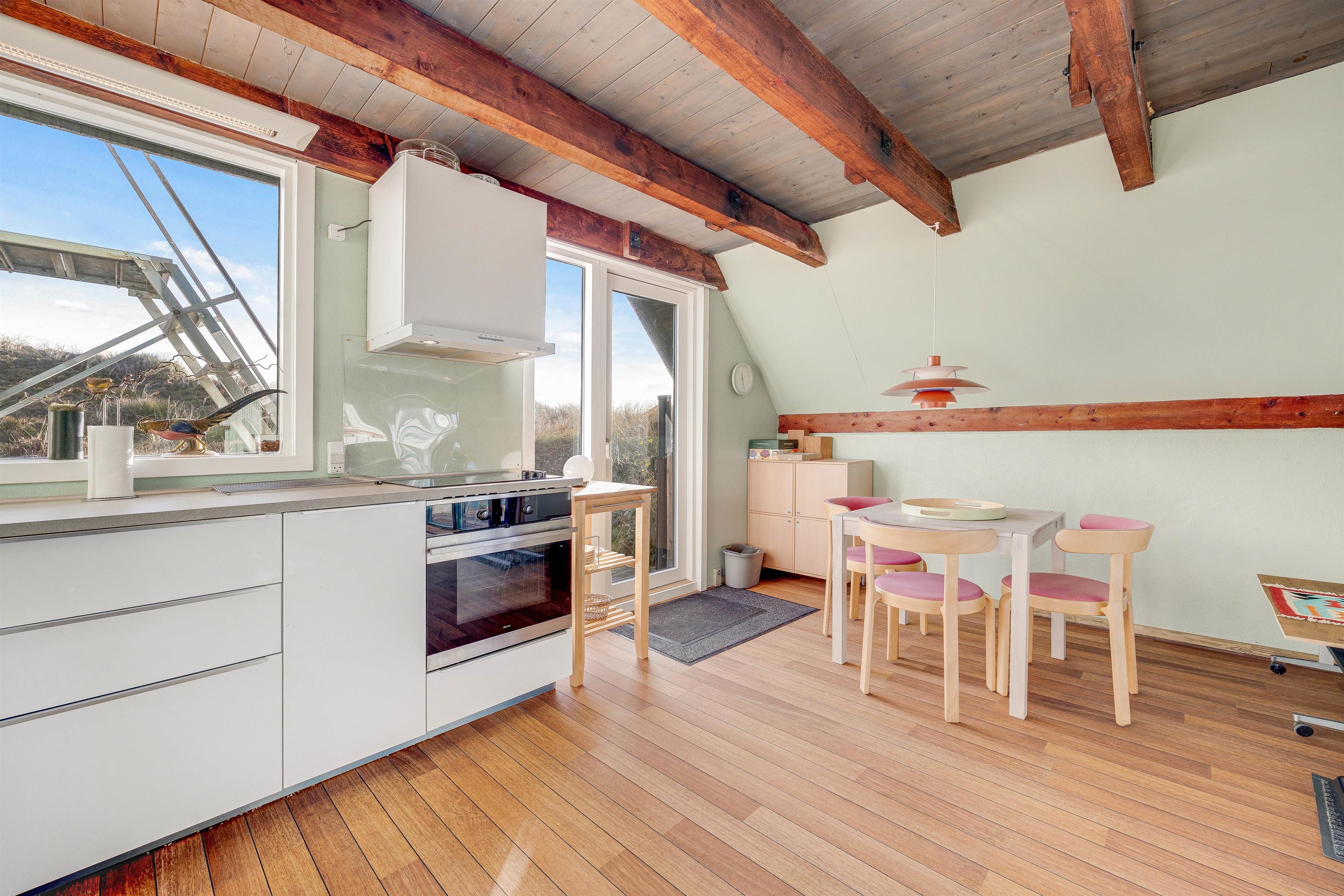 I feriehusets stueplan finder du et badeværelse og et kombineret køkkenalrum og stue. Køkkenet er udstyret med opvaskemaskine, så du ikke skal bruge din kostbare ferietid på at vaske op i hånden. Fra de store vinduespartier i køkken og stue har du en fantastisk udsigt til klitterne, som er din nærmeste nabo. På førstesalen finder du feriehusets soveværelse.