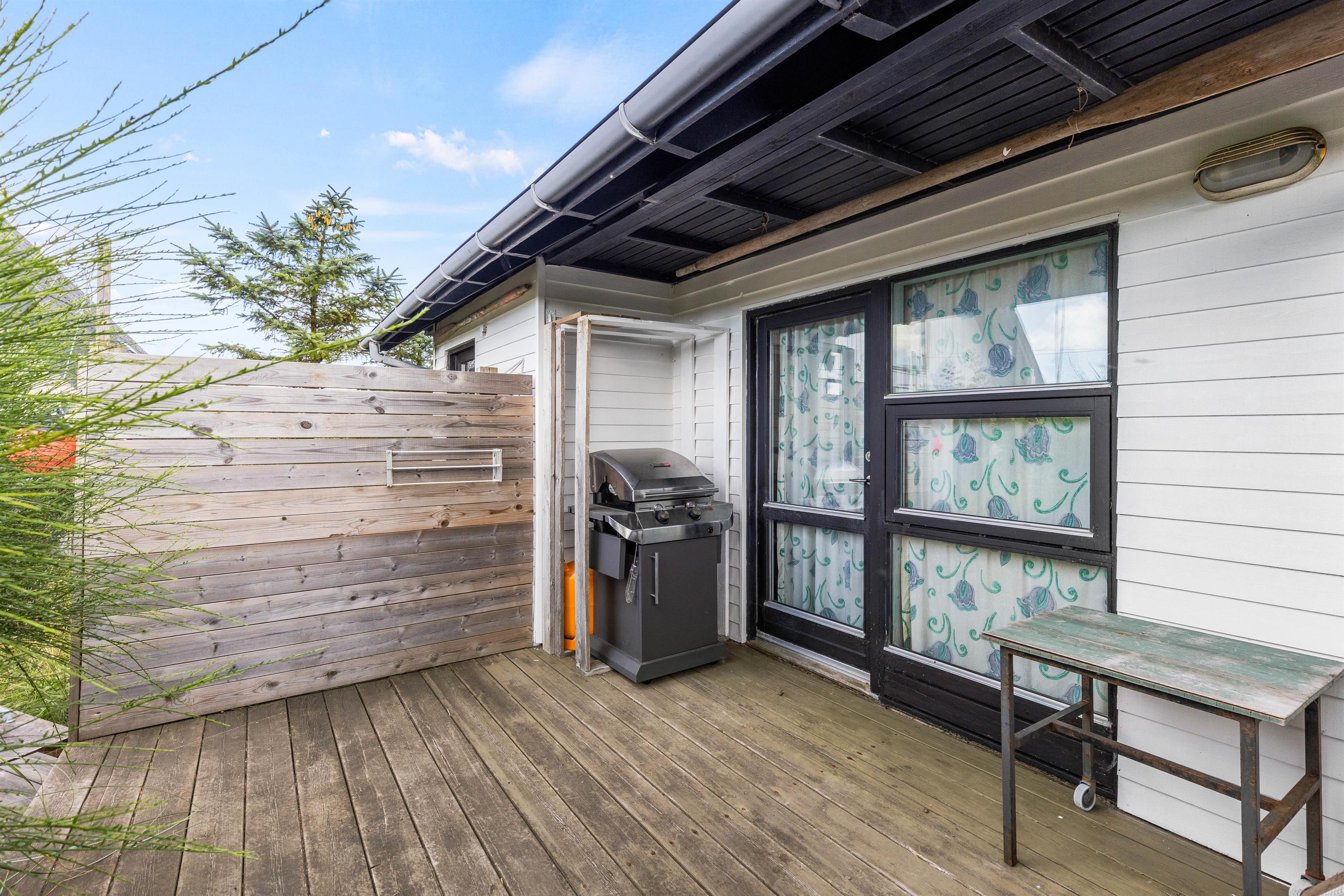 Havemøbler/grill befinder sig i skuret ved siden af huset.