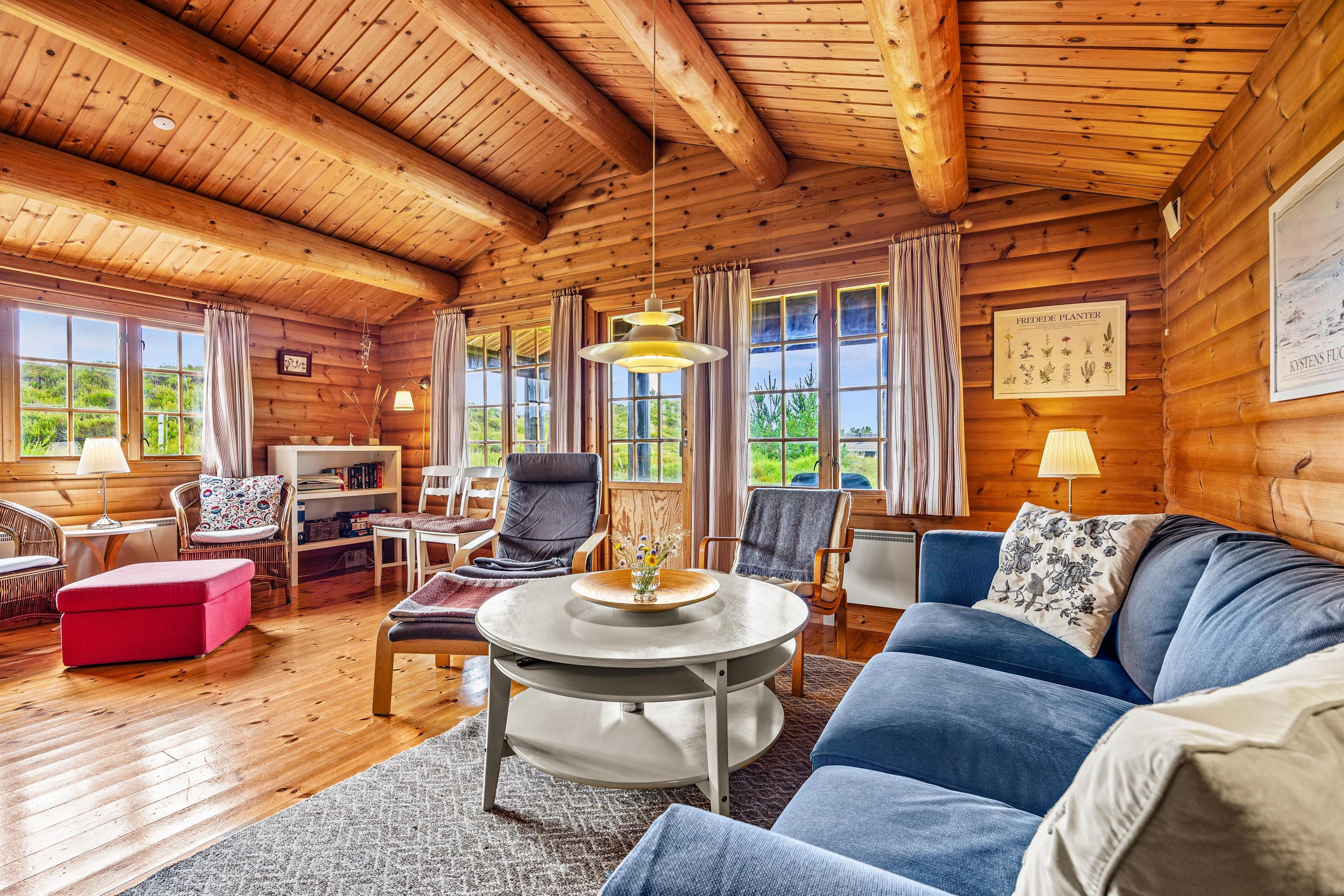 Sommerhuset er bygget i klassisk sommerhusstil og indrettet med træ på både vægge, lofter og gulve. Det giver en varm og hyggelig atmosfære, som straks får jer ned i gear. I stuen er der god plads til at samles omkring brændeovnen, der spreder både varme og stemning, når vinden rusker udenfor. Her finder I også danske tv-kanaler, så I kan følge med i nyheder eller se en god film efter en lang dag i naturen. En moderne og energibesparende luft-til-luft varmepumpe sørger for et behageligt indeklima året rundt – uanset sæson.