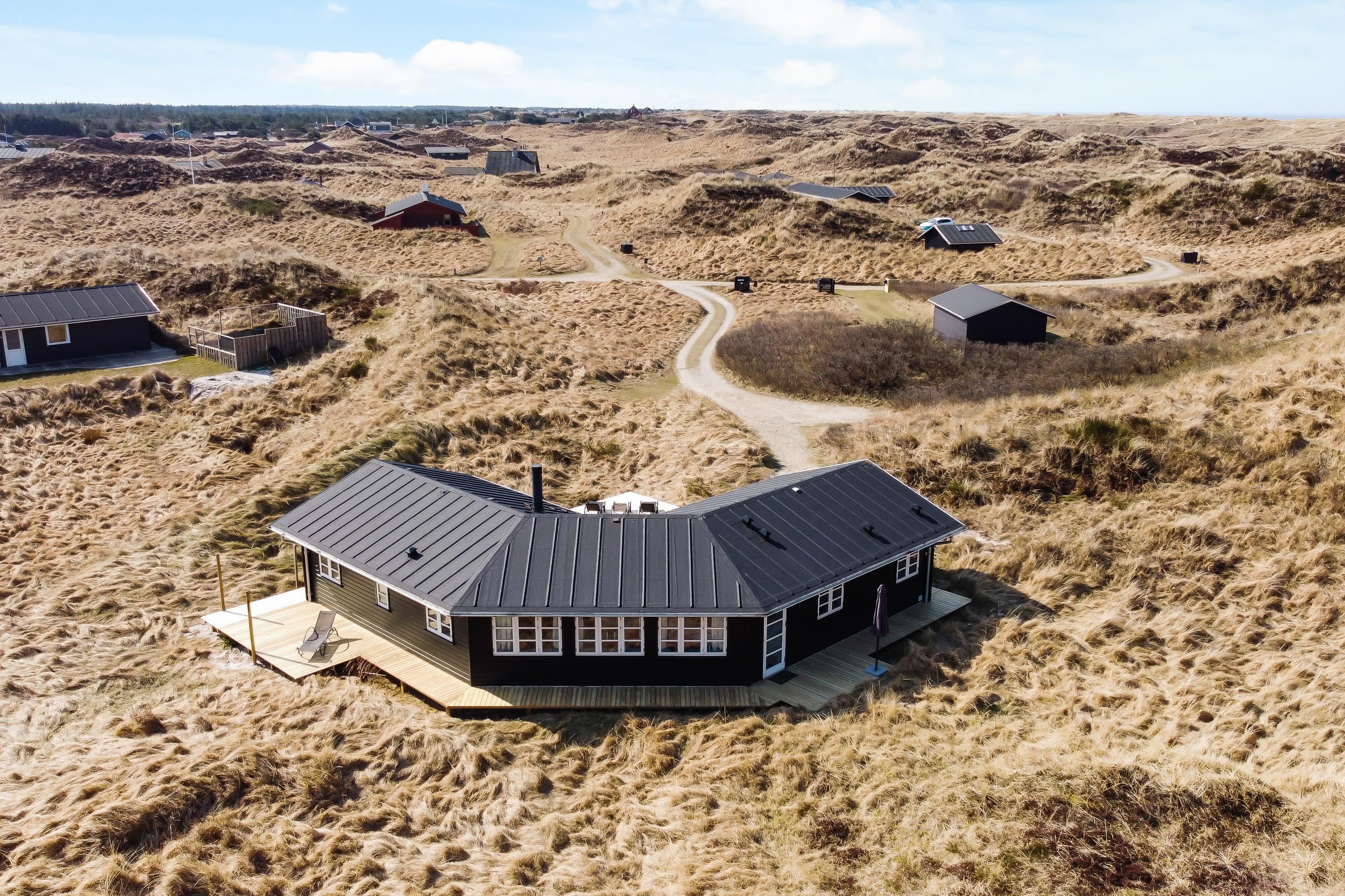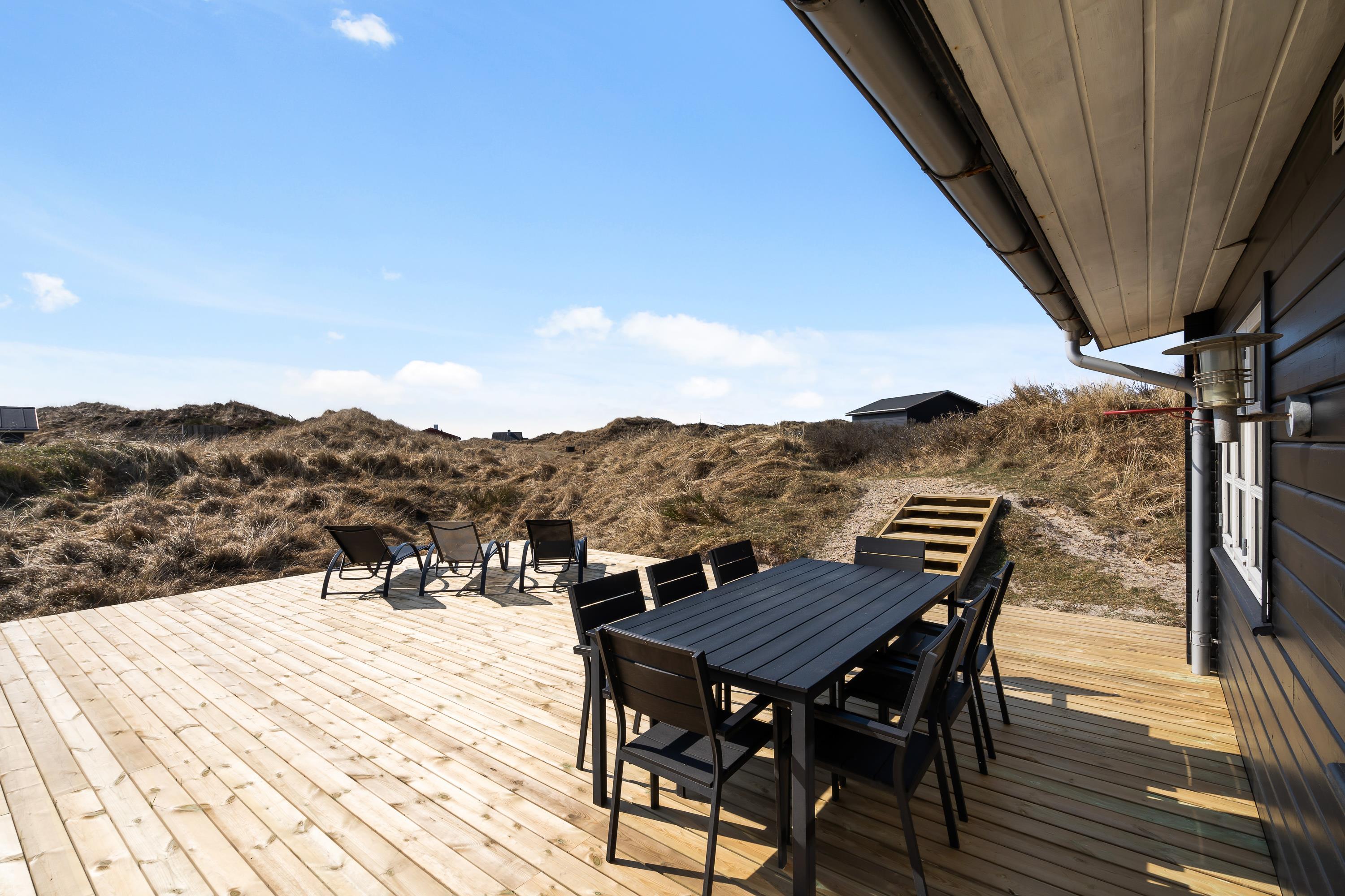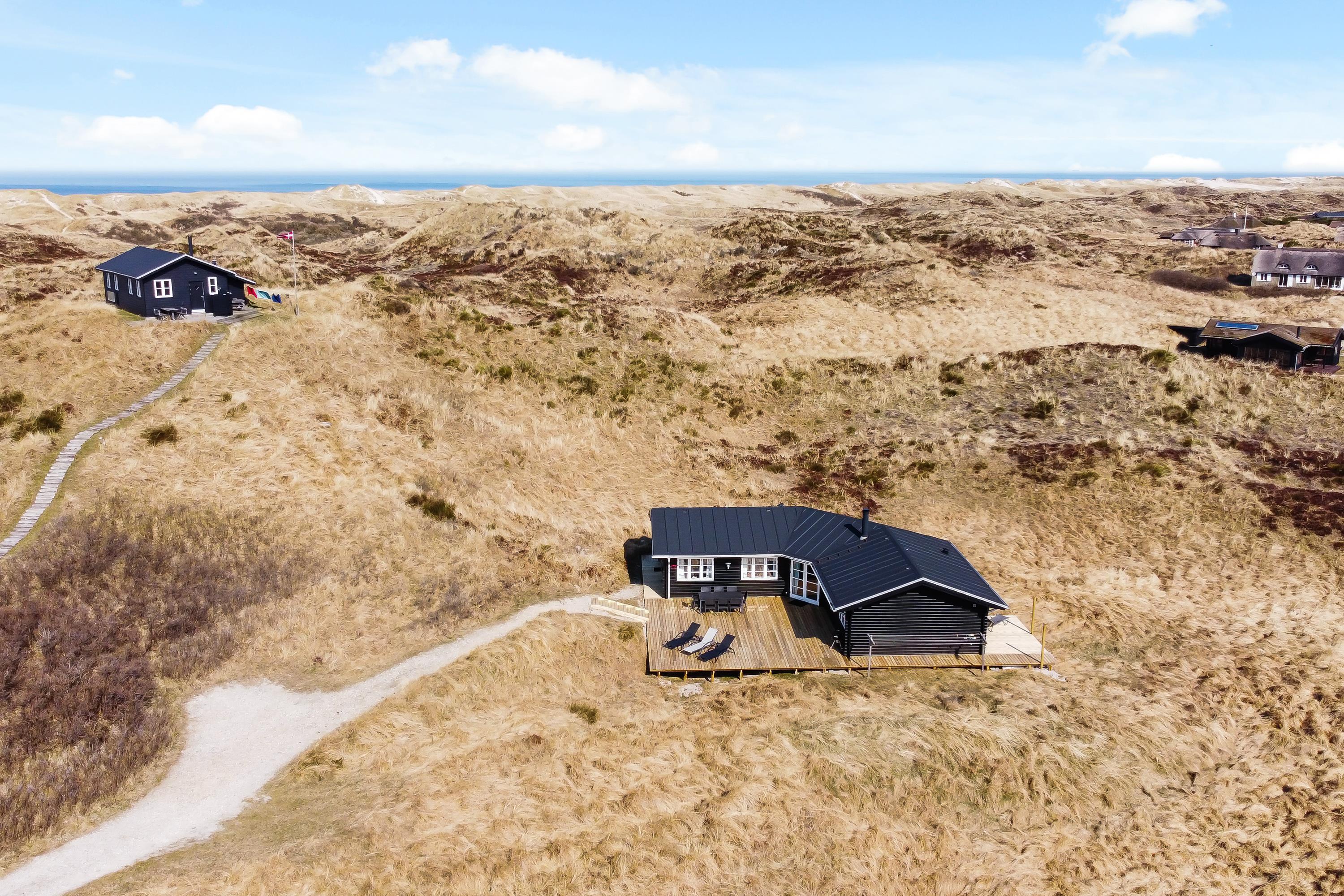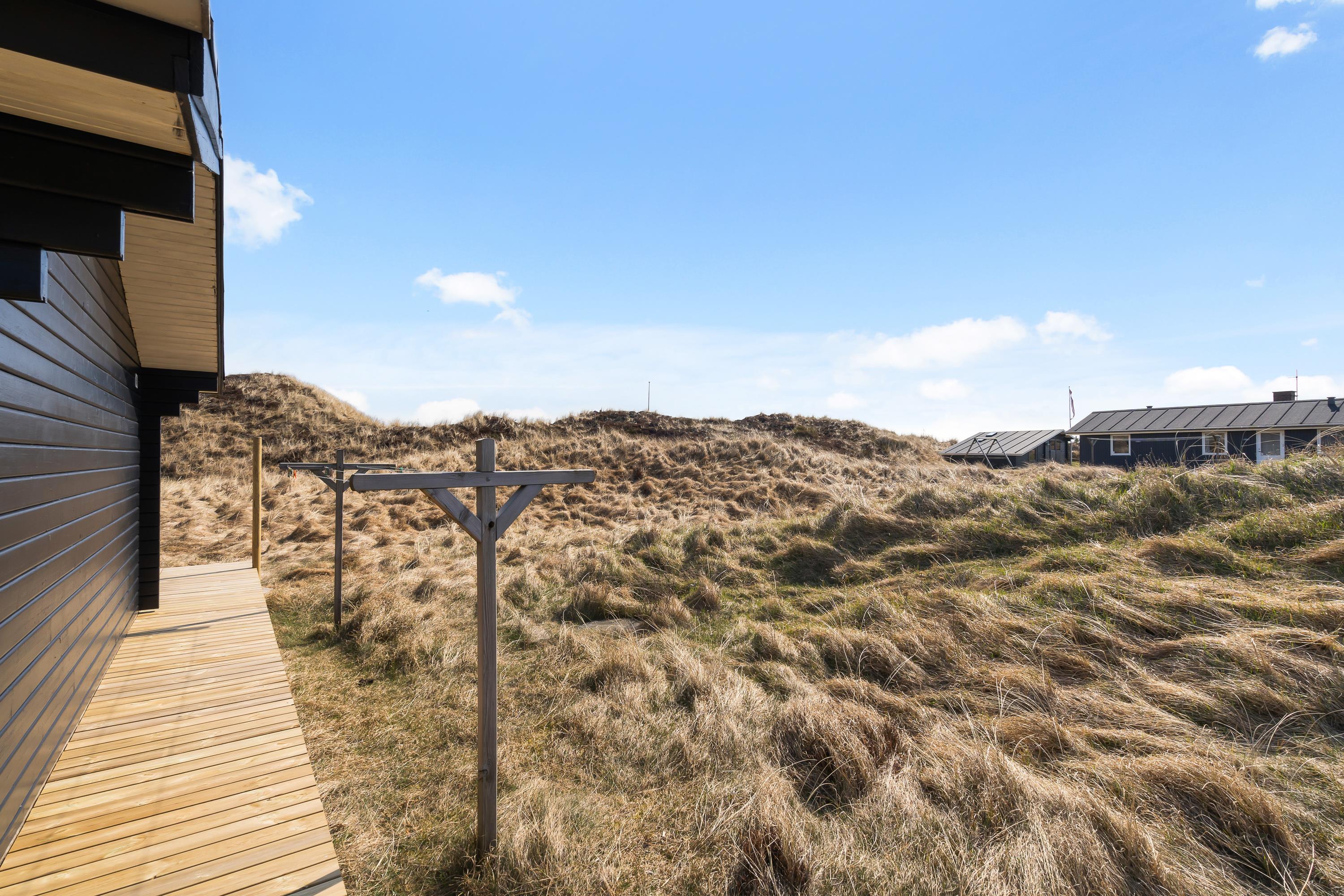 På Hjelmevej får I en rigtig dejlig beliggenhed i en lille gryde i klitterne. De høje klitter omkring jer sørger både for læ og fred, så I helt ugeneret kan sole jer på terrassen og grille i aftensolen.