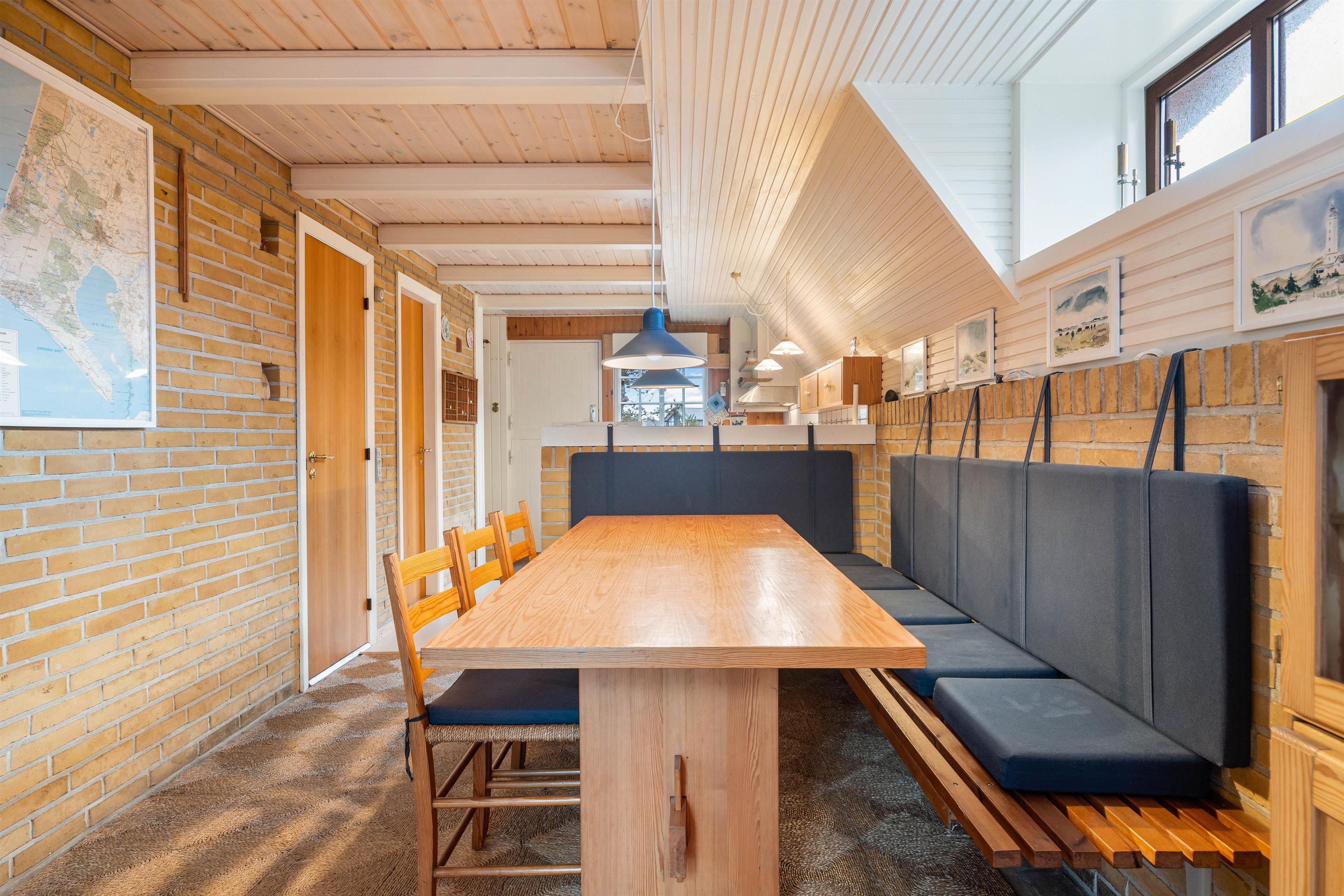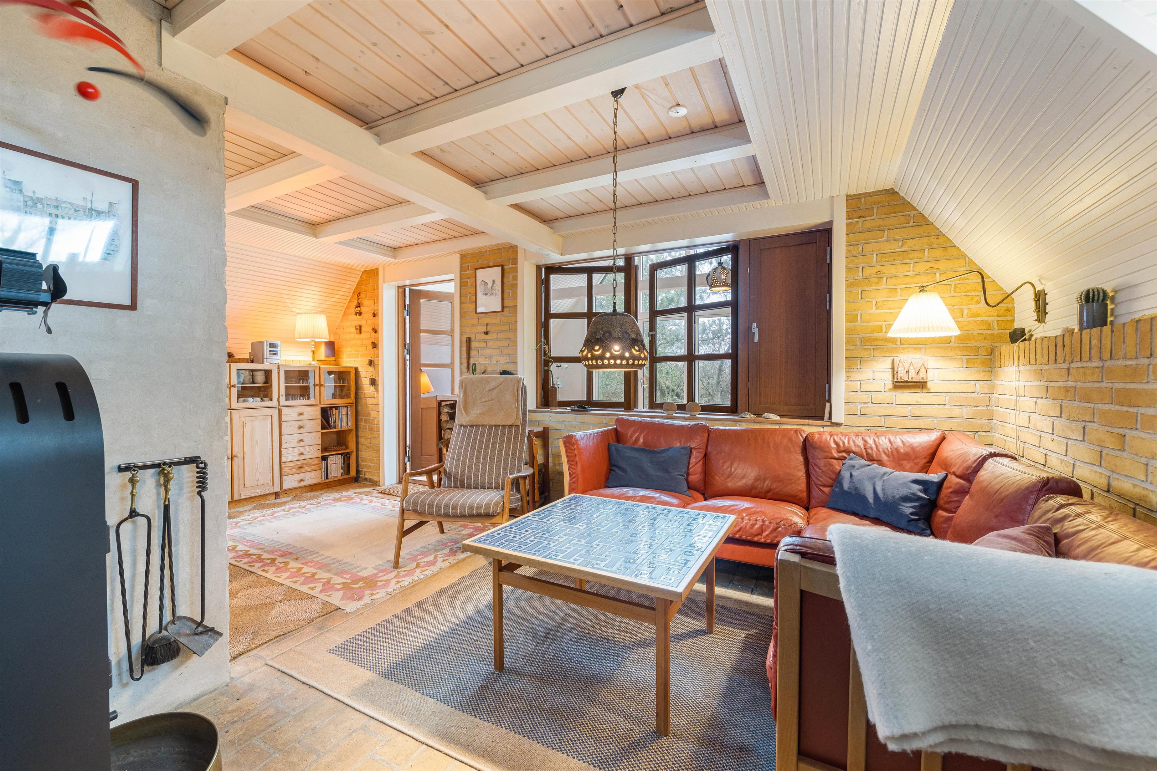 Fordelt på de 100m2, får I her et køkkenalrum hvor det veludstyrede køkken ligger i åben forbindelse til spiseplads og en hyggeligt indrettet stue. Her kan I samles om spisebordet med et brætspil, alt imens familiens kok tilbereder aftensmåltidet. Om aftenen kan I samles i sofamøblementet og se en god film, imens brændeovnen sørger for hygge og en god varme.