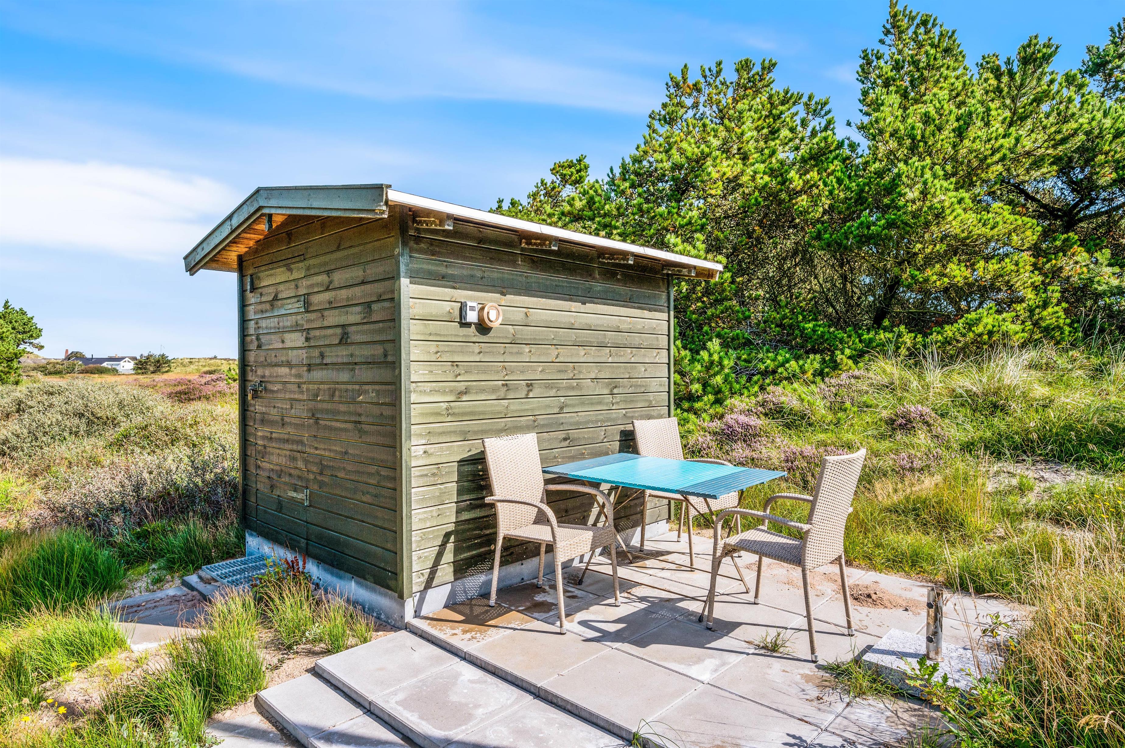 Sommerhuset ligger blot 400 meter fra det brusende Vesterhav, som nemt nås via et stisystem der slynger sig igennem de smukt bevoksede klitter. Alt efter årstiden, vil landskabet her variere fra en frisk lysegrøn i foråret til en dyb lilla i sensommeren, når lyngen står i fuldt flor.