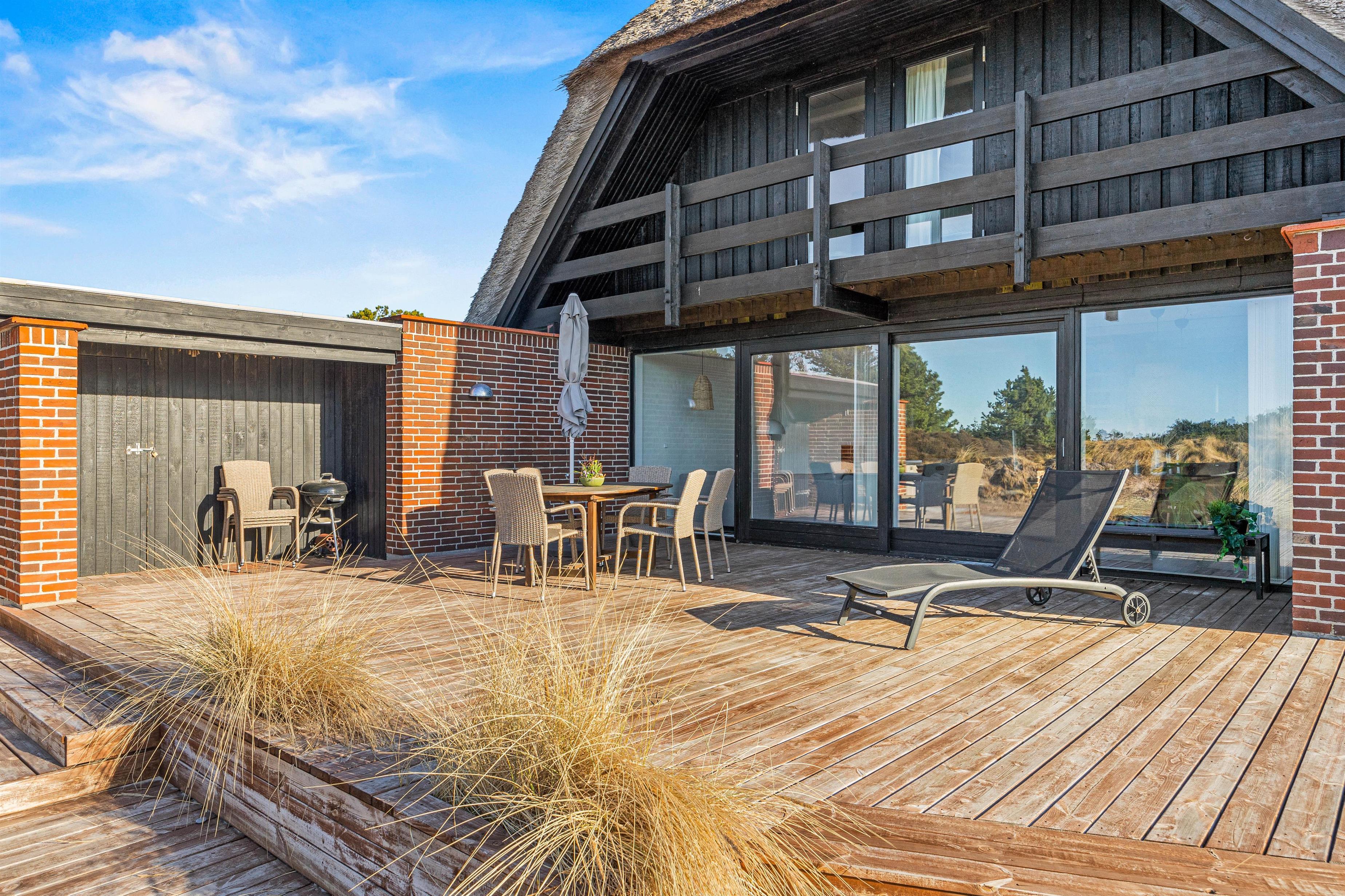 Drømmer I om at bo midt i den vestjyske hede, omgivet af flot natur og kort vej fra stranden? Så er dette stråtækte sommerhus i Grærup en mulig kandidat til jeres næste ferie. Det røde murstenshus er indrettet til 8 personer, og hundene kan også komme med på ferie her. Nyd udsigten fra de afskærmede terrasser – eller fra balkonen, der giver et ekstra flot panoramaudsyn til landskabet.