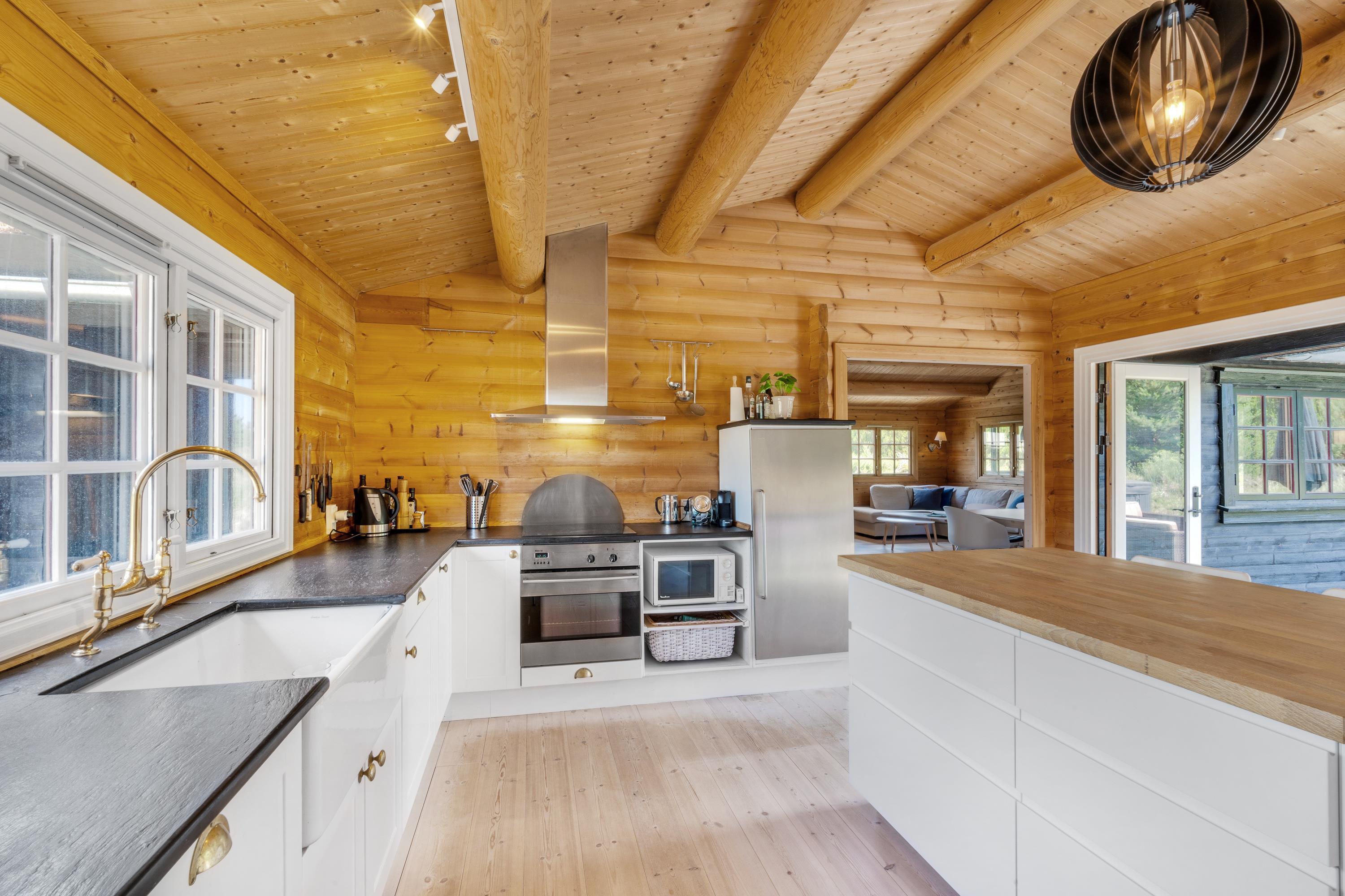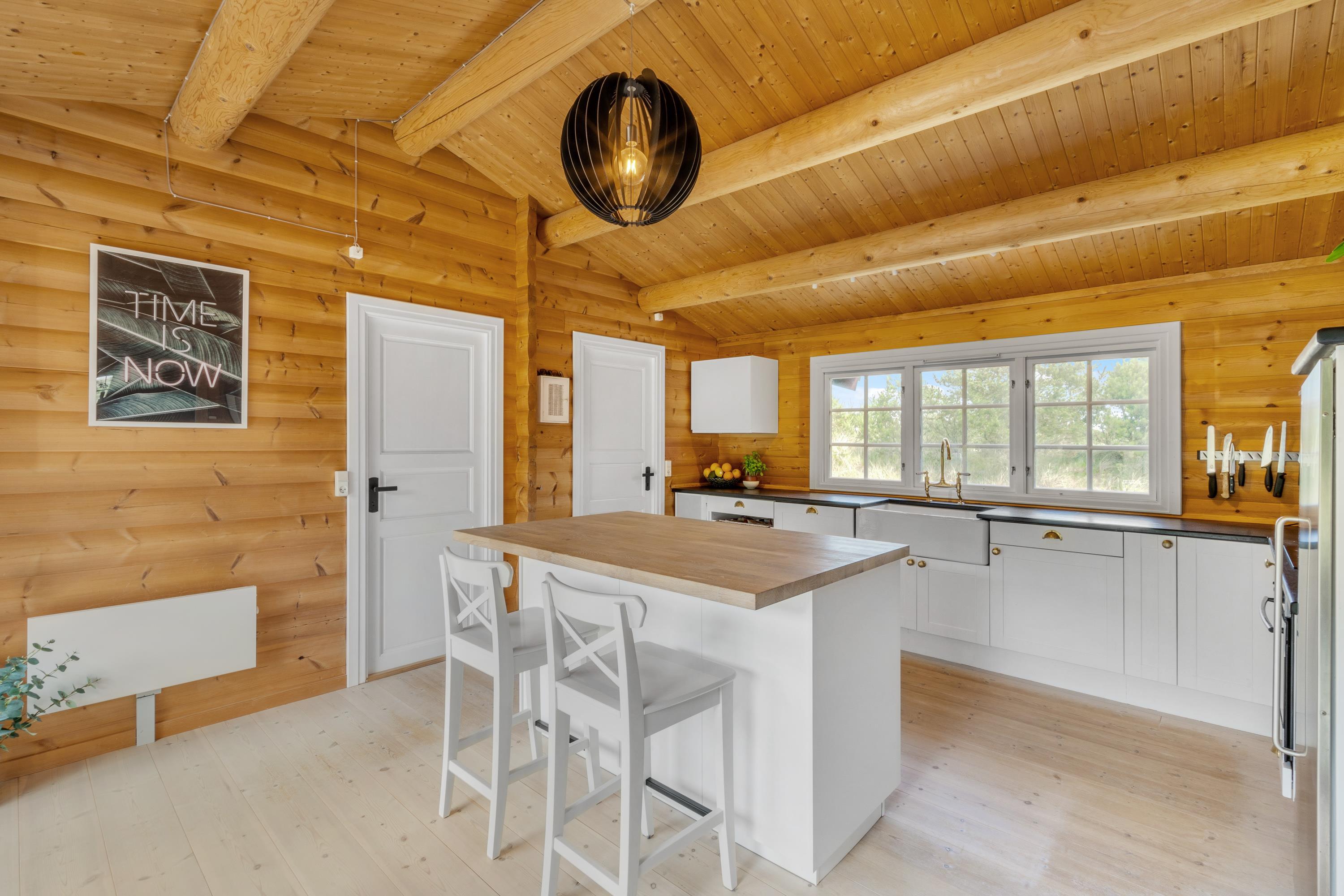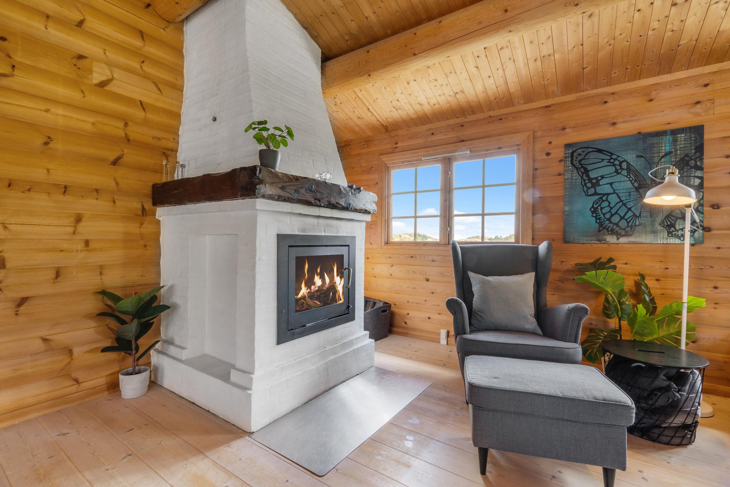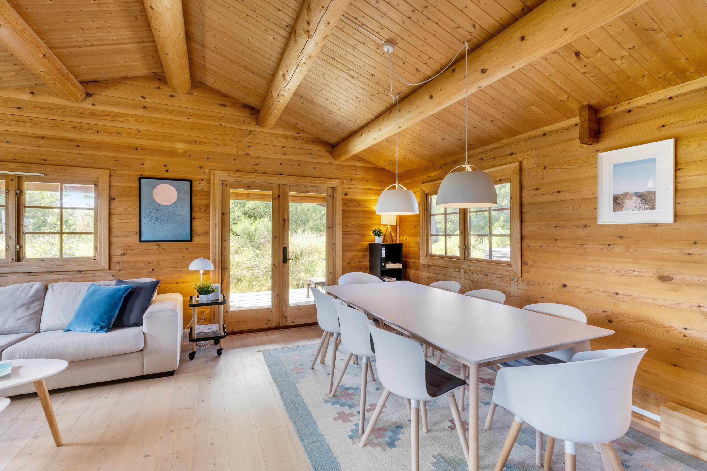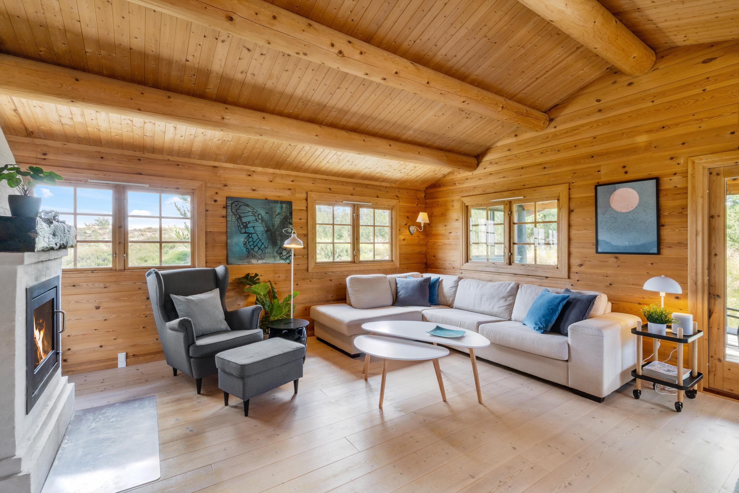 Feriehuset byder på et charmerende og rummeligt indre, hvor naturmaterialer i varme farver sørger for at skabe den helt rigtige atmosfære. I det store opholdsrum står brændeovnen klar til at sprede ekstra varme og feriestemning på de kølige dage og sene aftener.