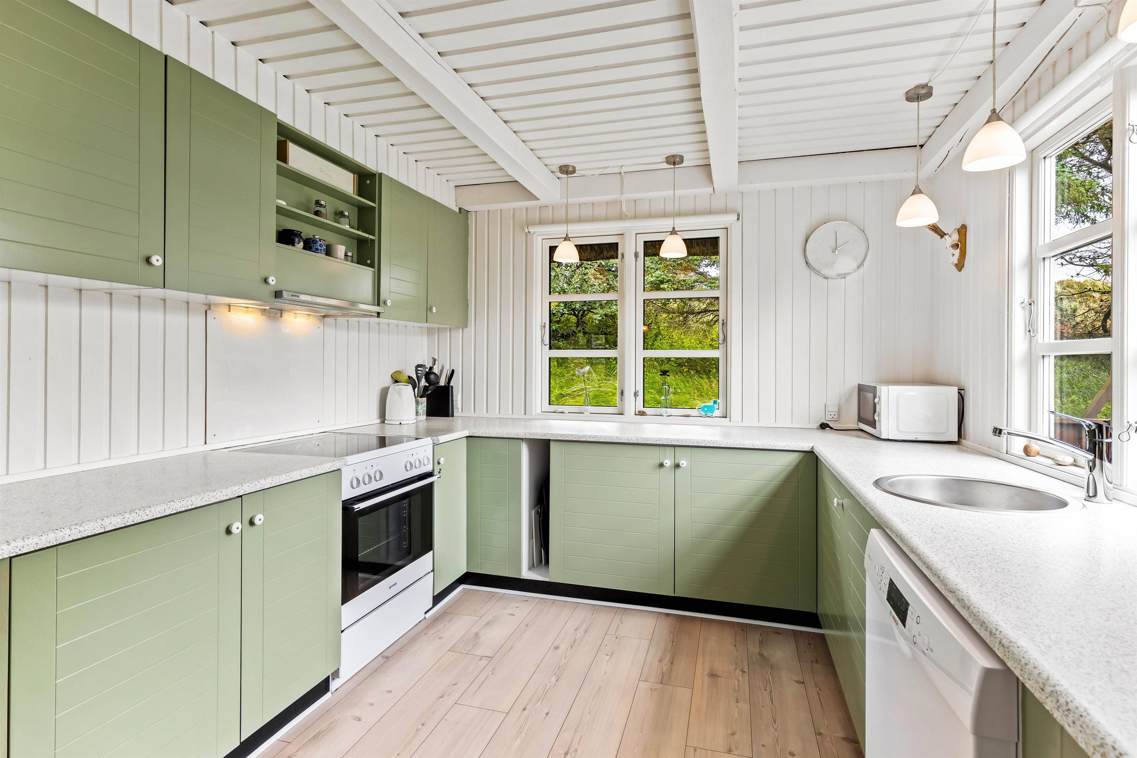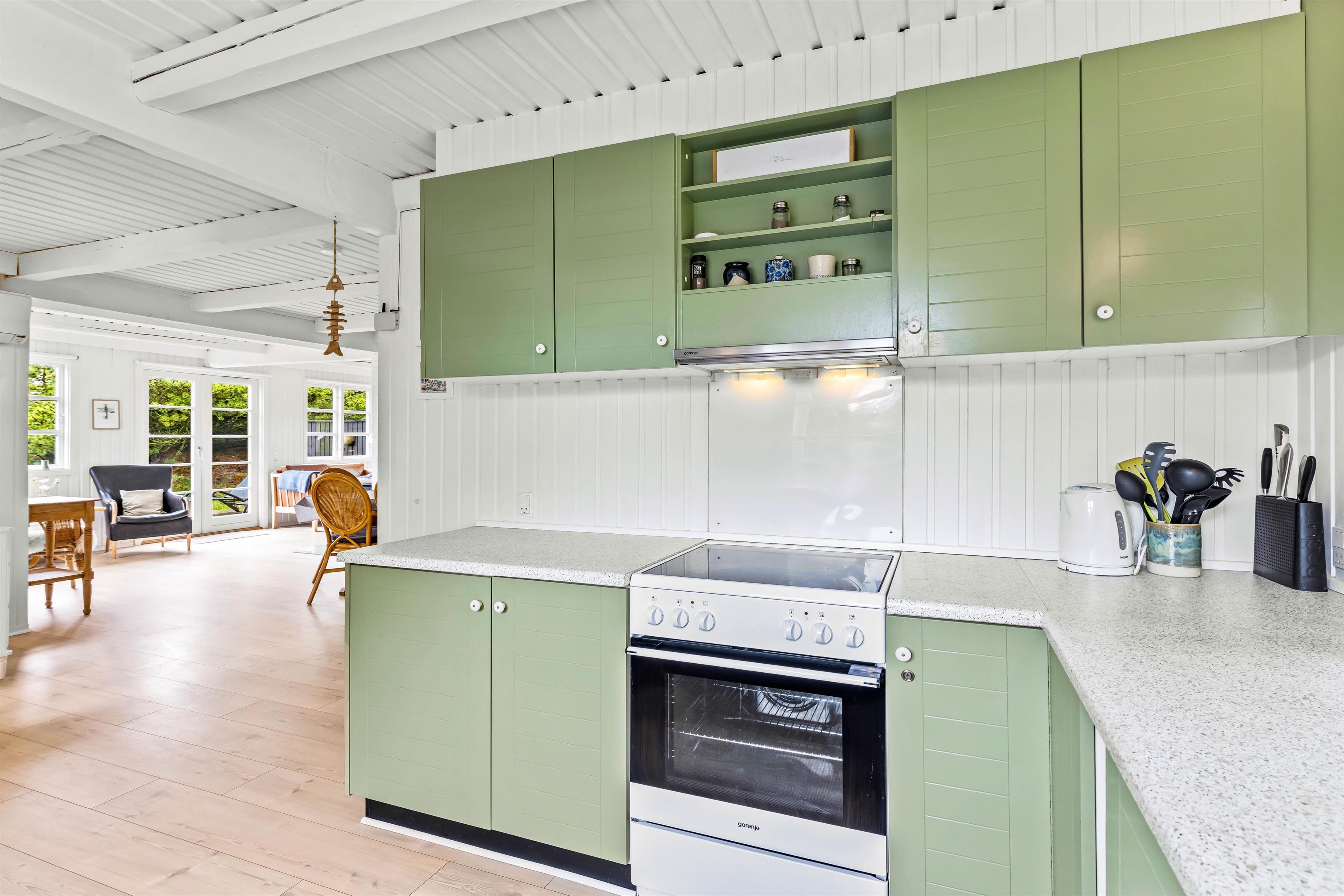 Aftensmaden kan tilberedes i køkkenet, som er udstyret med opvaskemaskine. Dermed slipper I for den helt store oprydning, og der er tid til mere hygge med resten af familien.