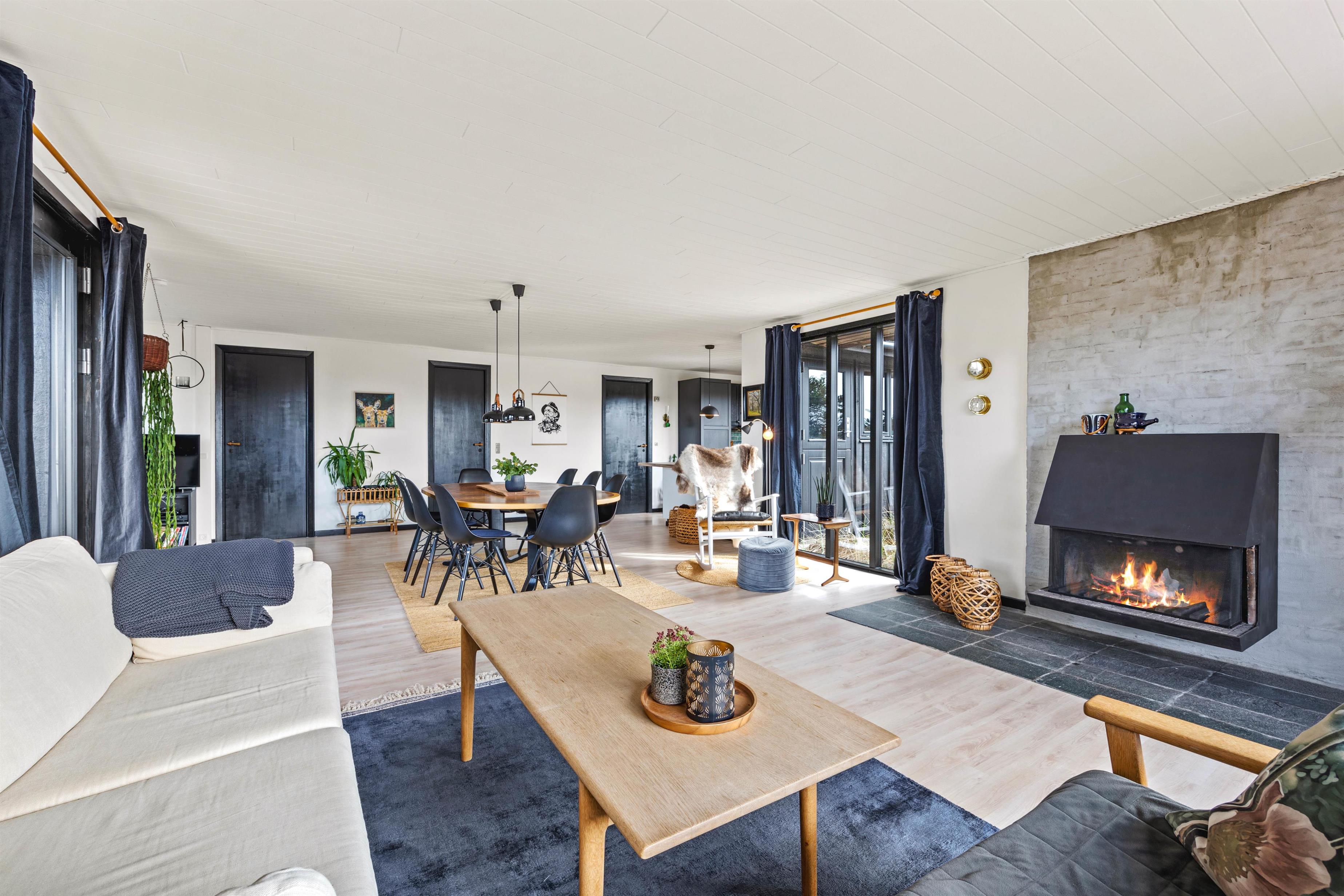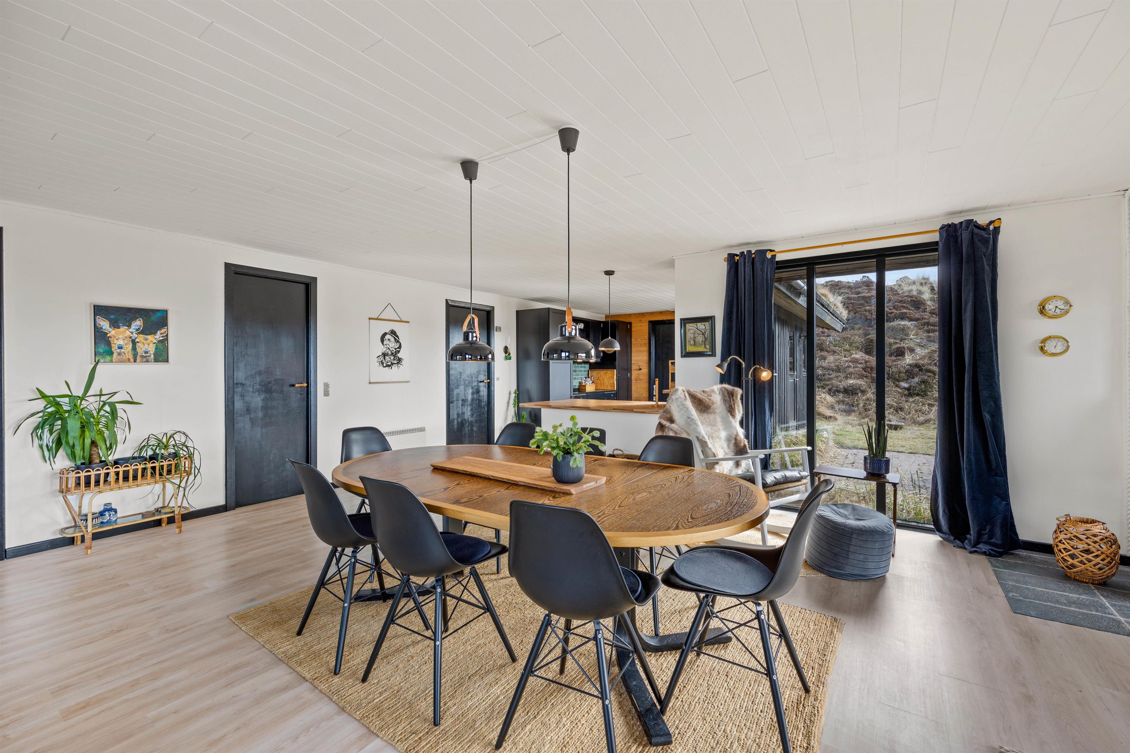 Straks ved ankomsten bydes I velkommen af feriehusets helt specielle, rustikke stemning. Her er kræset for detaljerne med materiale- og farvevalg af høj kvalitet. Det åbne køkken i forbindelse med stuen bliver jeres naturlige samlingssted. De brede vinduespartier mod både syd, øst og vest giver dagen lang et rigtig fint lysindfald. Fra siddepladserne ved det ovale spisebord kan I både følge med i, hvad der sker i køkkenet og i den hyggelige sofagruppe ved brændeovnen.