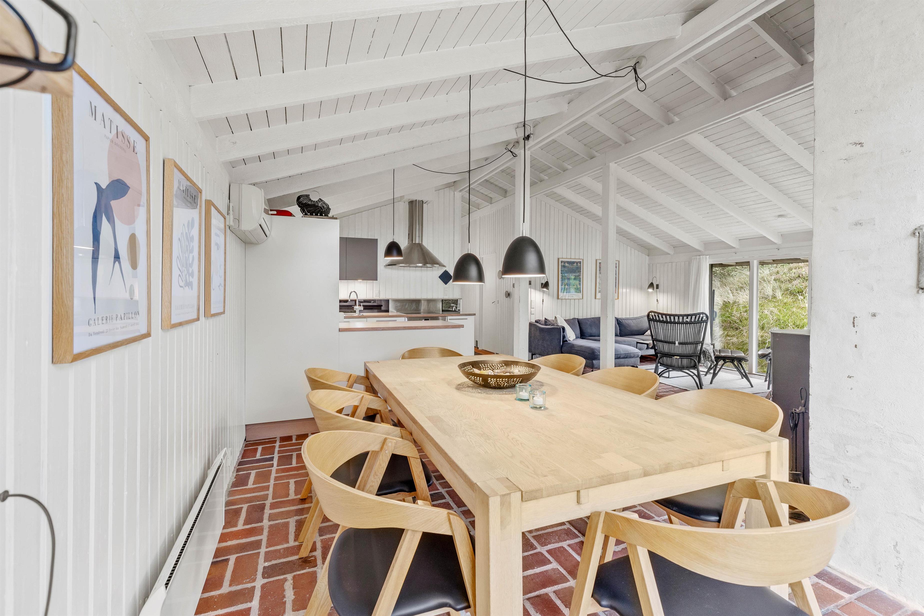 Sommerhusets læfyldte terrasse udgør en rigtig hyggekrog på de solrige dage og lægger op til masser af tid udendørs. I kan for eksempel anrette frokosten ved havebordet eller tilberede en god middag på grillen i aftensolen. Terrassen har desuden en afskærmet og overdækket del, så I kan nyde omgivelserne og den friske luft i stort set alt slags vejr.