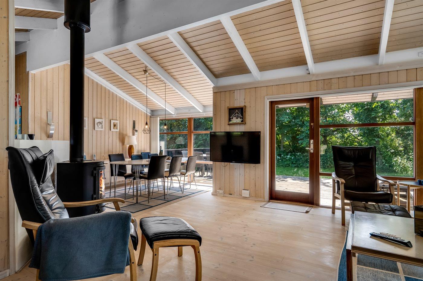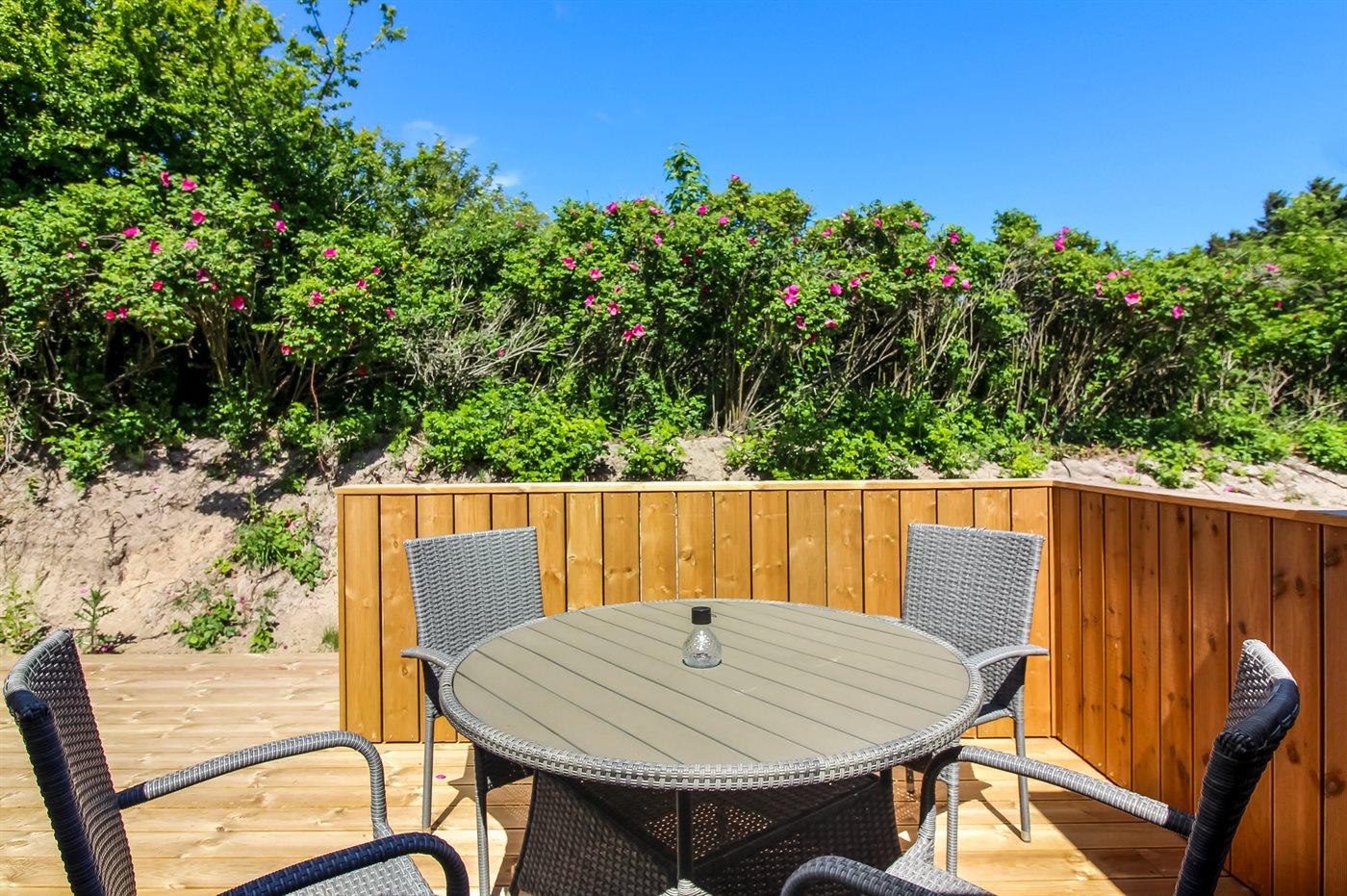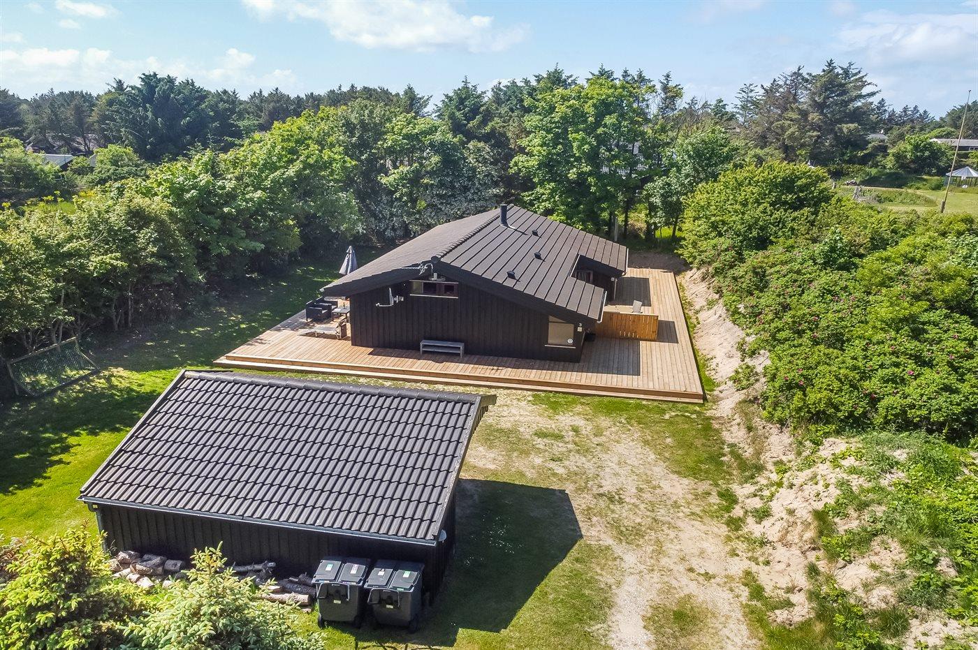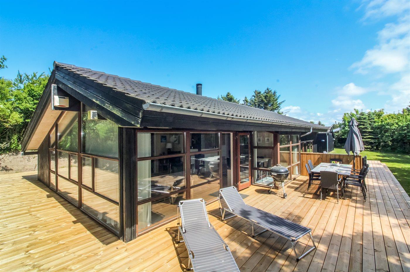Huset ligger i dejlige Grønhøj på en ugenert grund med mange skønne terrasser, som fordeler sig omkring huset. Her er der næsten altid mulighed for at finde sol, læ og ro til at nyde ferien med en god bog eller se de yngste boltre sig i haven. Sommerhuset ligger kun en kort gåtur fra stranden og her kan man rigtig nyde de åbne vidder og skulle vinden bide lidt, så kan man glæde sig til at komme hjem til huset og varme sig ved brændeovnen med lidt varm kakao.