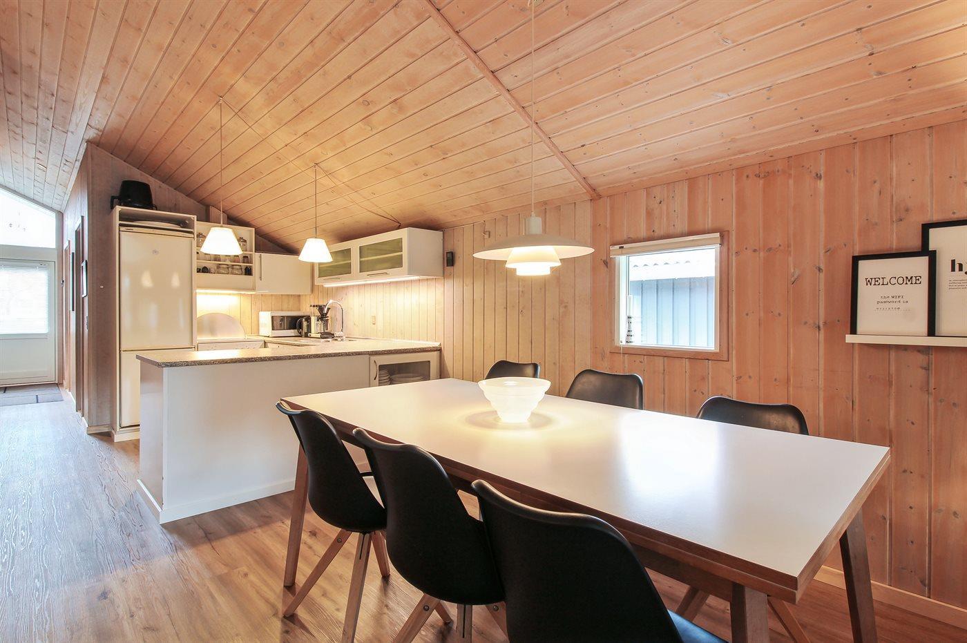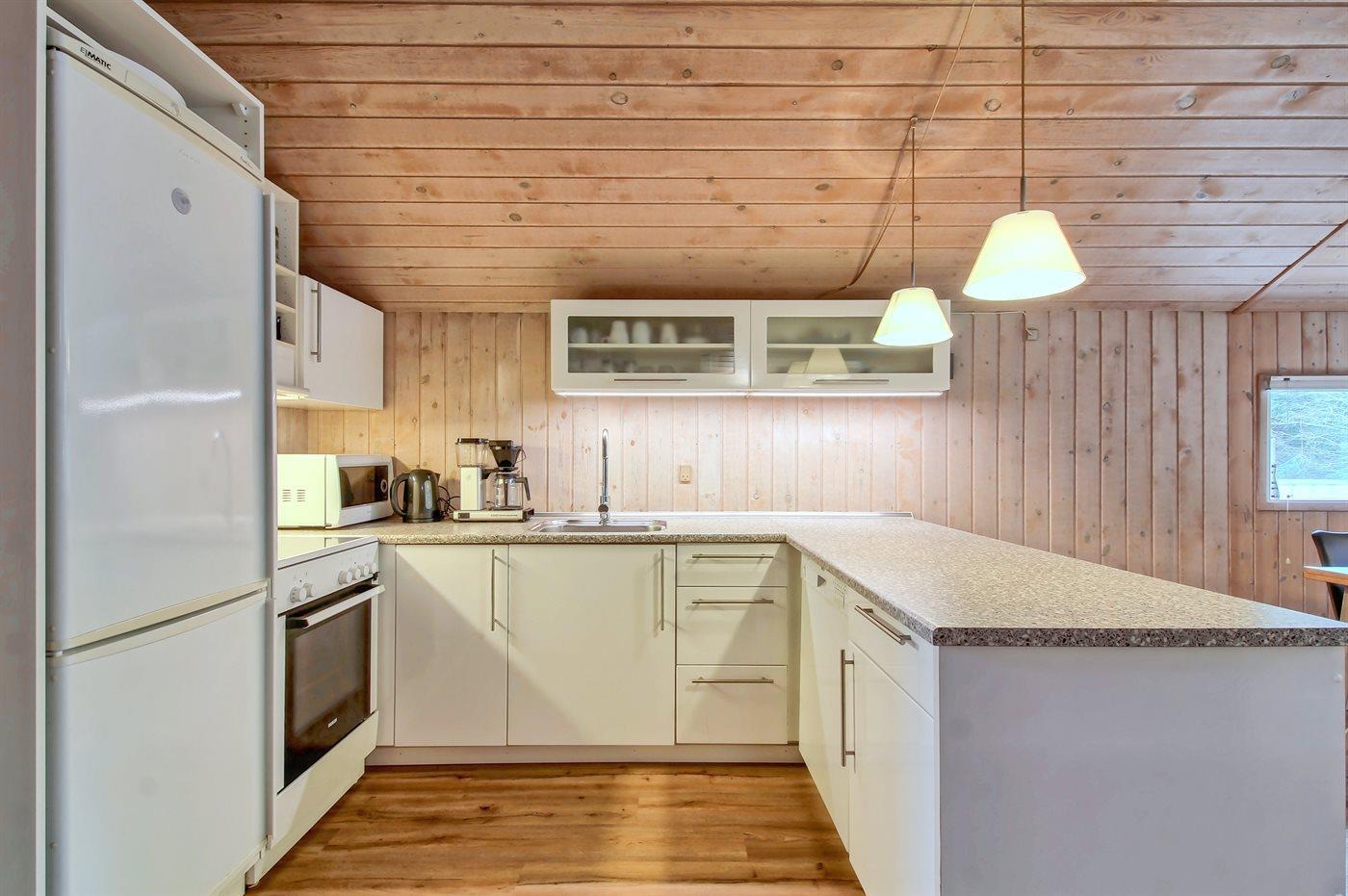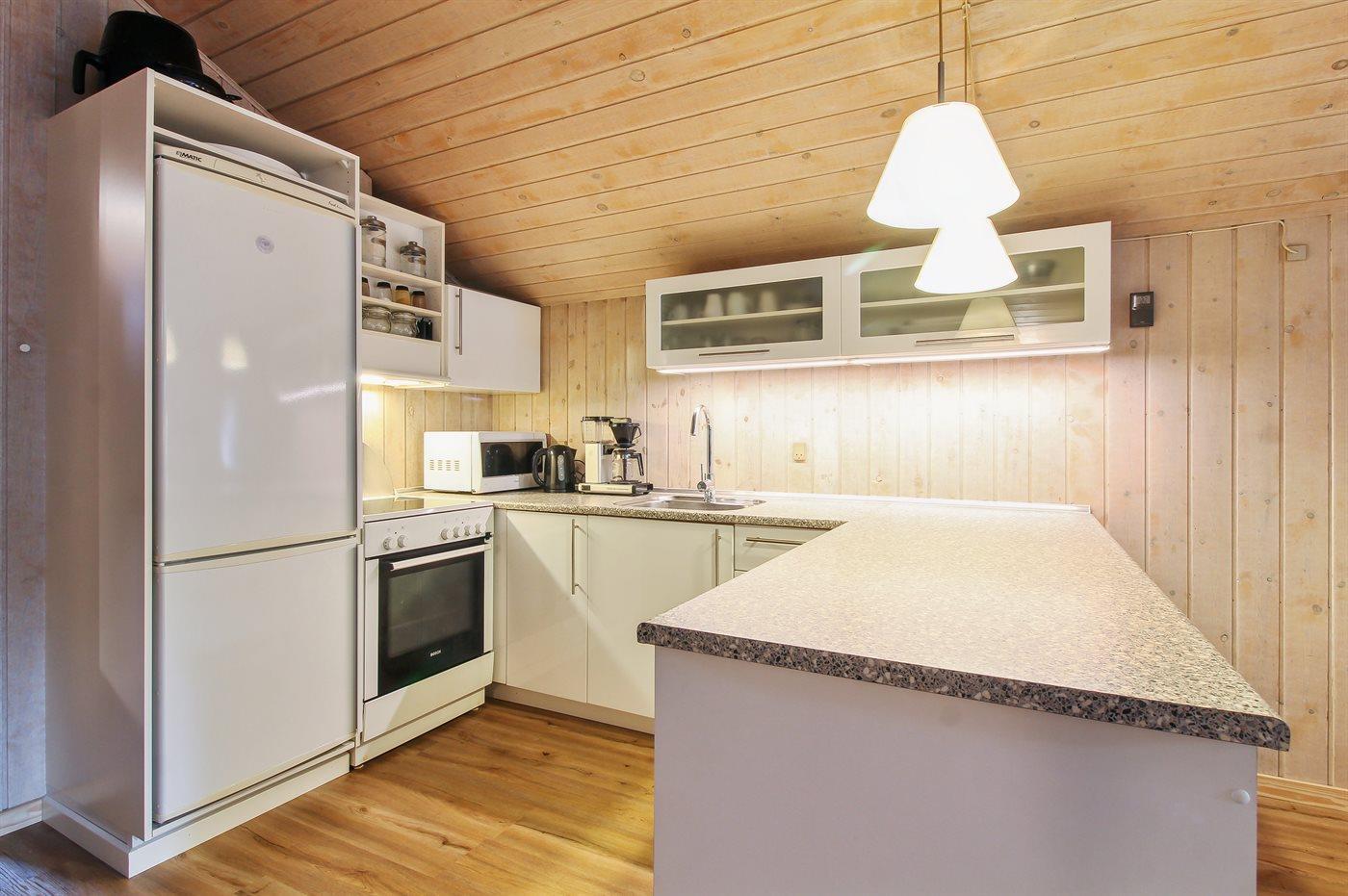 Køkkenet er udstyret med 1 køleskab. Der er 4 keramiske kogeplader, varmluftovn samt opvaskemaskine.