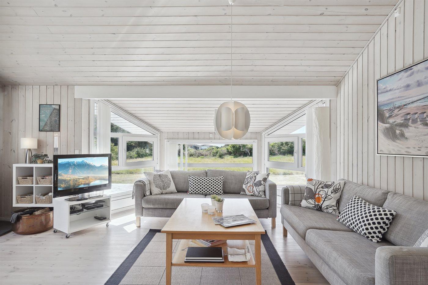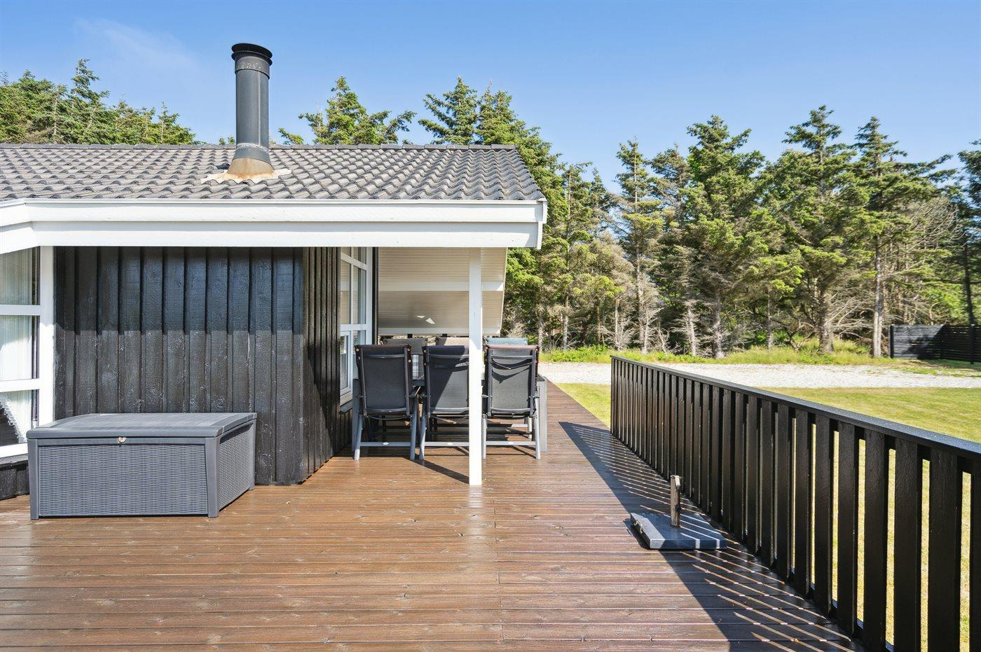 Velholdt sommerhus med en dejlig beliggenhed på en meget stor grund, der delvist er omkranset af høje træer. Fra husets terrasse er der havkig til Vesterhavets blå bølger. For enden af vejen fører en sti gennem klitterne direkte ned til den fantastiske hvide sandstrand i Grønhøj.