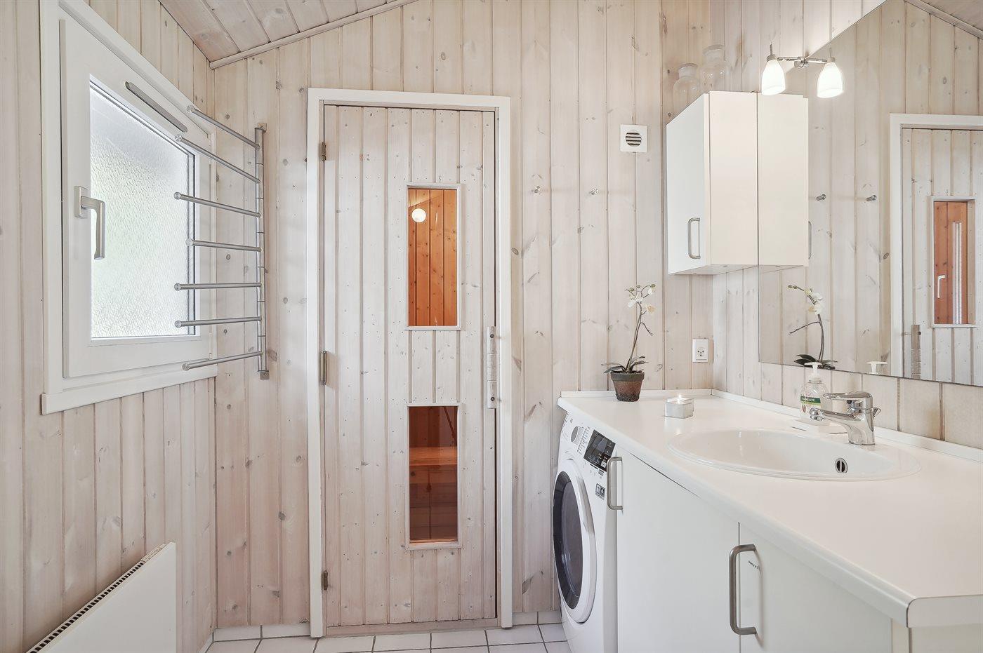 Der er 2 badeværelser med bruseniche og 2 toiletter. Der er gulvvarme på 1 badeværelse. I saunaen er der mulighed for afslapning.