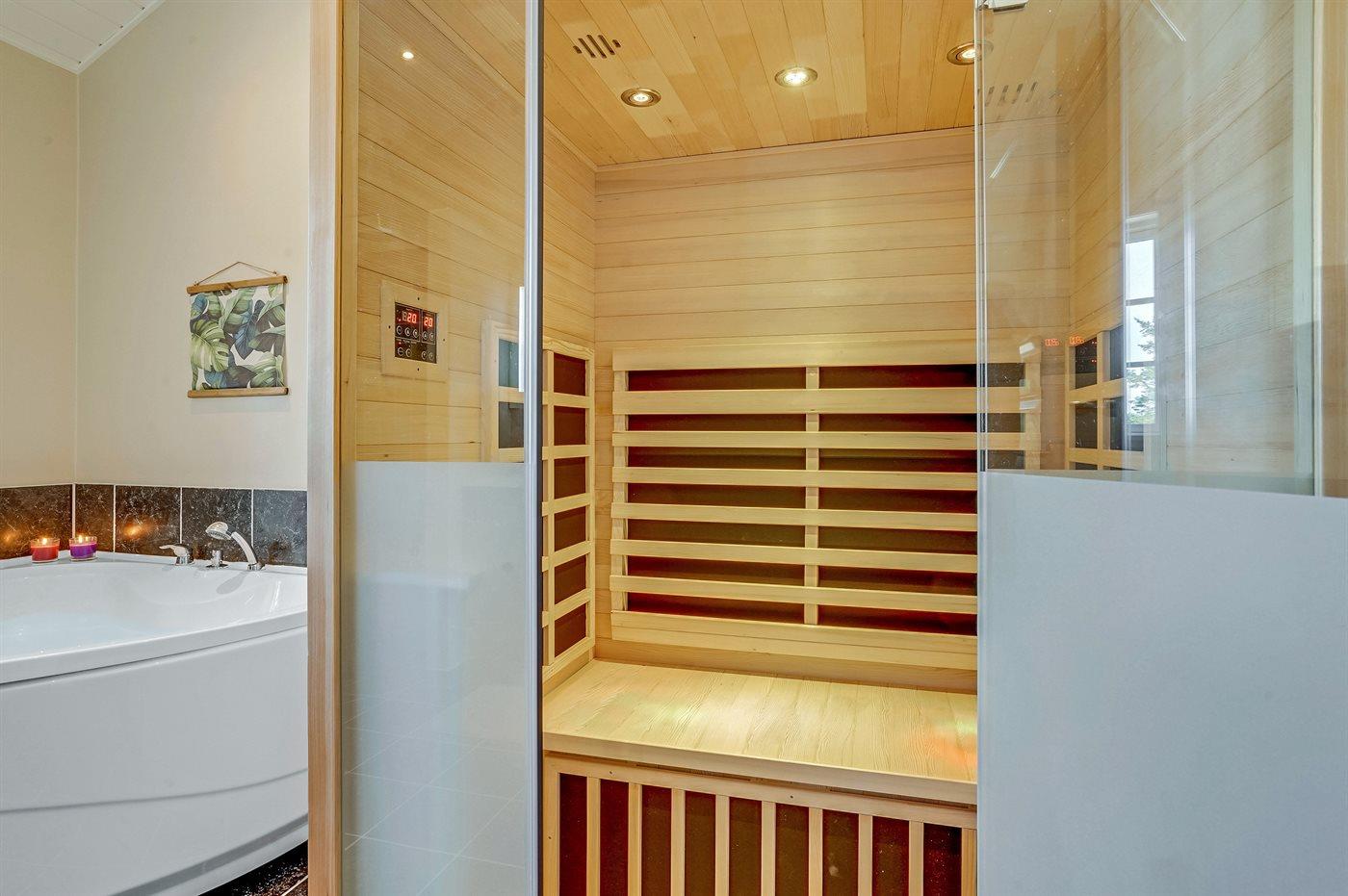 Der er 3 badeværelser med bruseniche og 3 toiletter. Der er gulvvarme på 3 badeværelser. I den infrarøde sauna er der mulighed for afslapning.