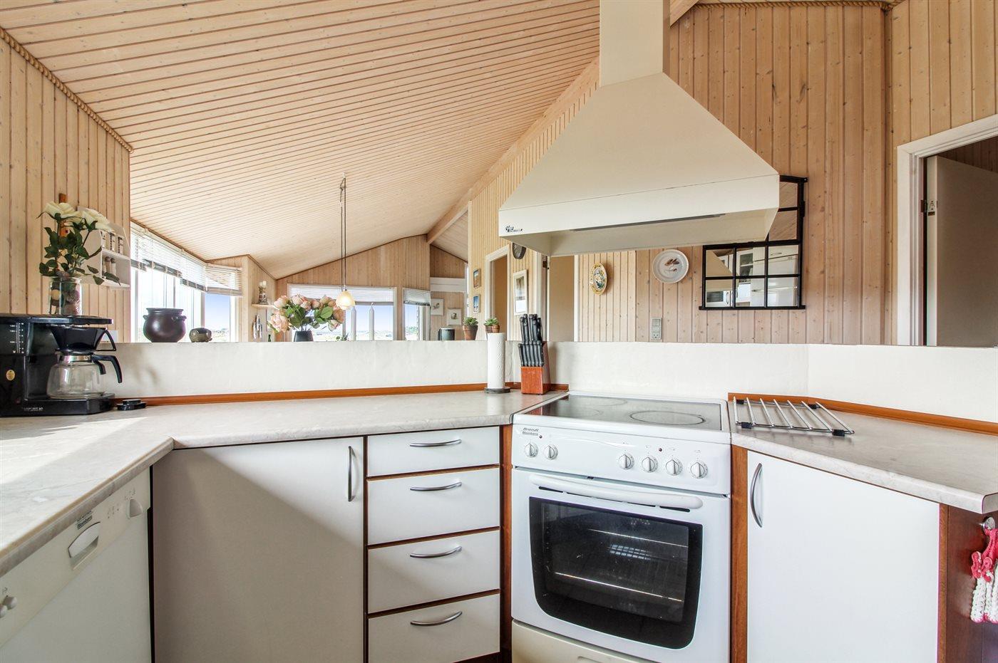 Køkkenet er udstyret med 1 køleskab. Der er 4 keramiske kogeplader, varmluftovn, mikrobølgeovn samt opvaskemaskine.