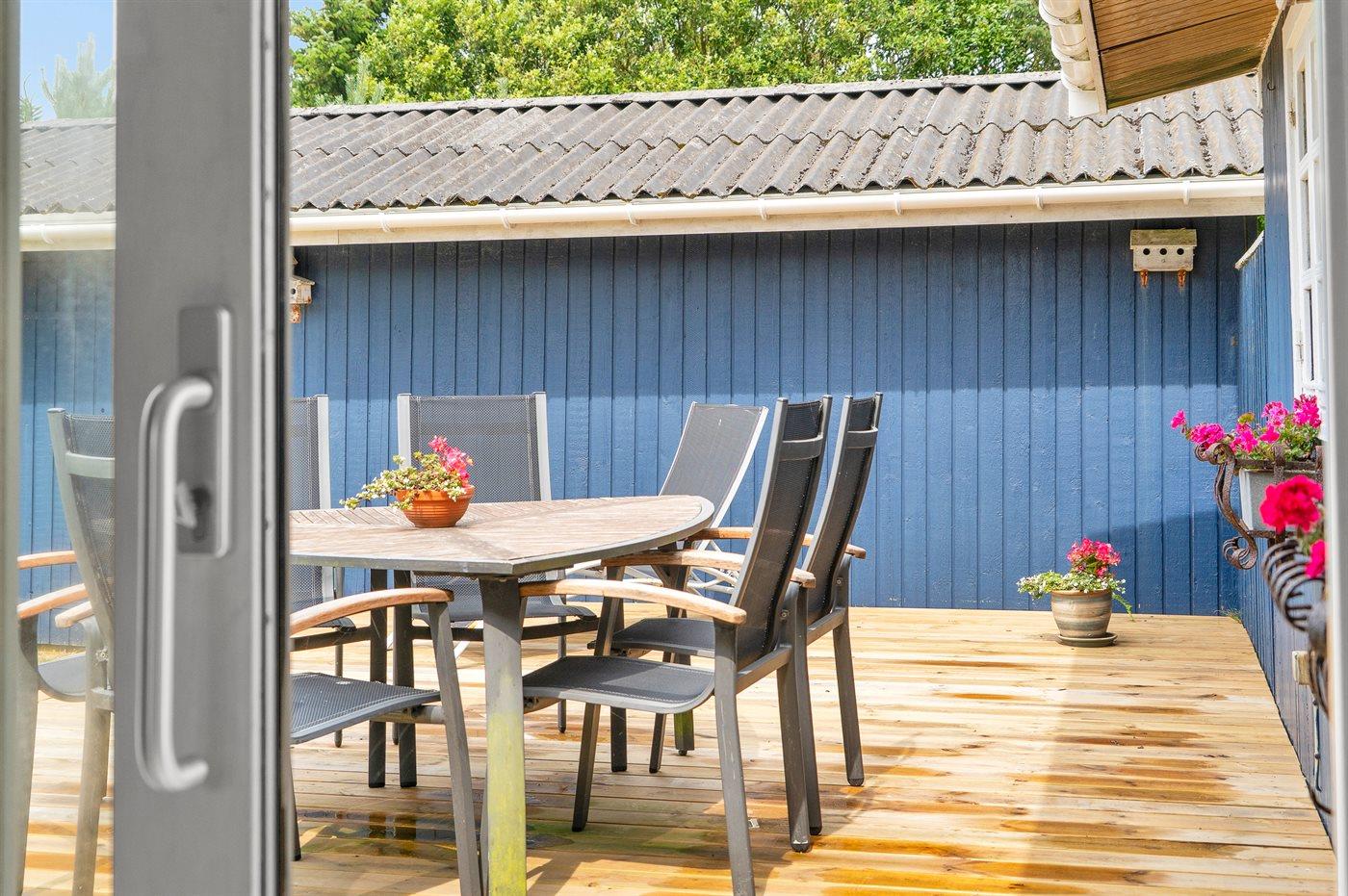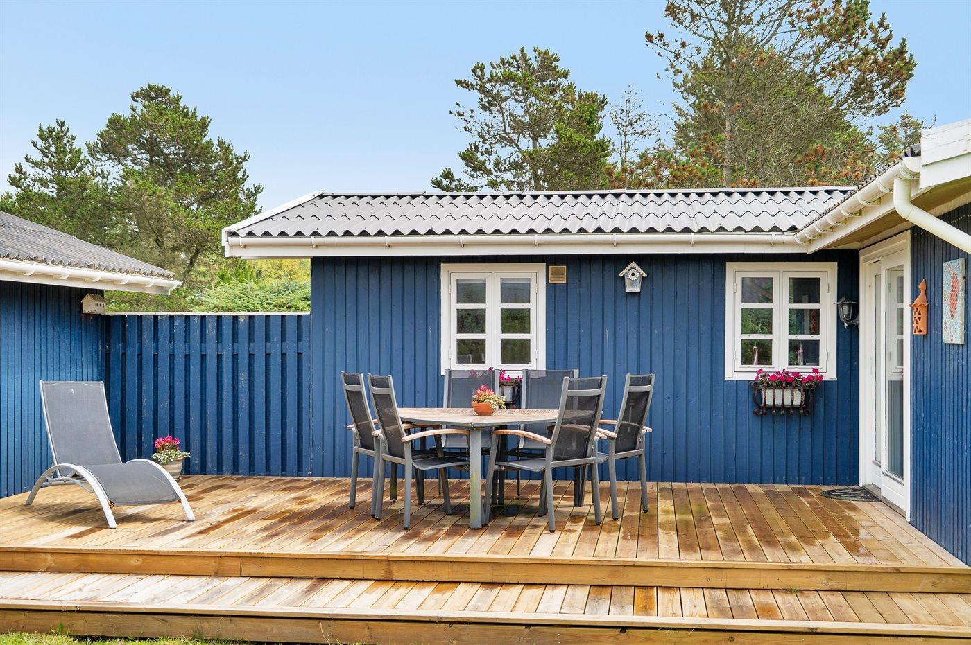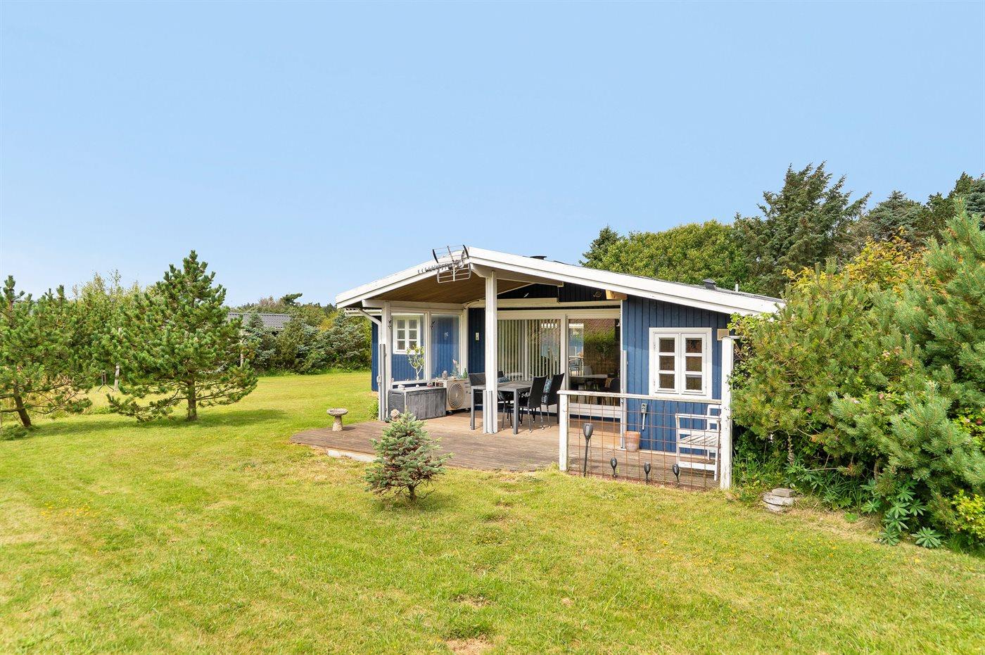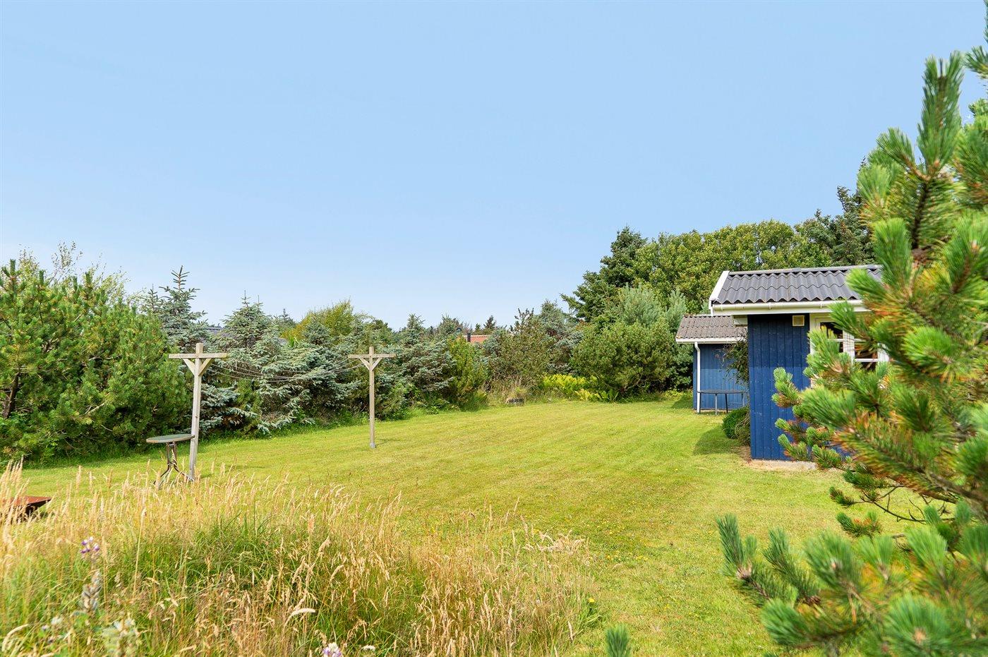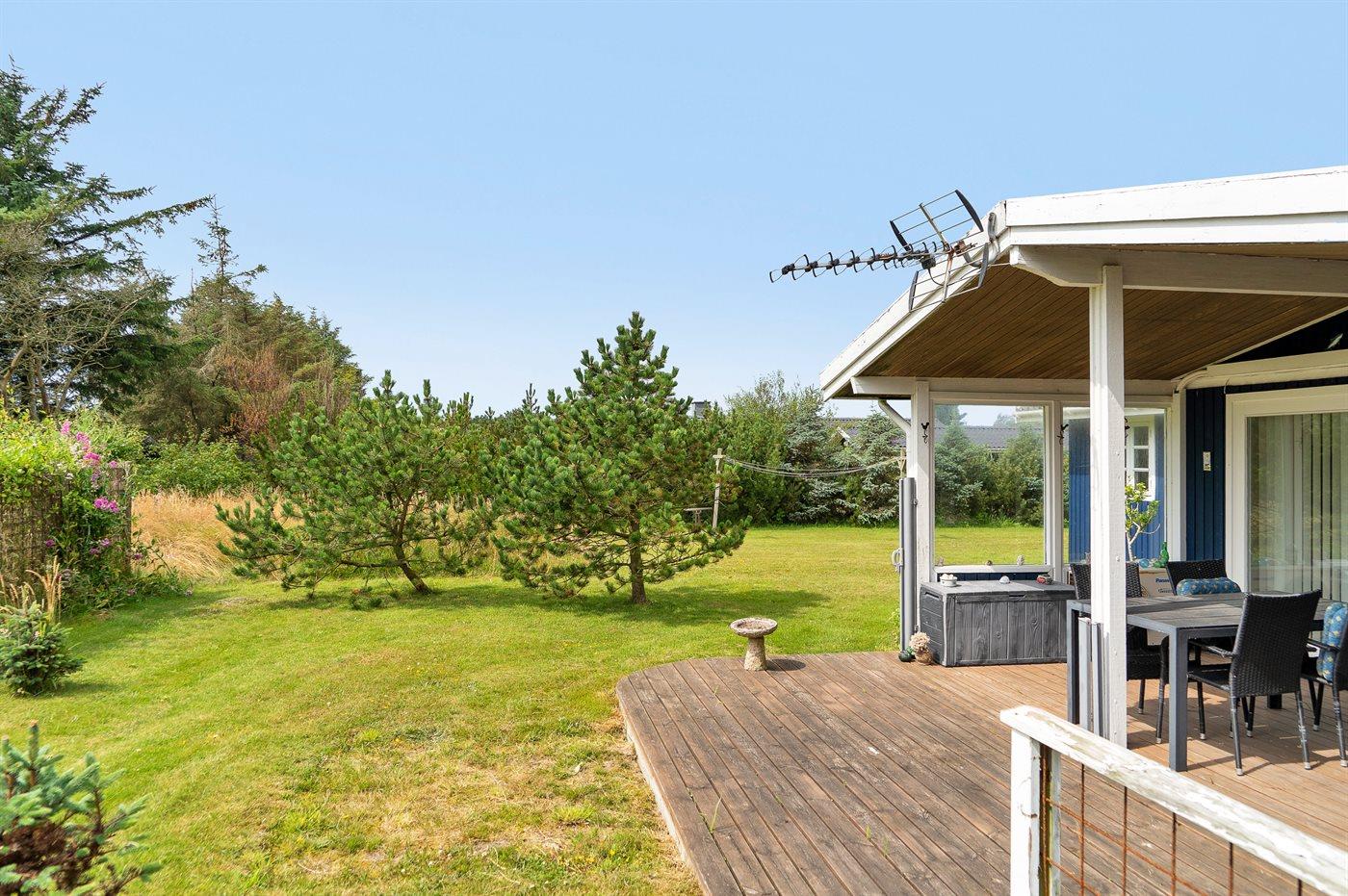 Ferieboligen er beliggende på en 1295 m² stor naturgrund. Der er 700 m til havet. Nærmeste forretning er beliggende i en afstand af 700 m. Til ferieboligen hører åbent terrasseareal. Desuden er der overdækket terrasse. Sandkasse. Bålsted. Udendørs bruser. Grill til rådighed. Der er installeret stik til opladning af elbil. Type 2 stik. Med 11 kW ladeeffekt. Parkering ved ferieboligen.