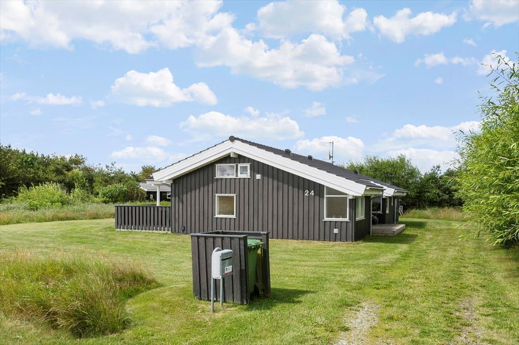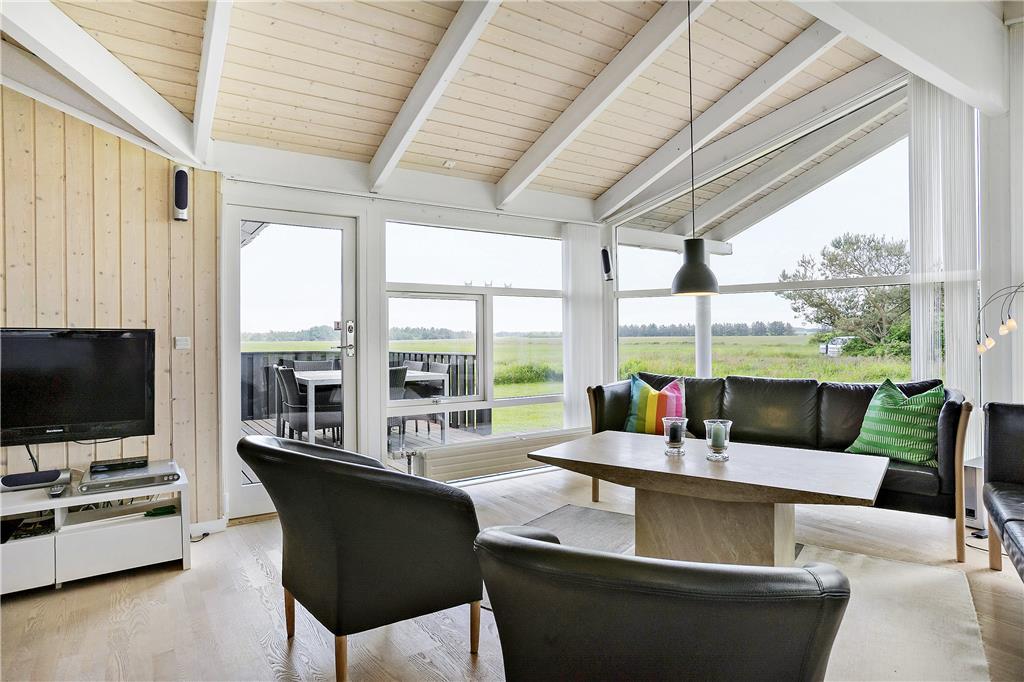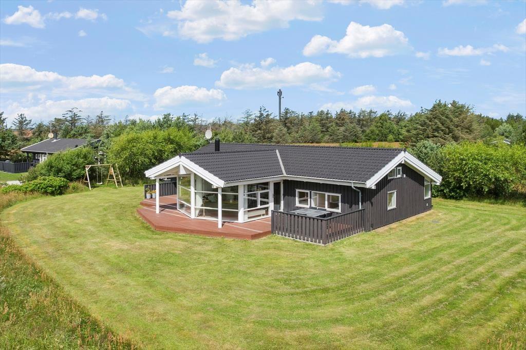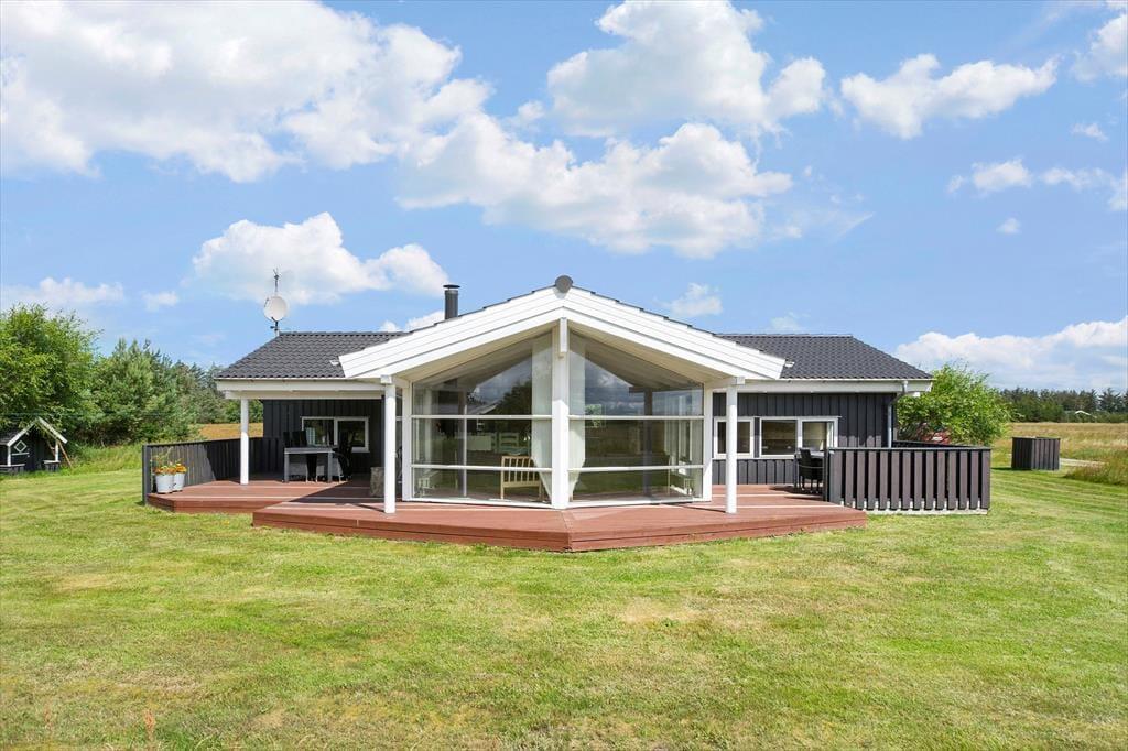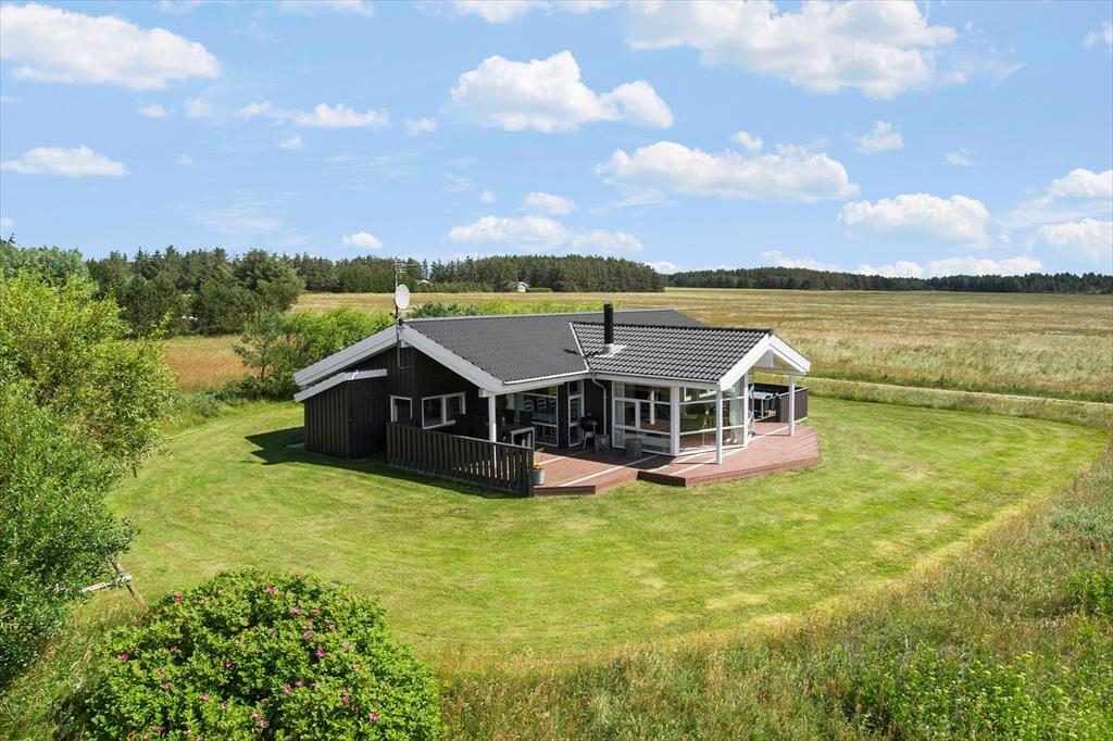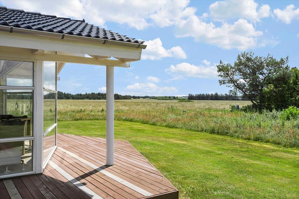 Dette luksuriøse liebhaverhus ligger på en stor og velholdt plænegrund i natursmukke omgivelser og med åbne vidder og herlig udsigt foran huset. En virkelig rolig og natursmuk beliggenhed, hvor der er masser af plads til at lege og tumle og derudover en gynge og sandkasse til børnene. På de flotte træterrasser som blandt andet løber på syd, øst og vest siden af sommerhuset, kan man altid fange solen dagen lang, og om aftenen kan man sidde under de delvise overdækkede terrasser og nyde et dejligt måltid mad tilberedt på grillen.