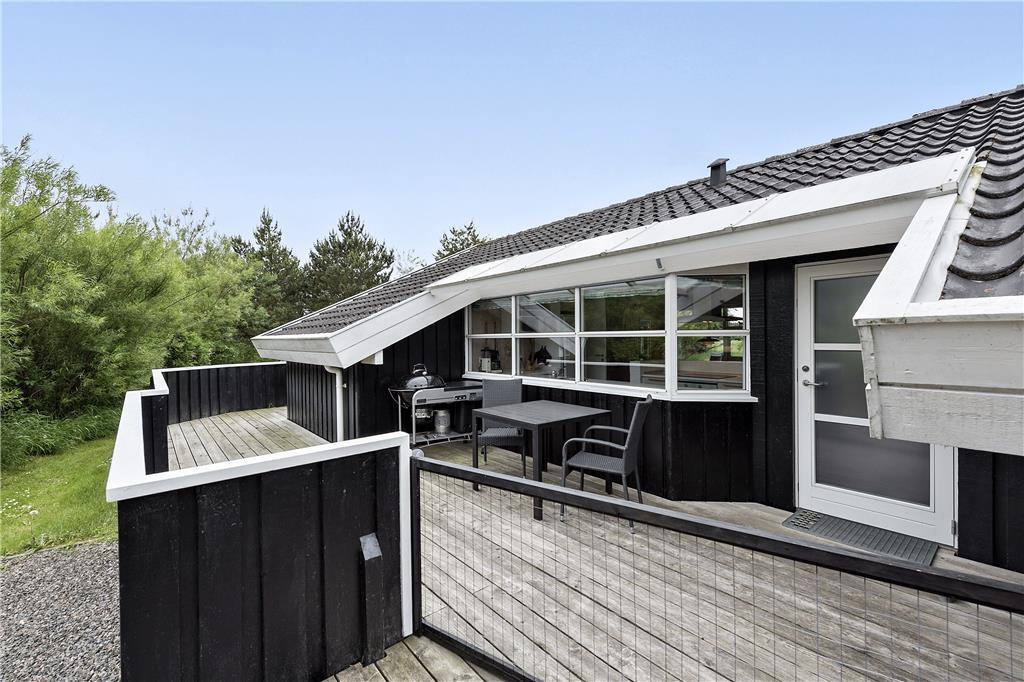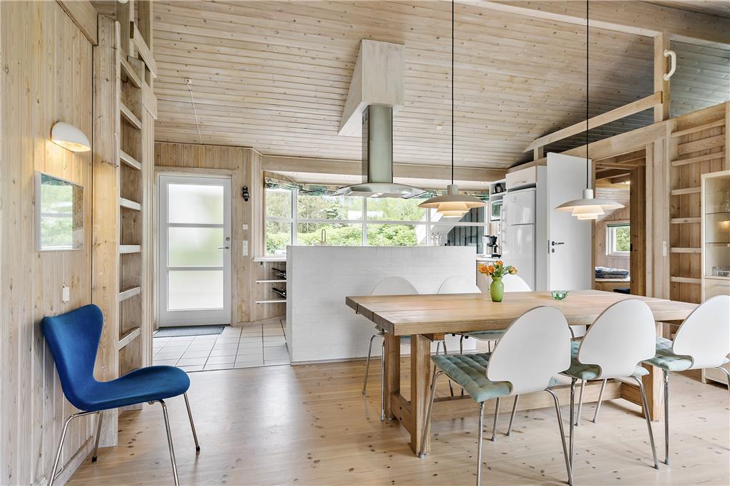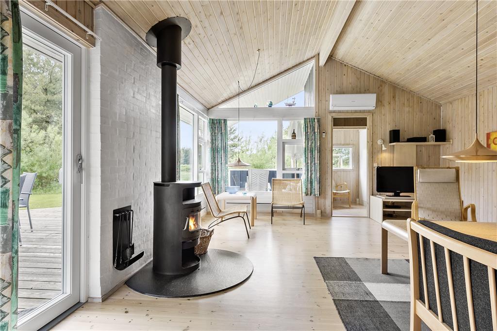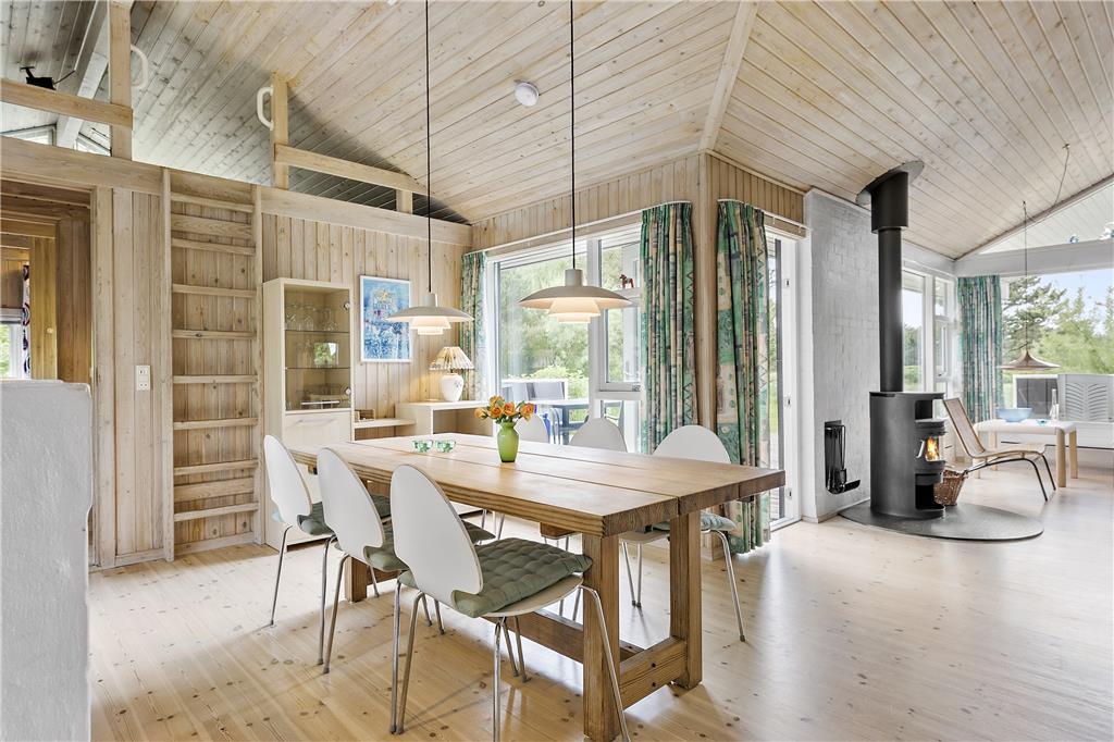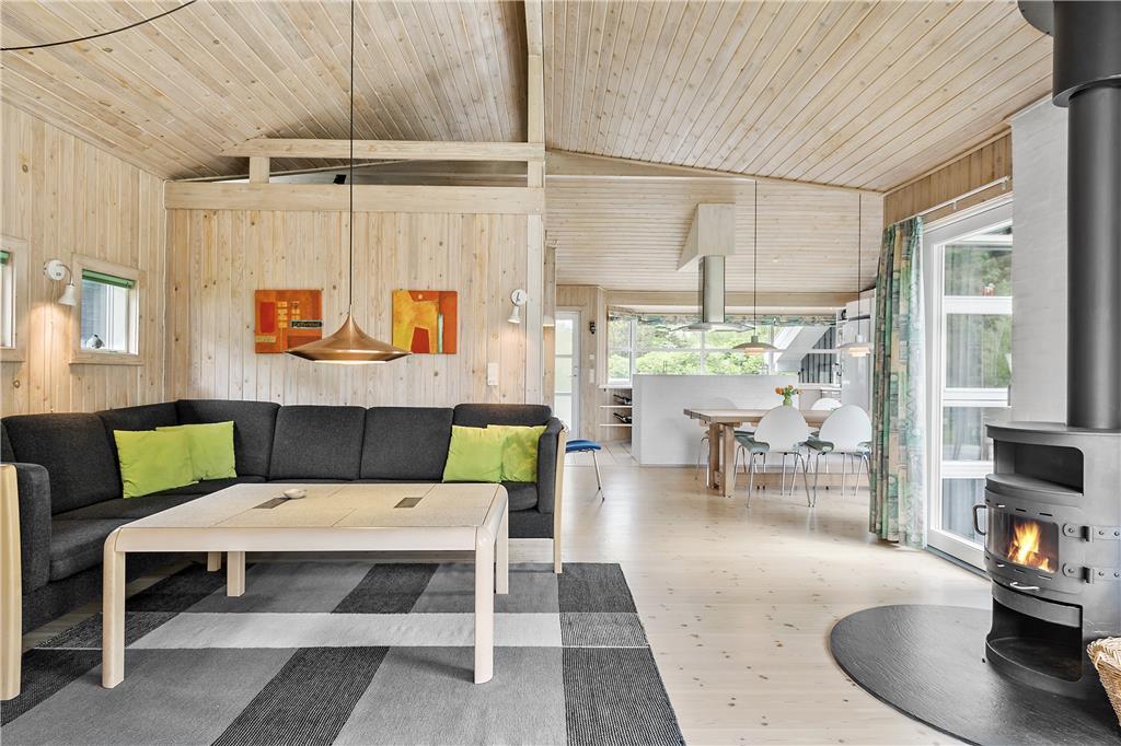 I dette rummelige og smagfuldt indrettede sommerhus er de fire soveværelser fordelt, så huset er velegnet til to vennepar såvel som to familier. Huset byder på to badeværelser, hvoraf det ene råder over spabad og sauna, og et dejligt stort køkken, som er adskilt fra spiseafdelingen ved en halvmur. Vil man nyde morgenmaden i det fri, vil terrassen udenfor køkkenet være et perfekt sted. Fra køkkenafdelingen går man ind i den bagvedliggende stue med brændeovn. Stuen er rummelig og lys, og herfra har man adgang til den flotte træterrasse med udsigt over et stort fredet naturareal.
